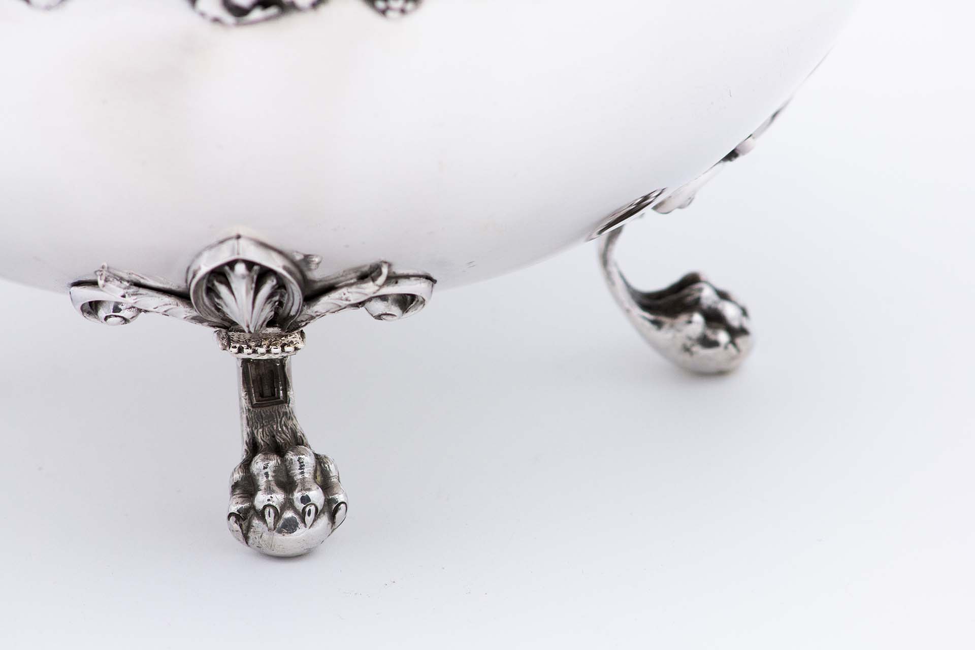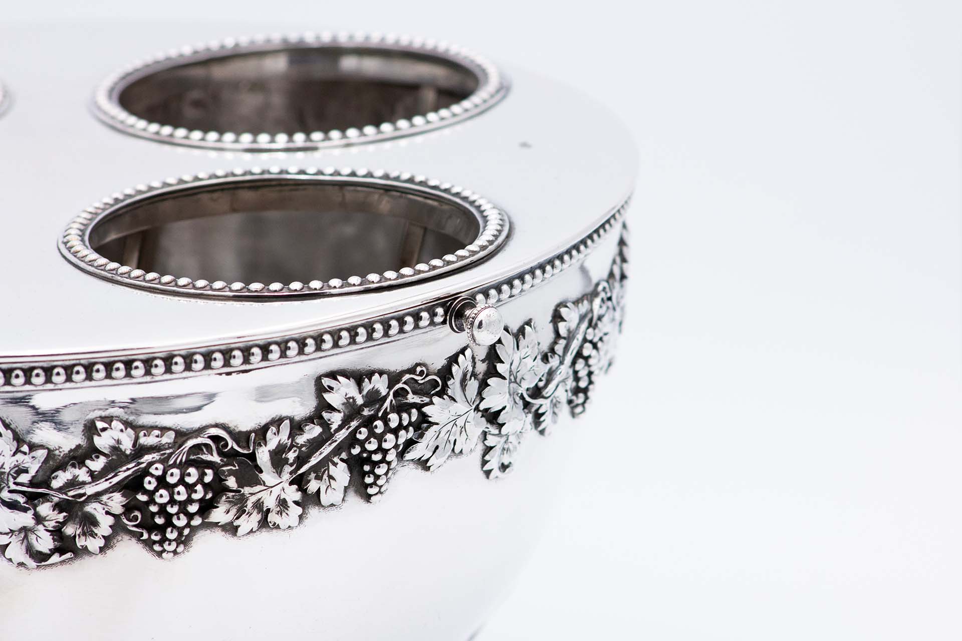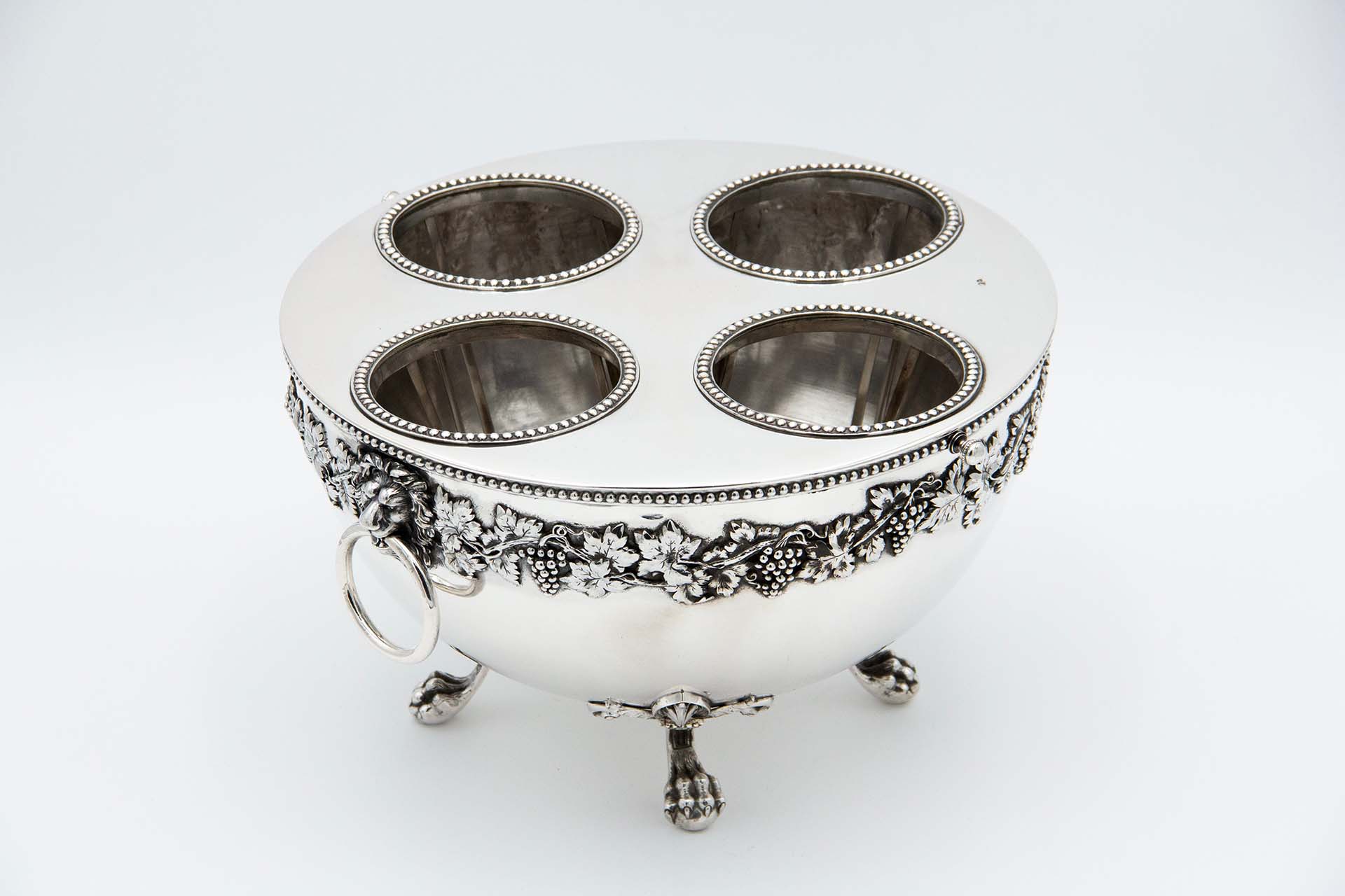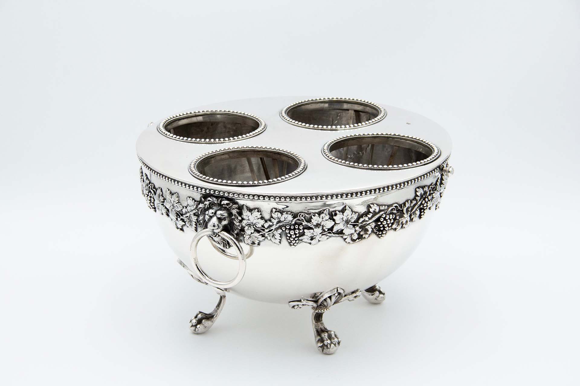 • Descrição: Refrescador em prata com capacidade para quatro garrafas, divisórias com frisos perlados, relevada com cachos de uvas e parras, pegas circulares e assente em quatro pés em forma de garras.