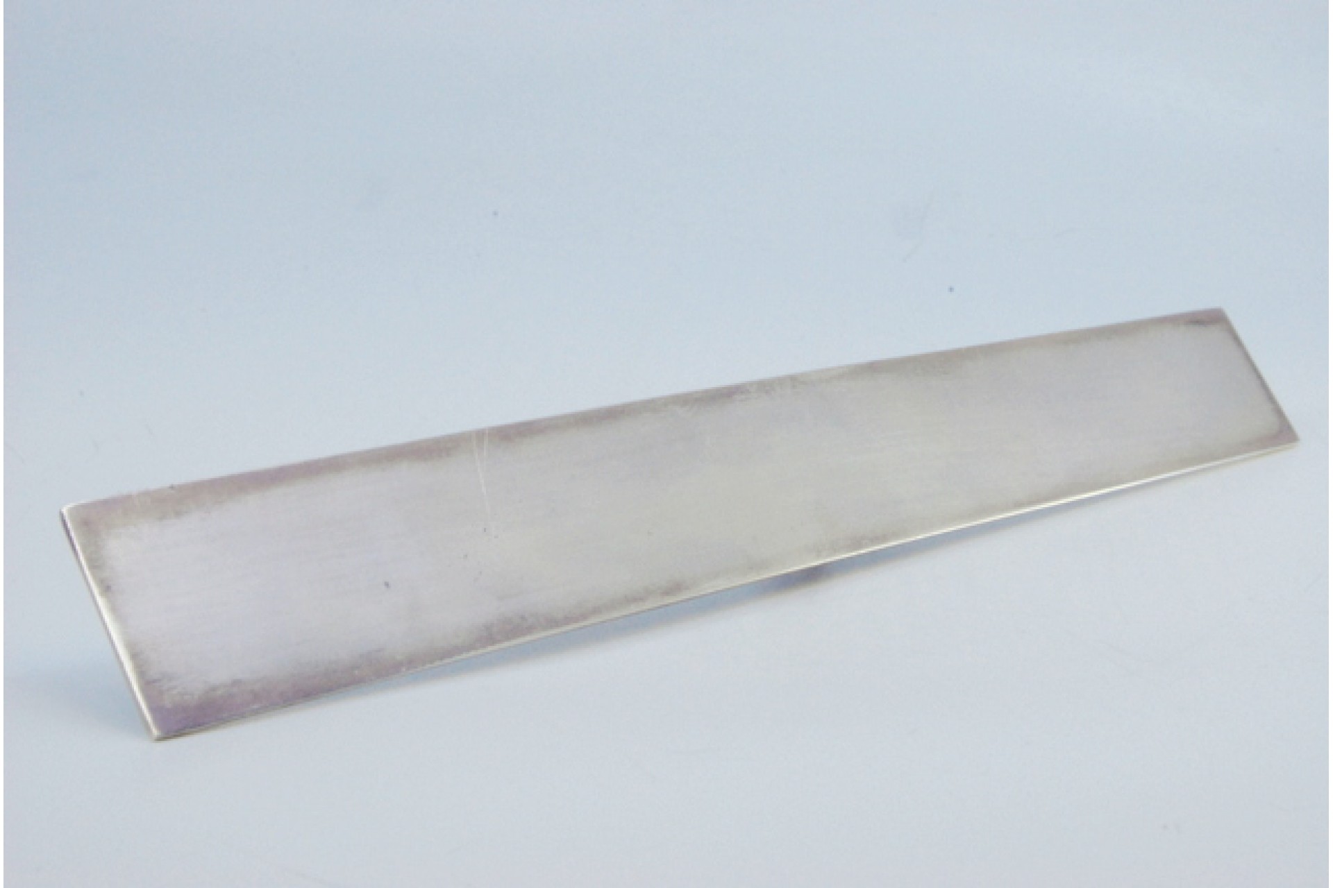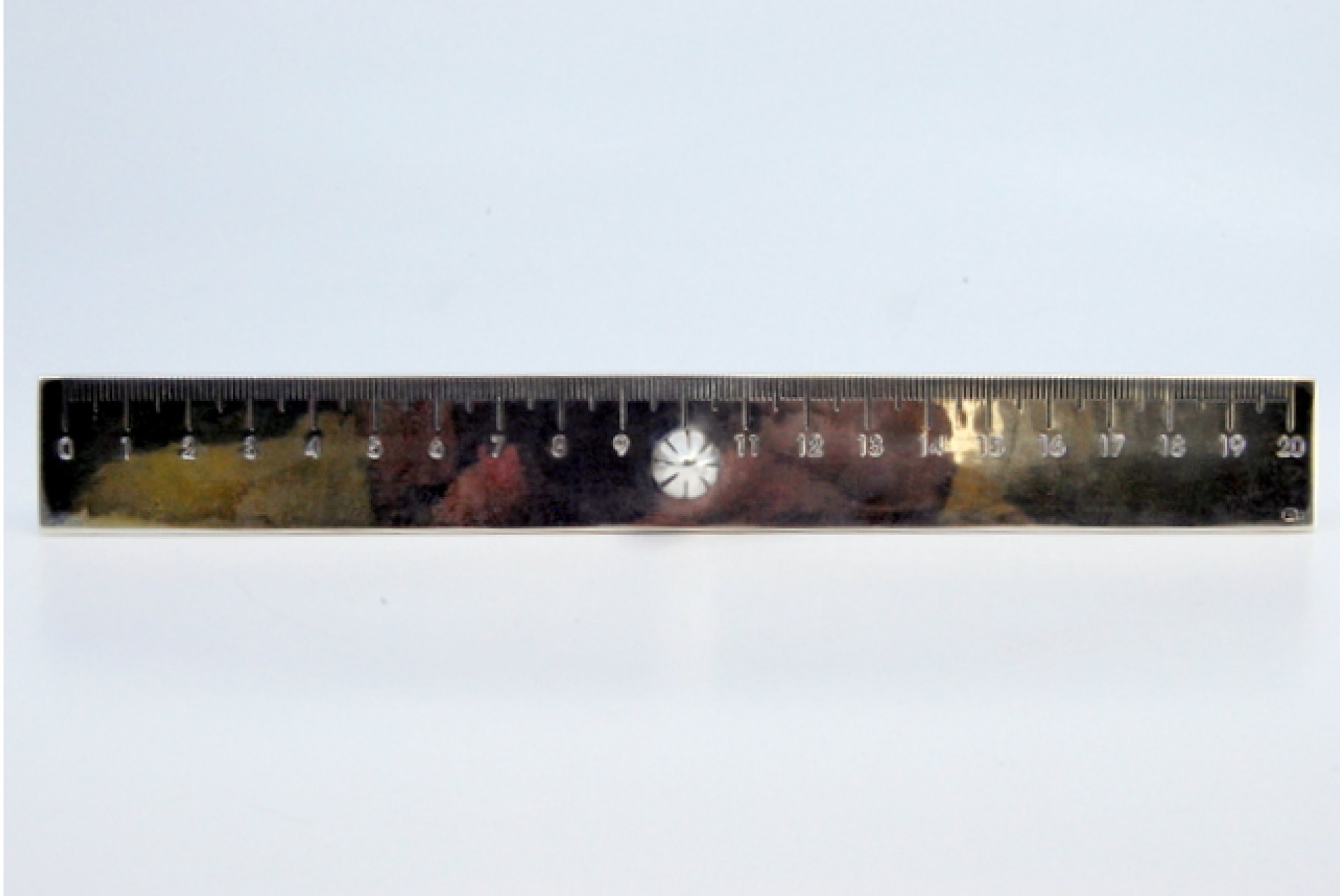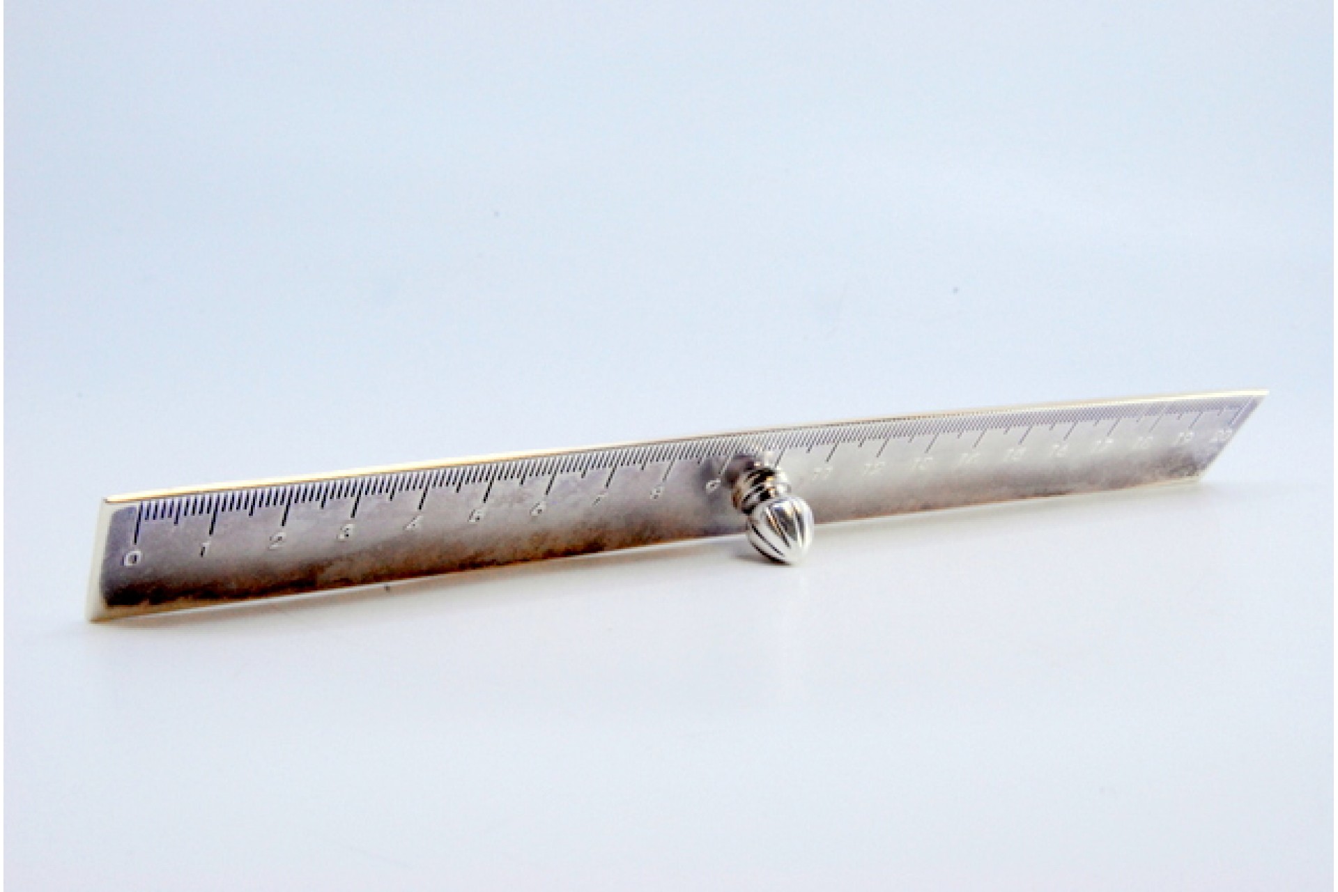Régua de escala em prata de vinte centímetros com pomo ao centro.