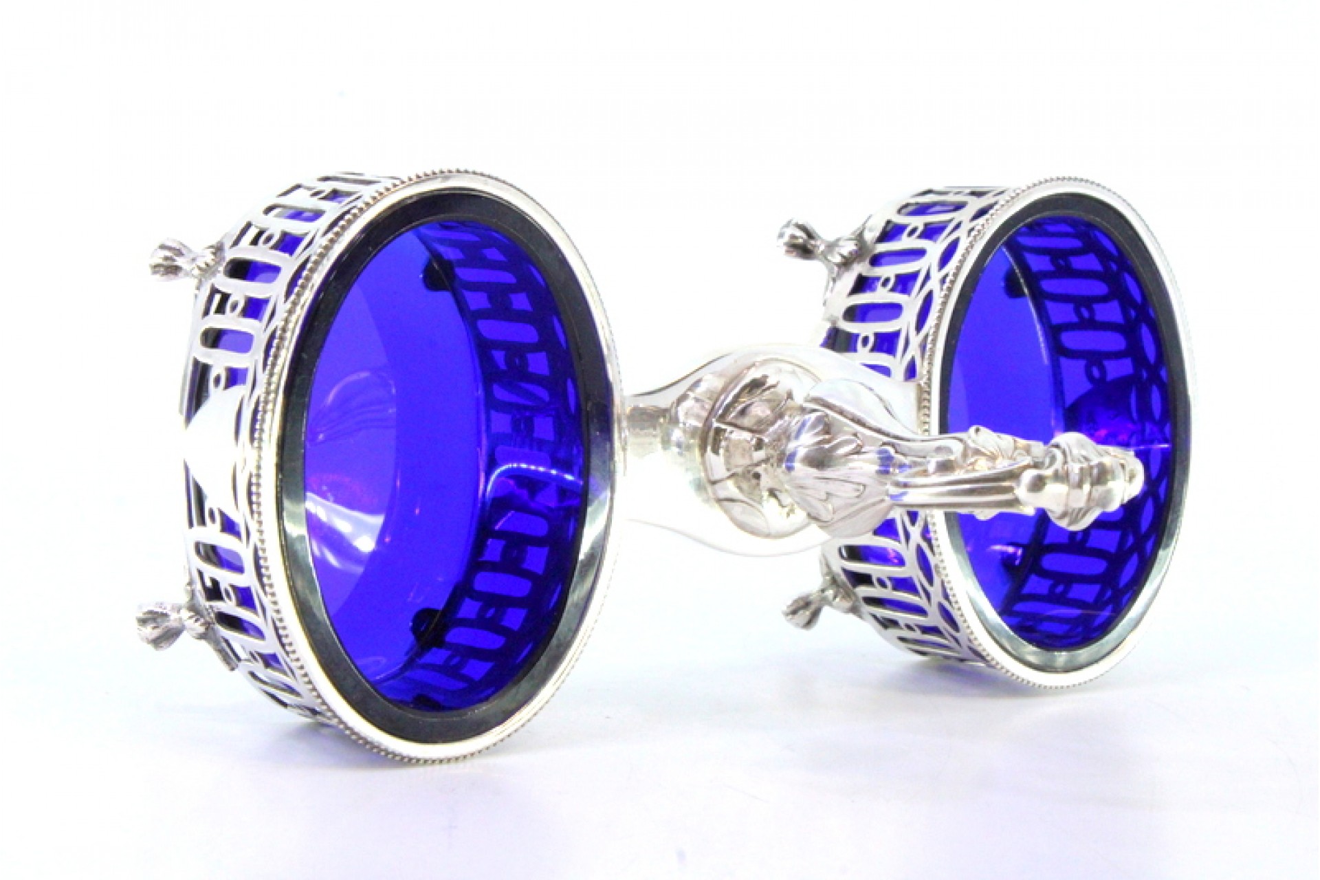 • Descrição: Saleiro e pimenteiro em prata com depósitos em vidro azul e estrutura recortada com pés em forma de garras.