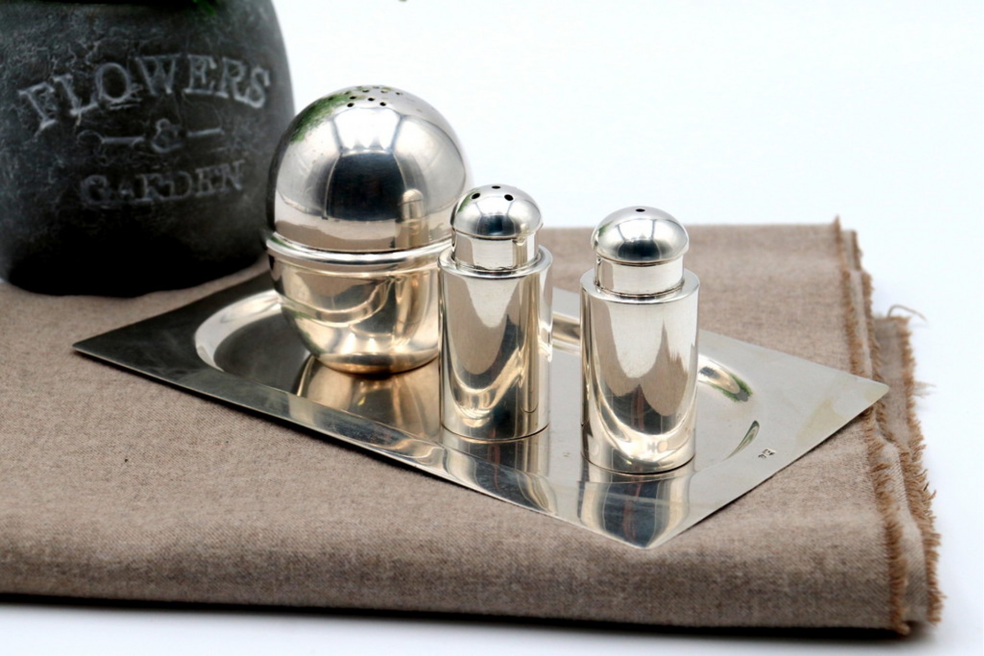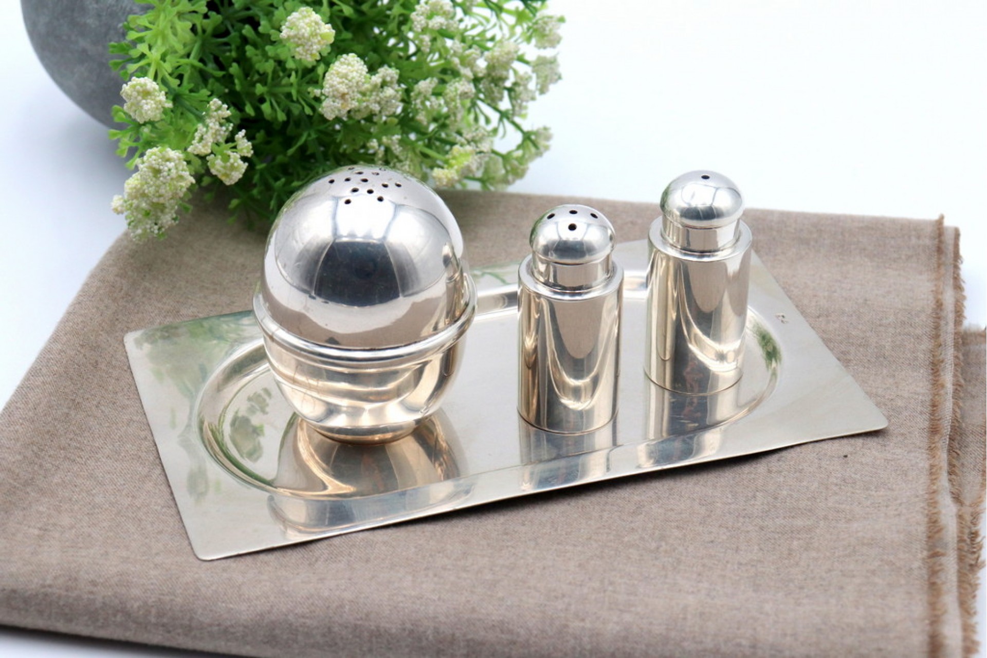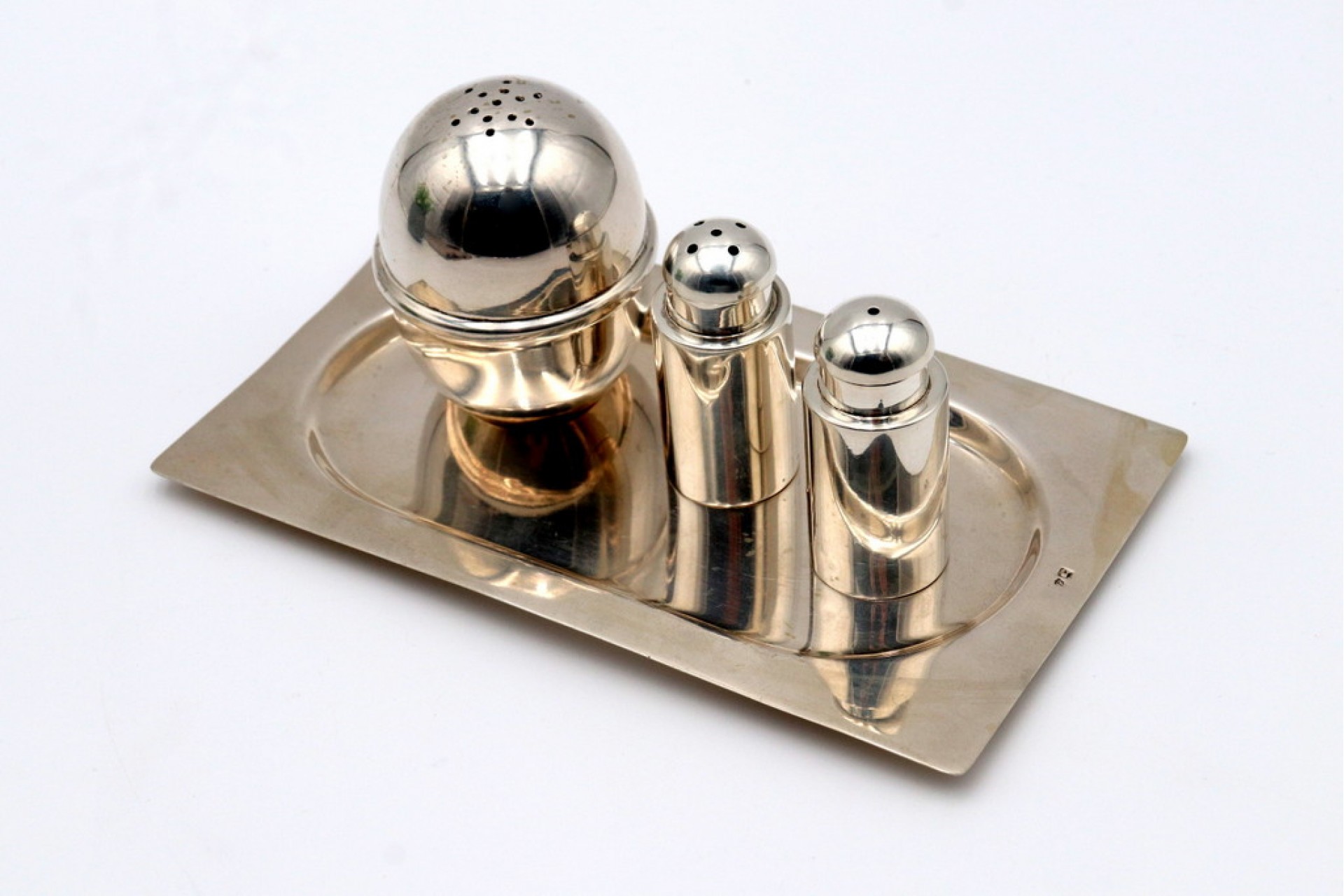 • Descrição: Saleiro, pimenteiro e açucareiro em prata lisa com bandeja retangular.