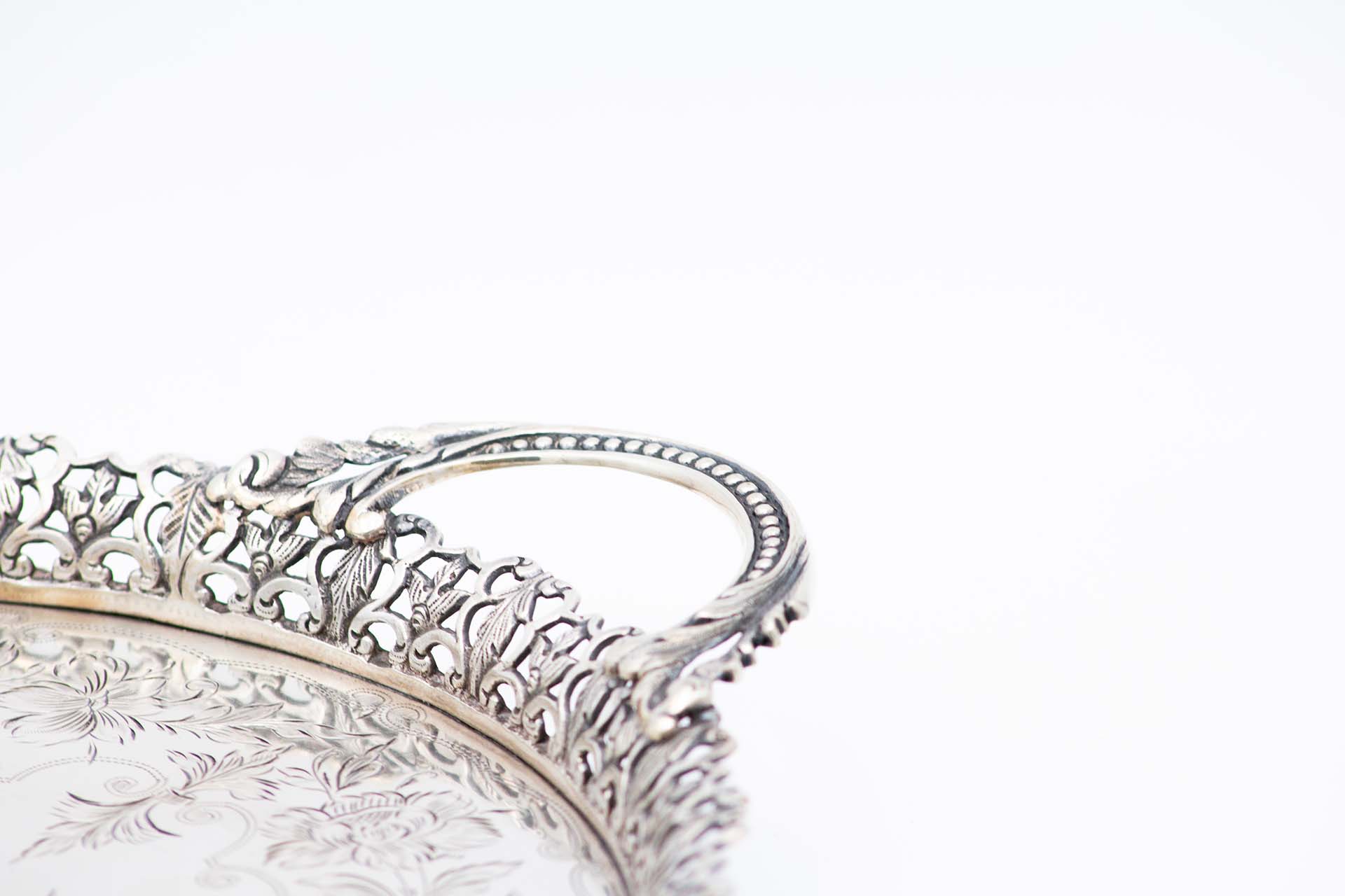 • Descrição: Salva bilheteira em prata de forma elíptica com gradinha e motivos vegetalistas gravados com quatro pés de suporte relevados.