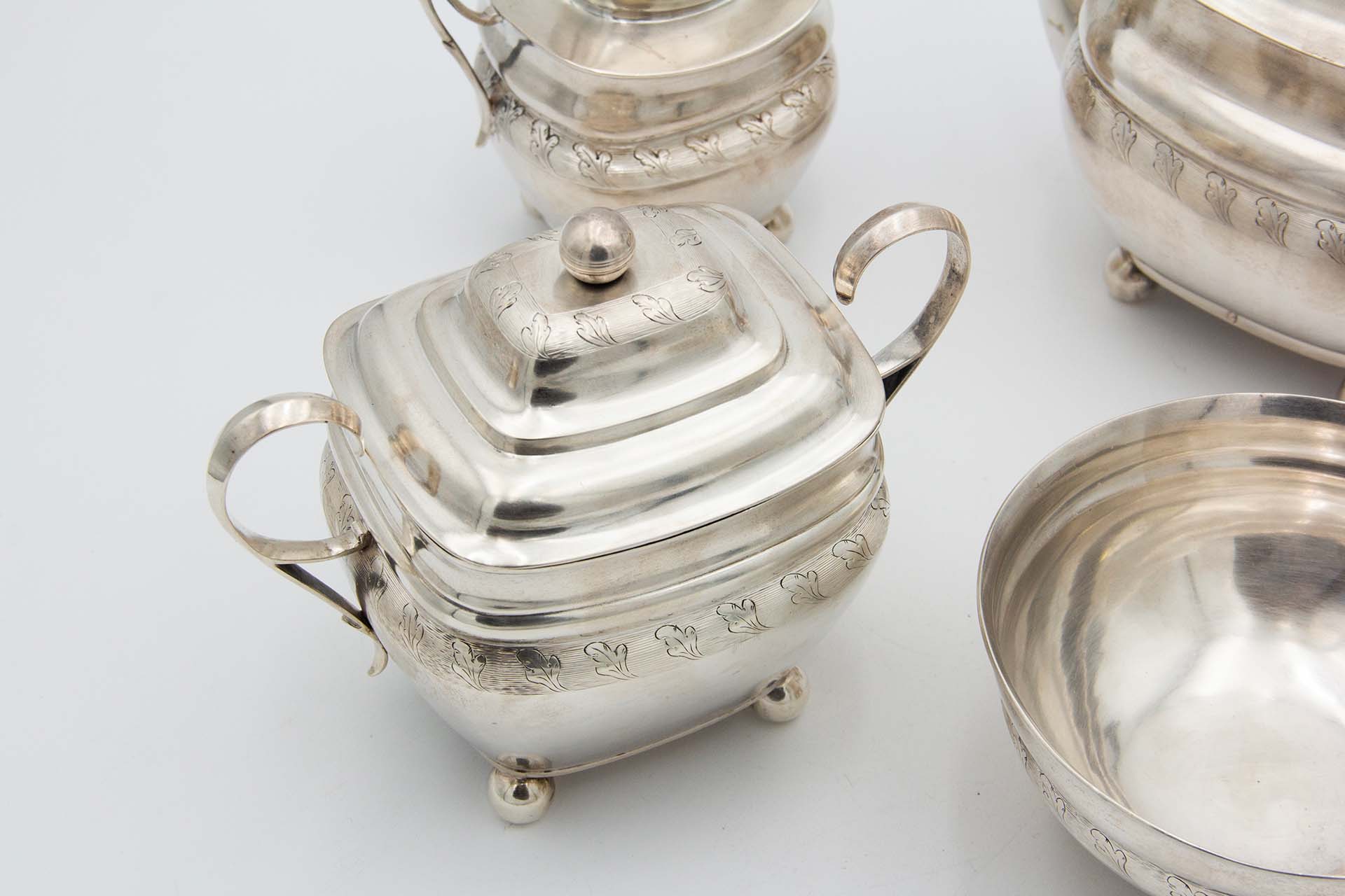• Descrição: Serviço de chá em prata constituído por cafeteira, bule, açucareiro e taça de pingos, com gravados, tampas amovíveis, cabo em madeira de castanho e pés em formato esférico.