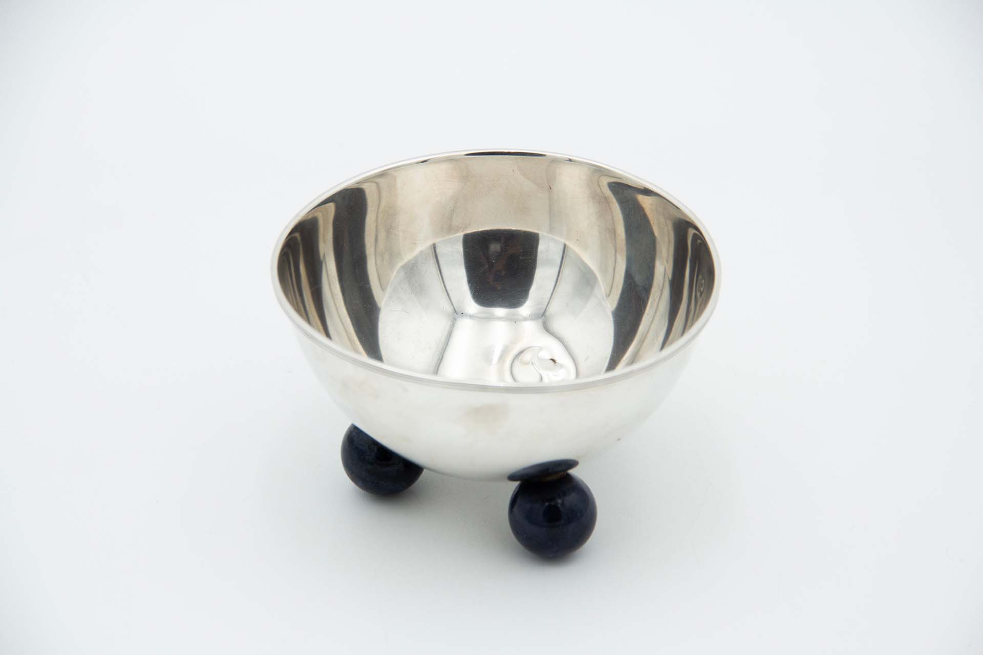 • Descrição: Taça de prata lisa com três pés esféricos de madeira.