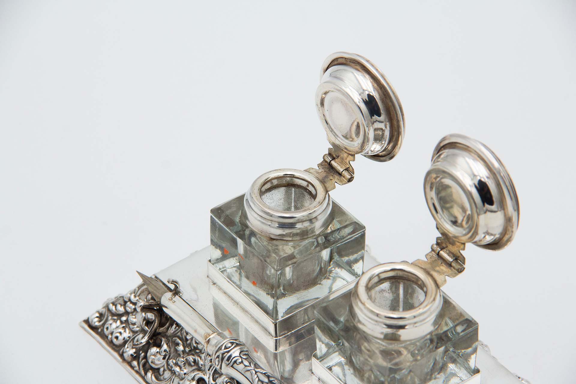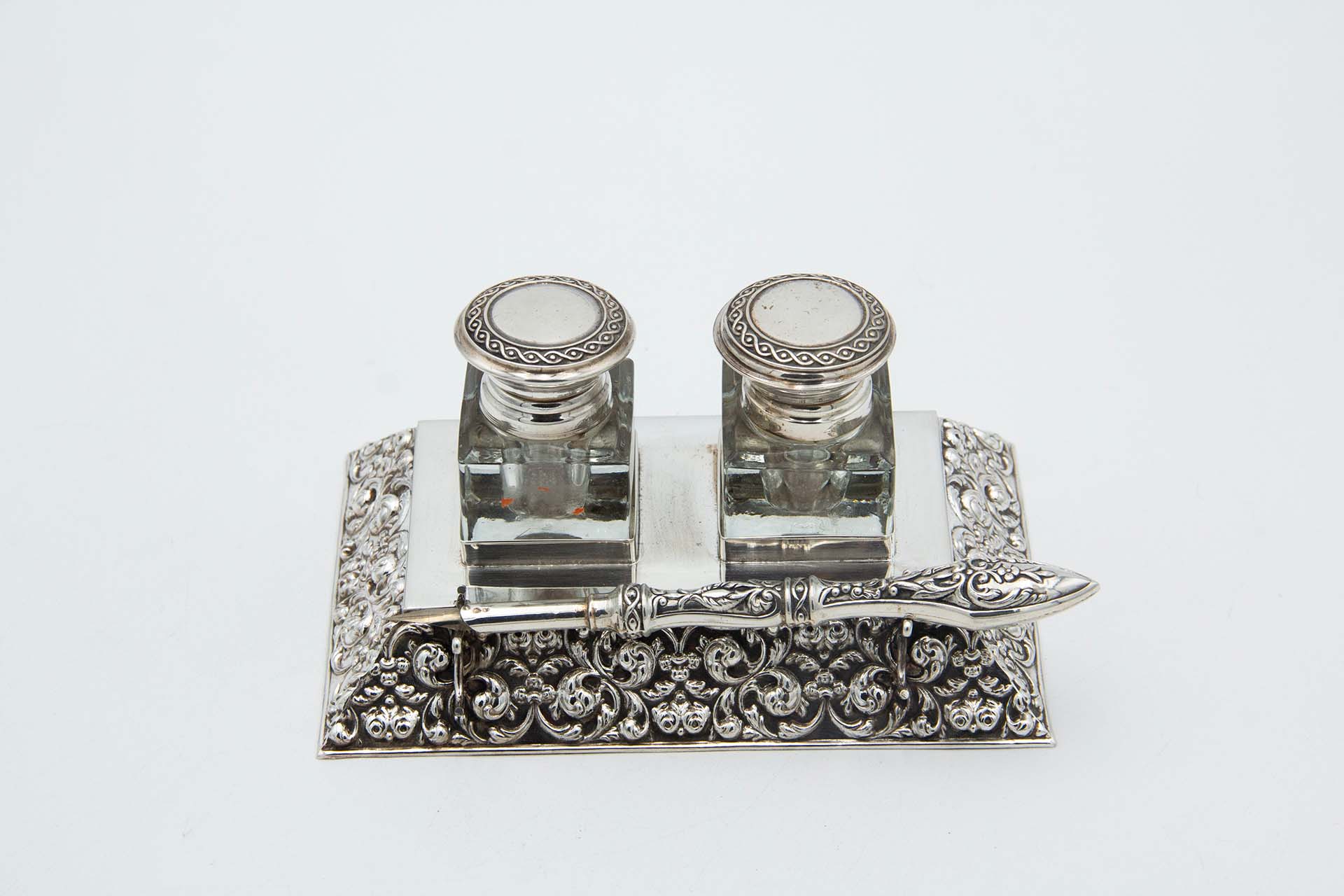 • Descrição: Tinteiro de prata relevada com caneta de aparo e depósitos de vidro com tampas frisadas.