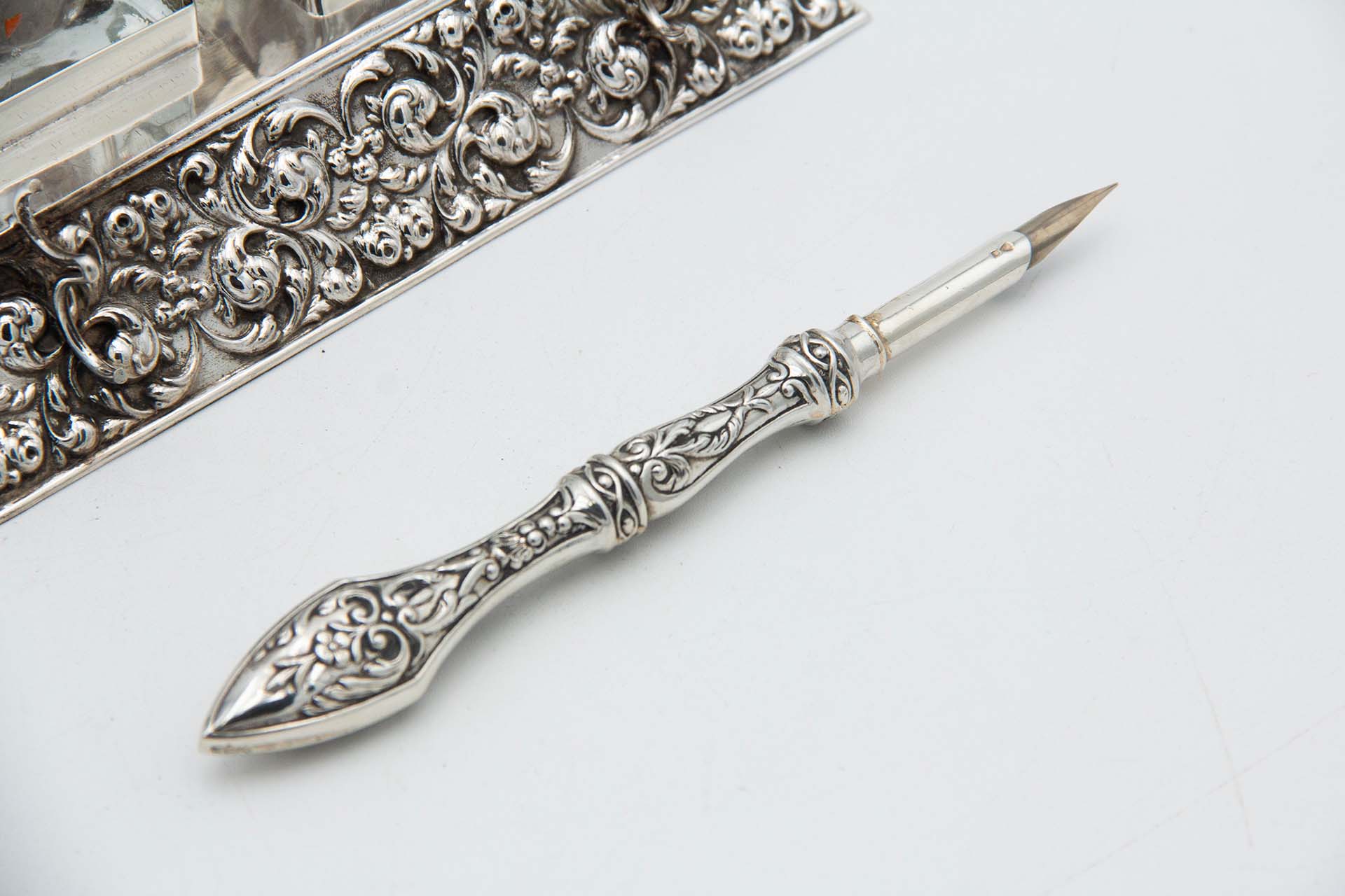 Tinteiro de prata relevada com caneta de aparo