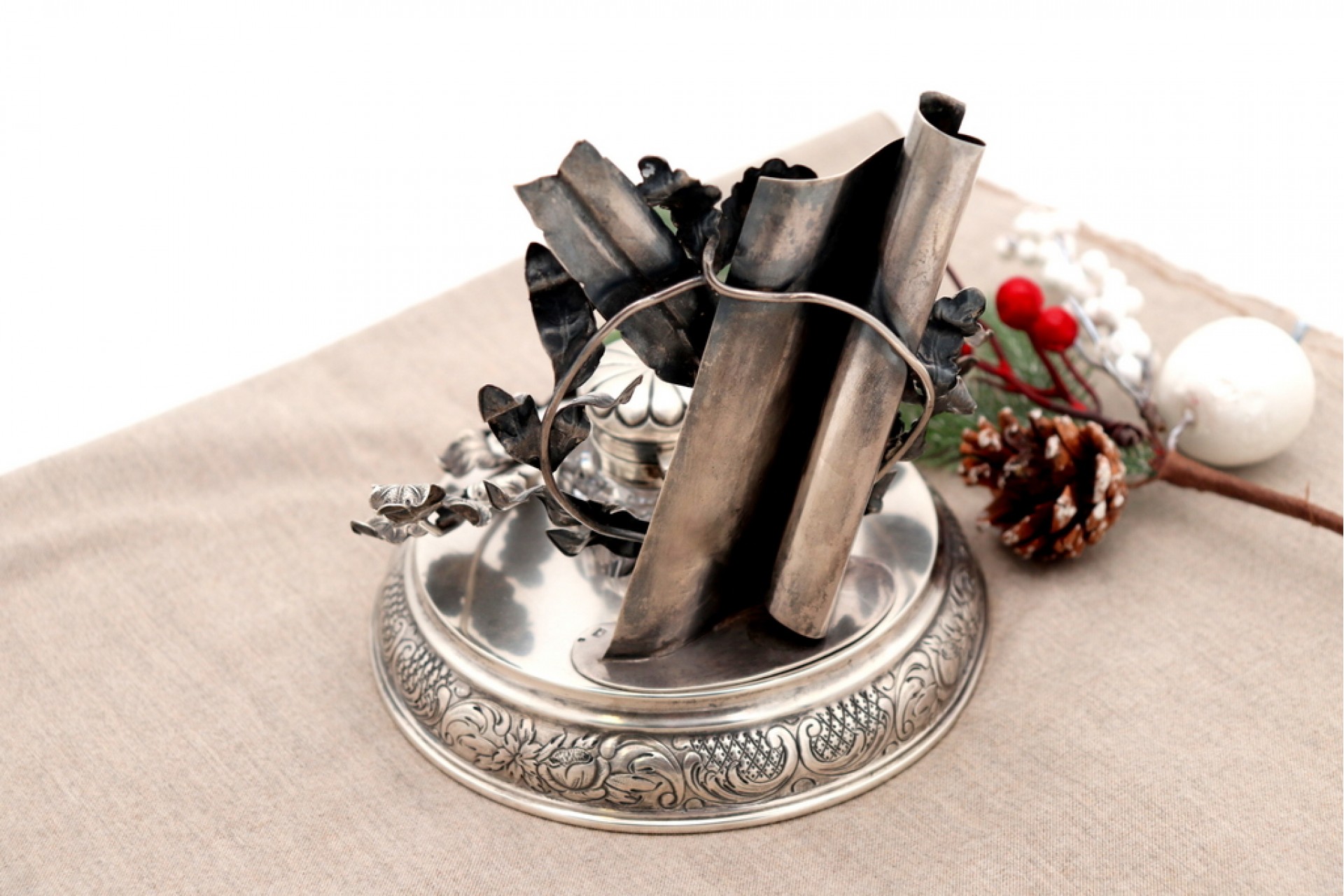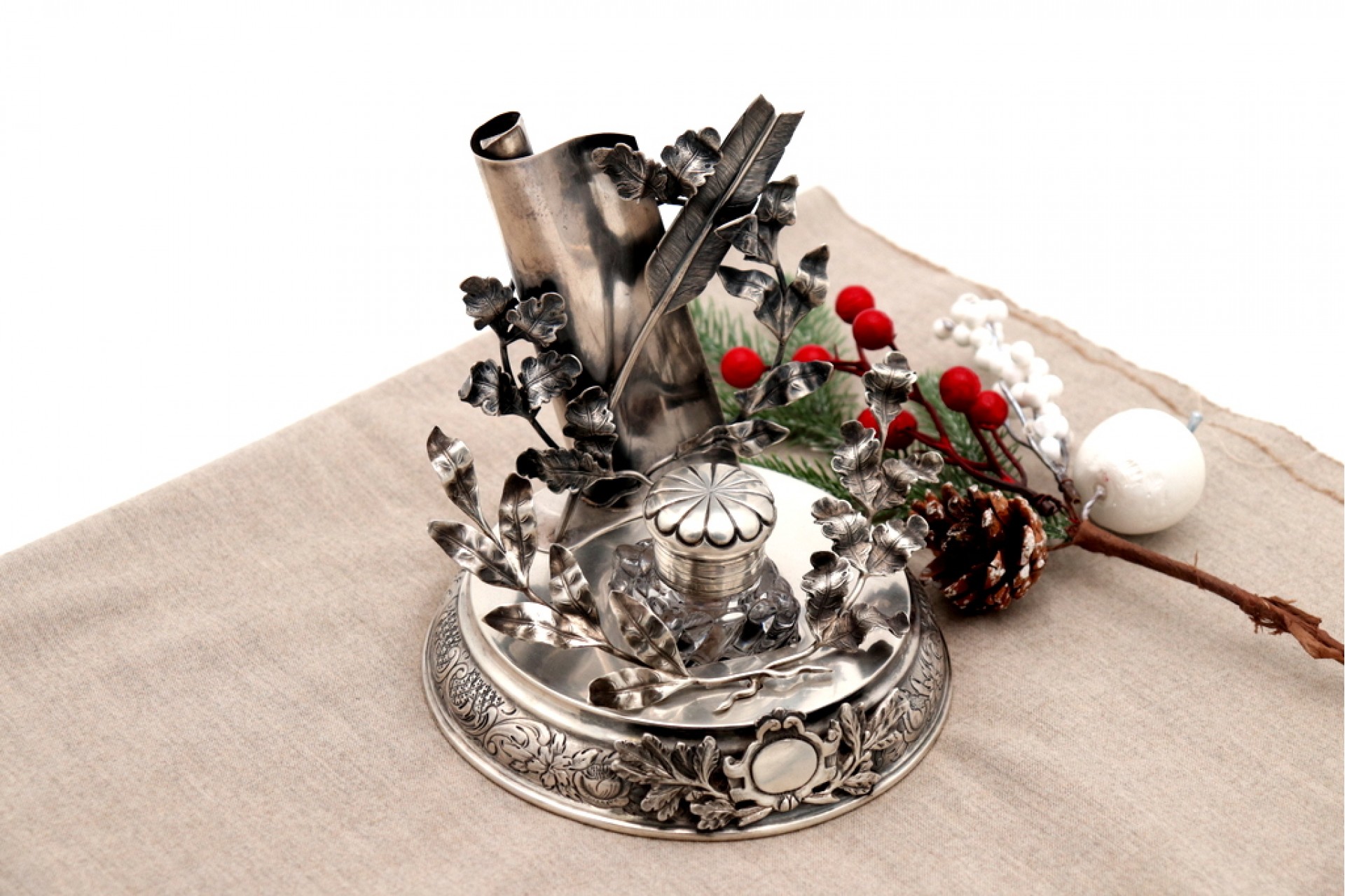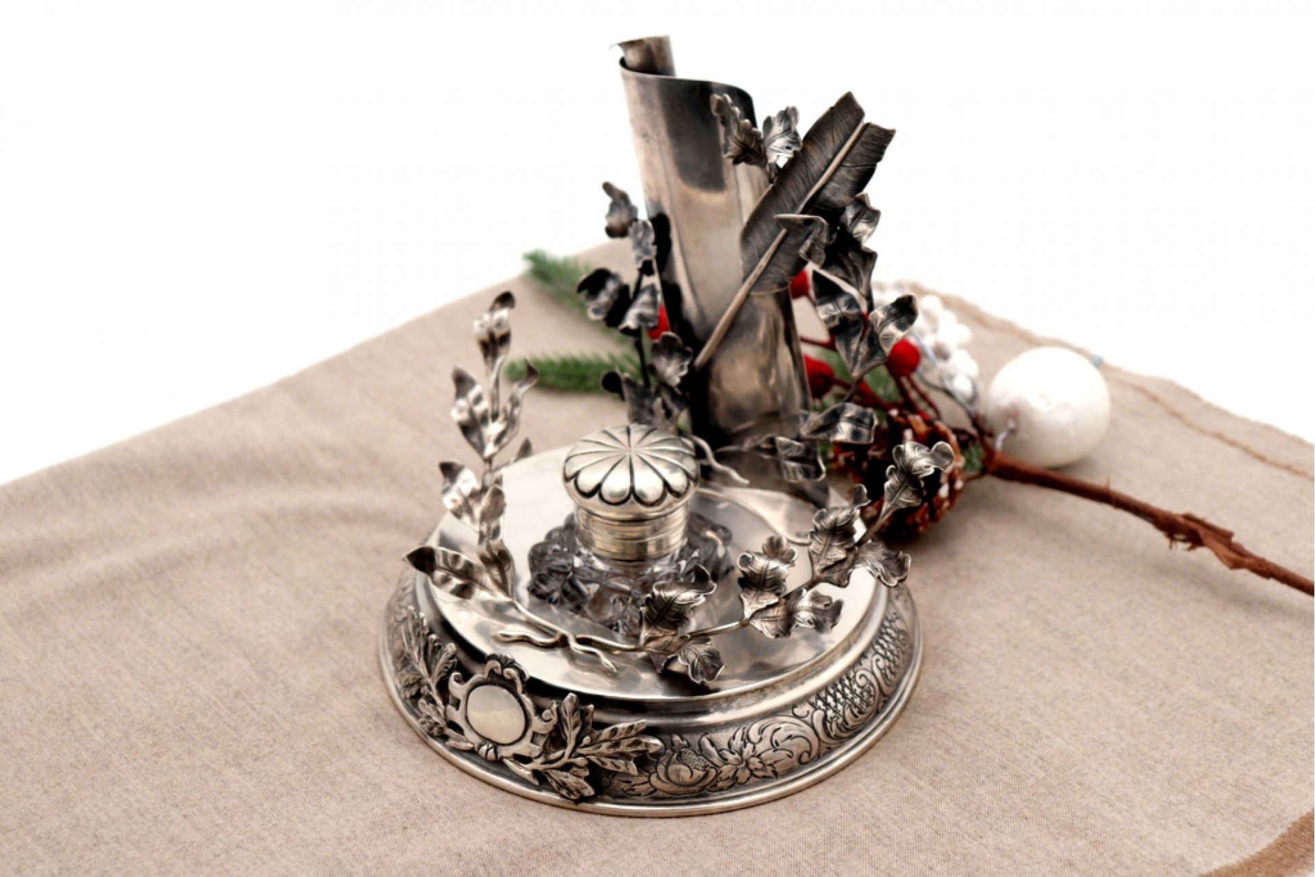 • Descrição: Tinteiro em prata com porta pena, ramos em vulto perfeito, frisos gravados na envolvência com cartela para monograma e tinteiro em vidro lapidado com tampa basculante.