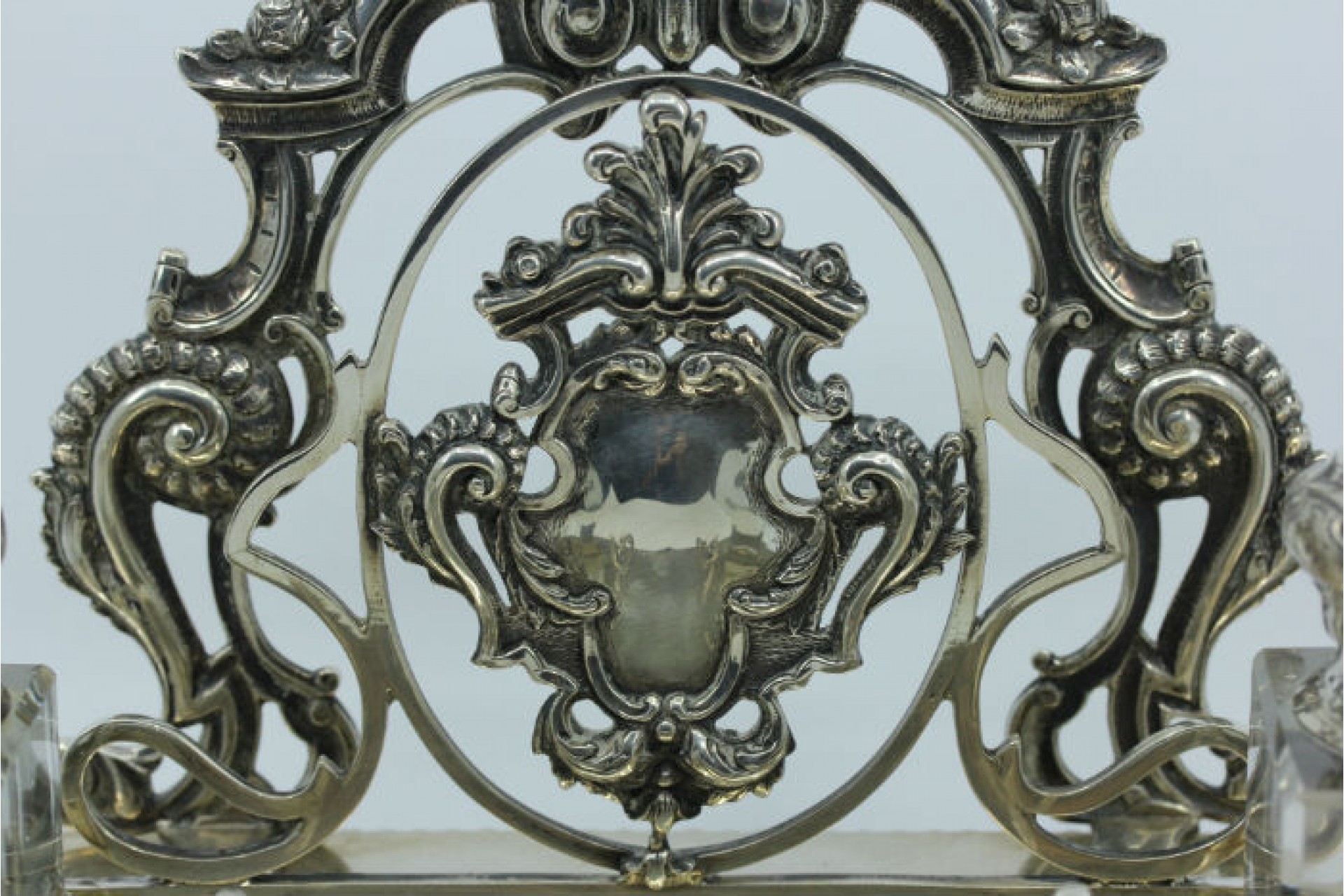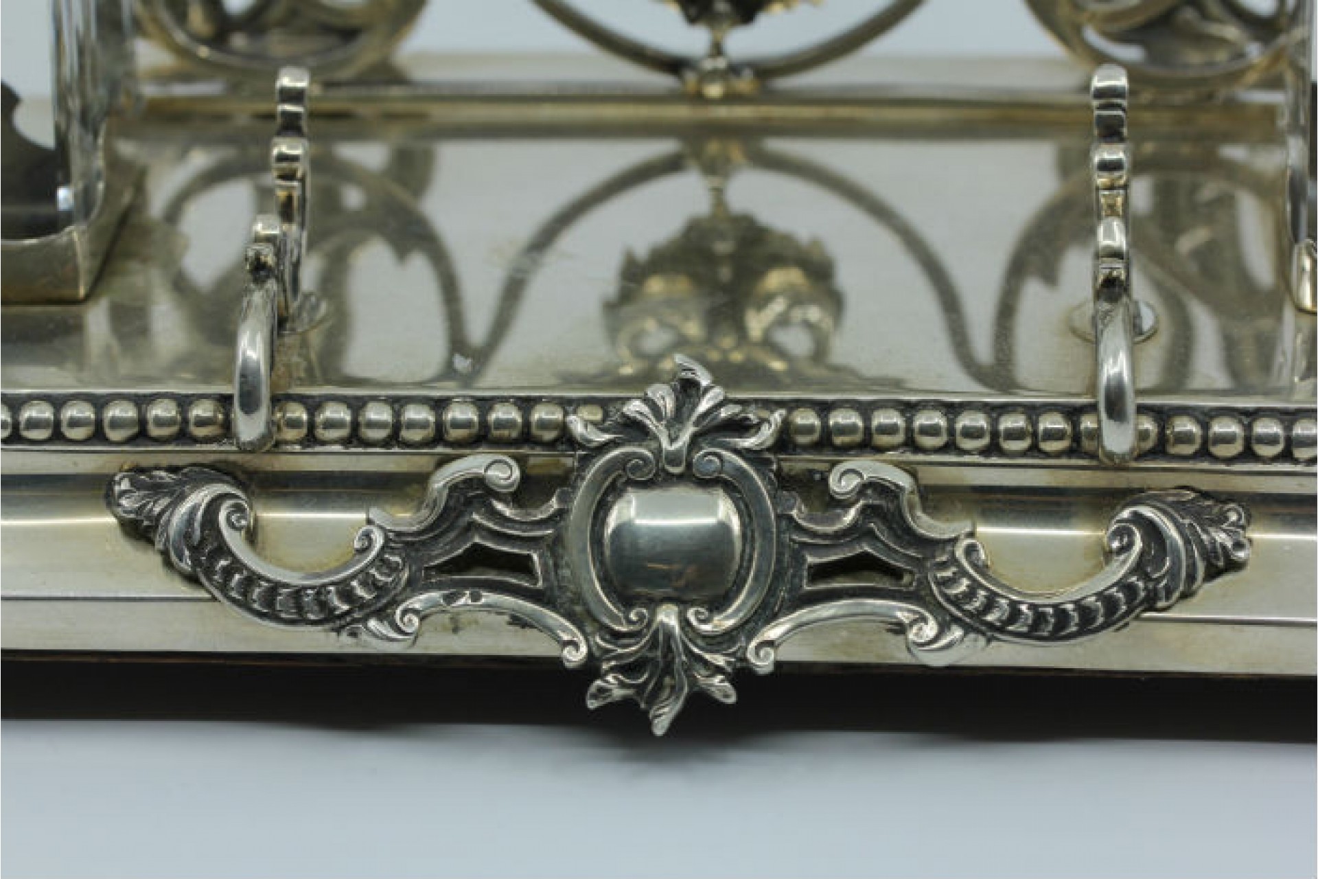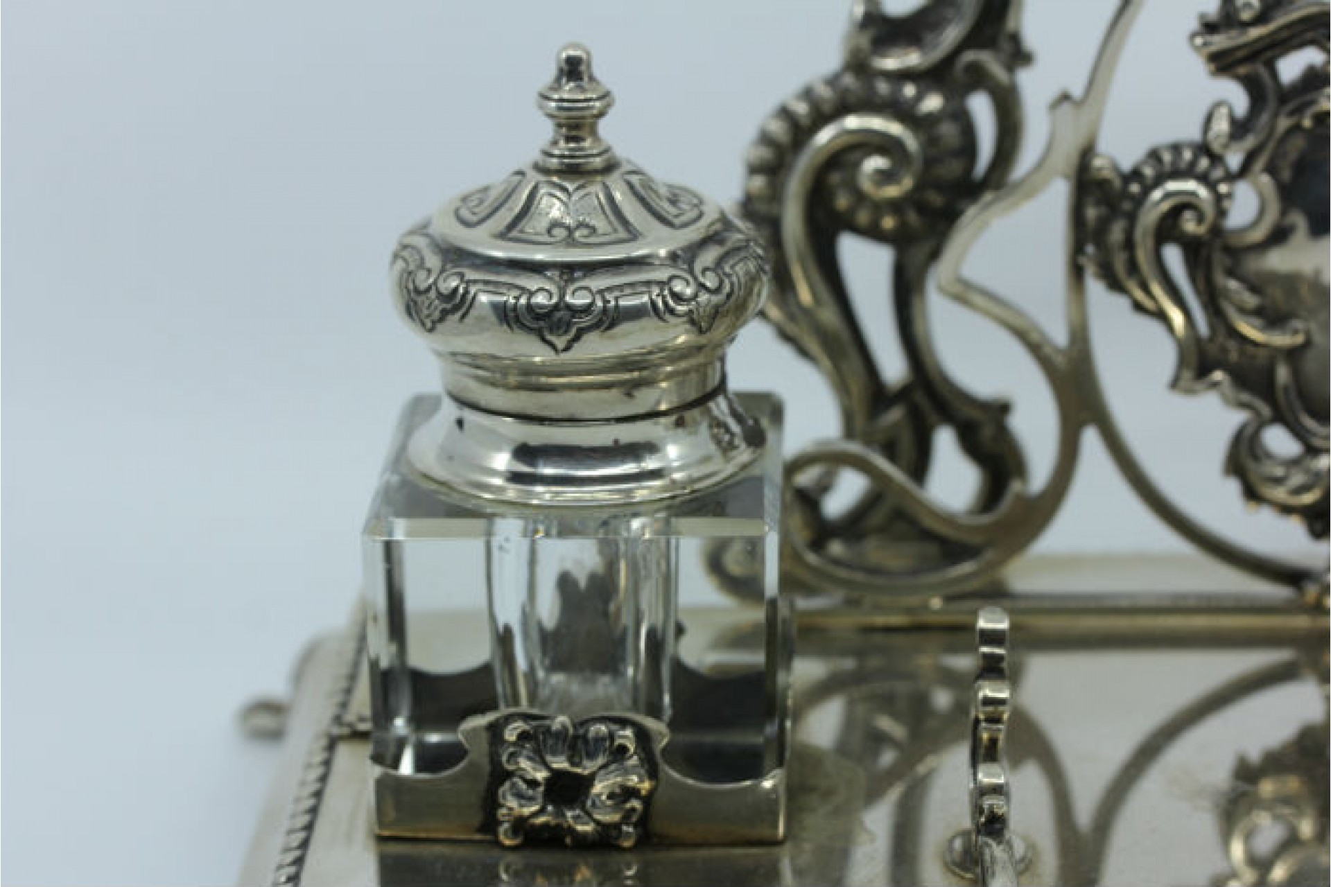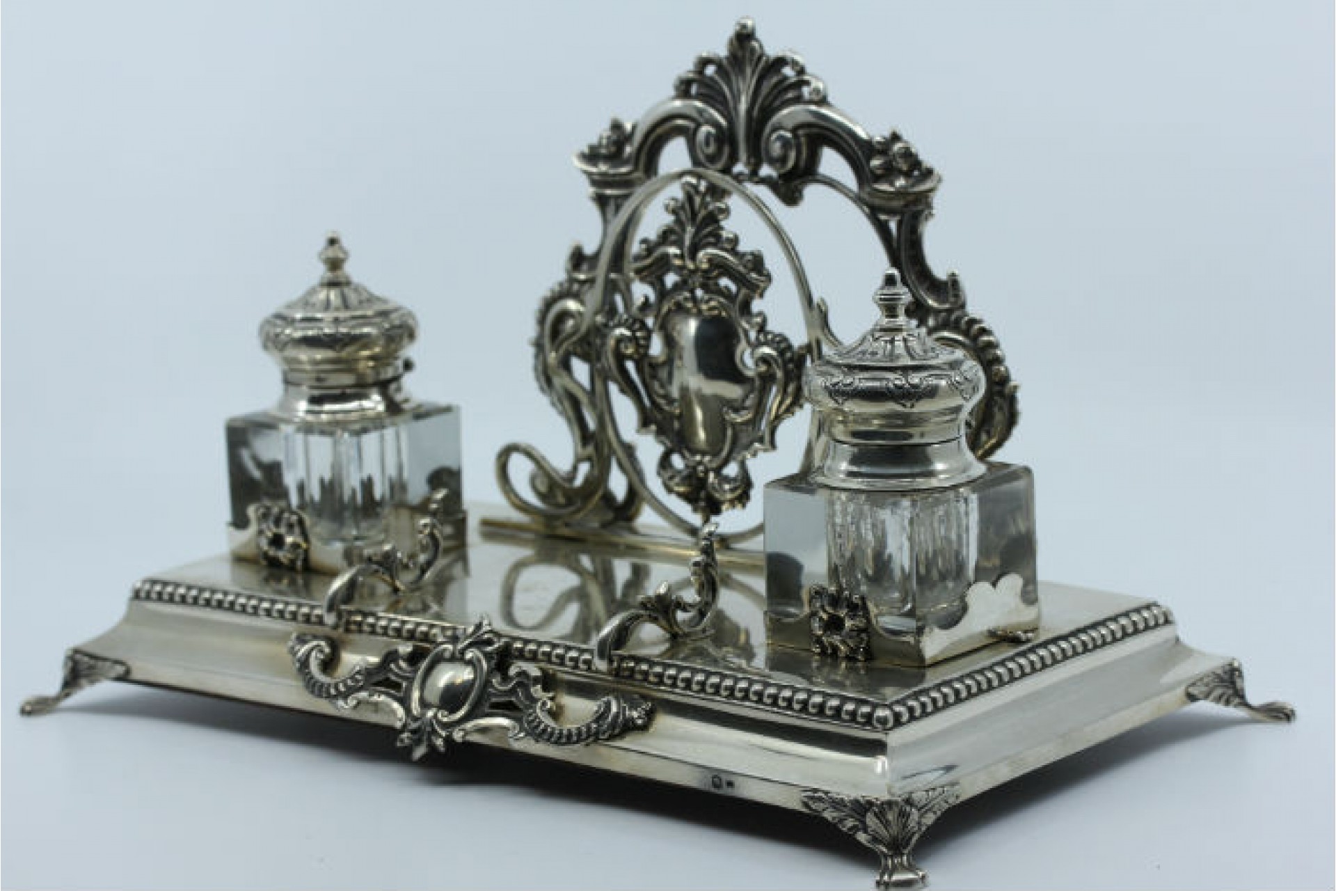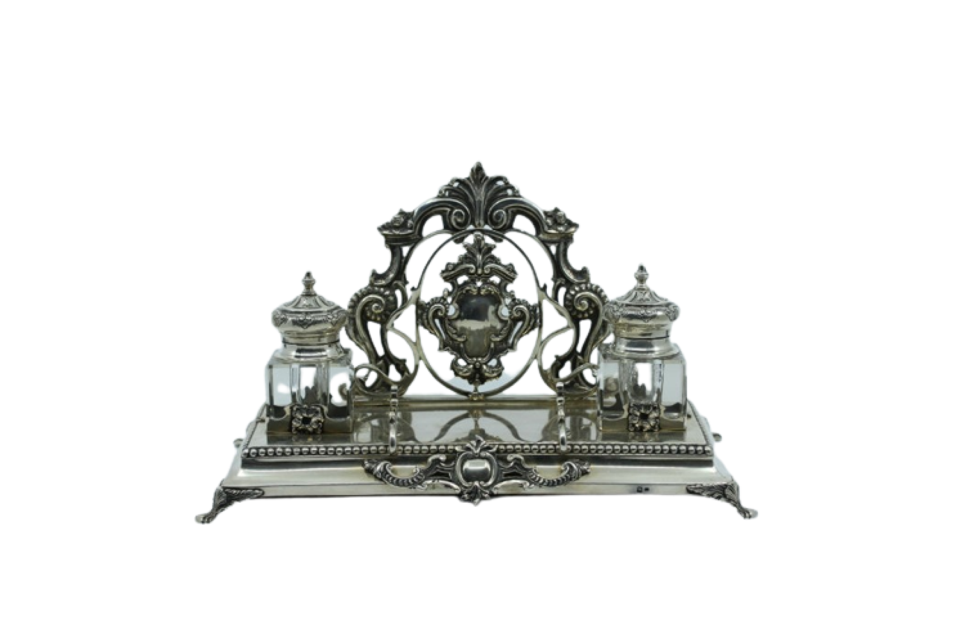 • Descrição: Tinteiro em prata com dois depósitos em vidro e porta cartas assentes em base com friso perlado e cartela para monograma.