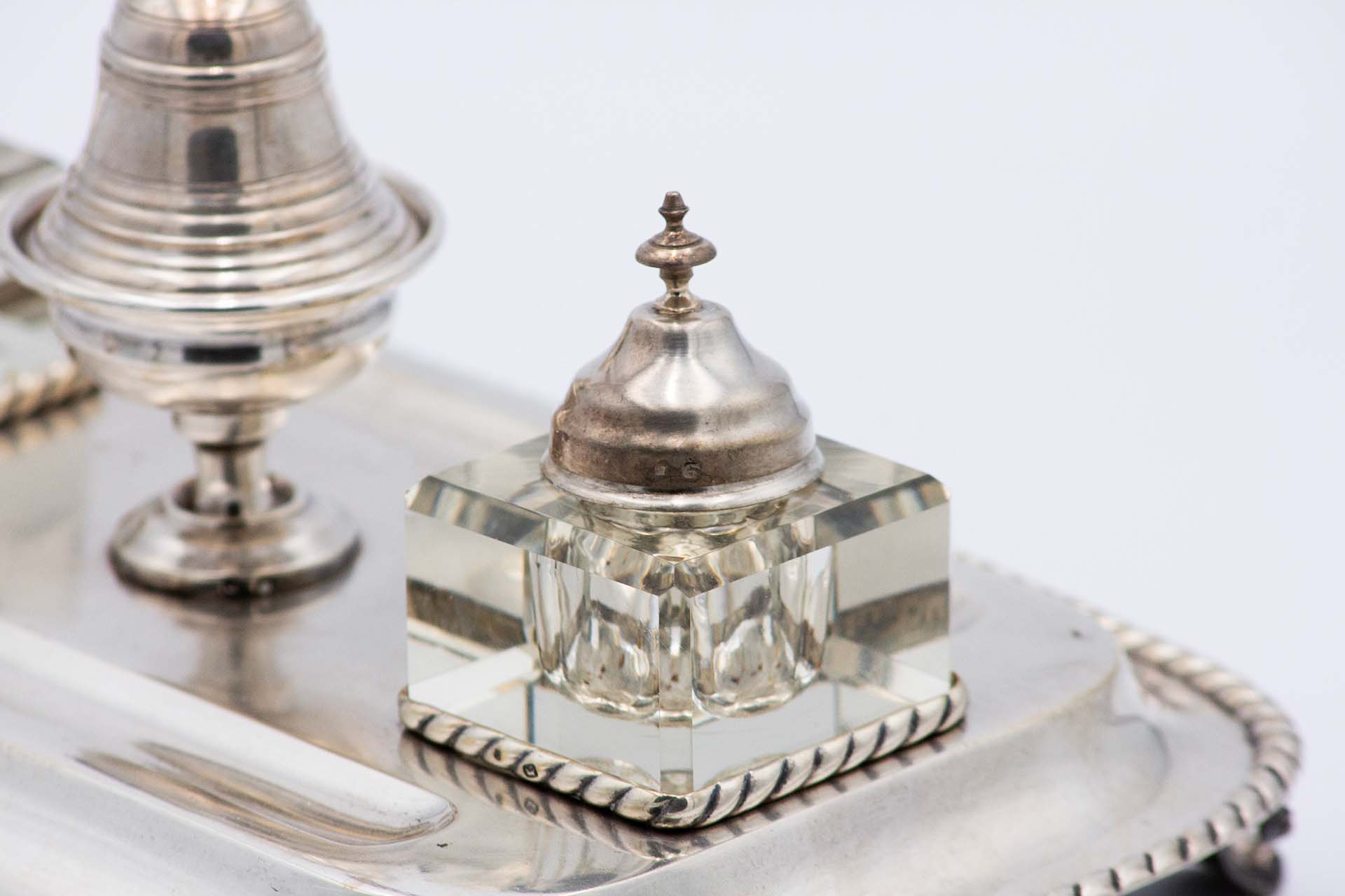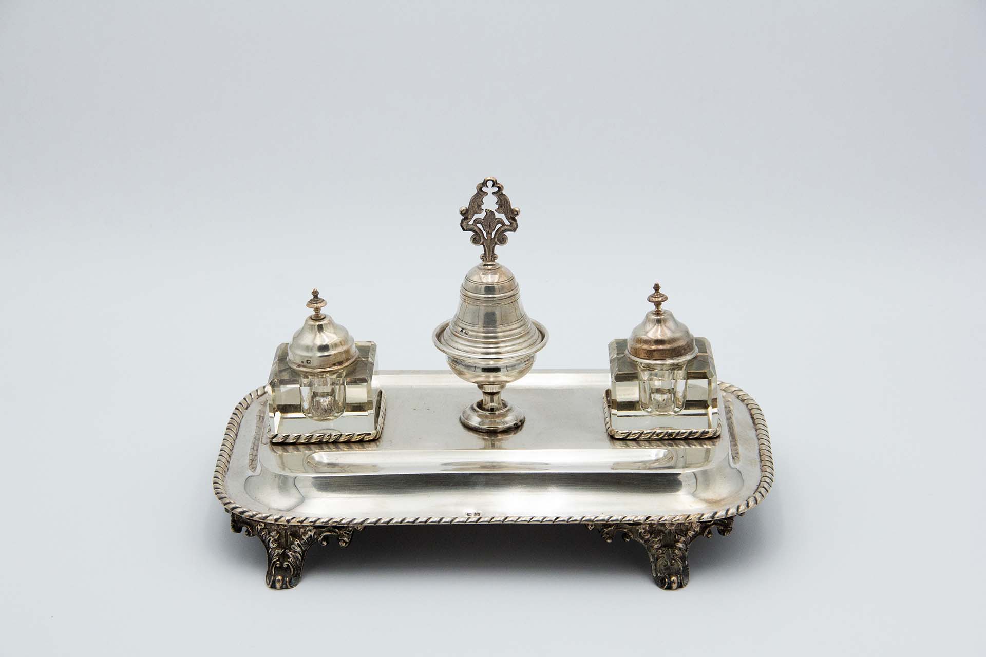 • Descrição: Tinteiro de prata com dois depósitos em vidro lapidado e campainha, porta penas, friso cordeado envolvendo toda a base e quatro pés relevados.