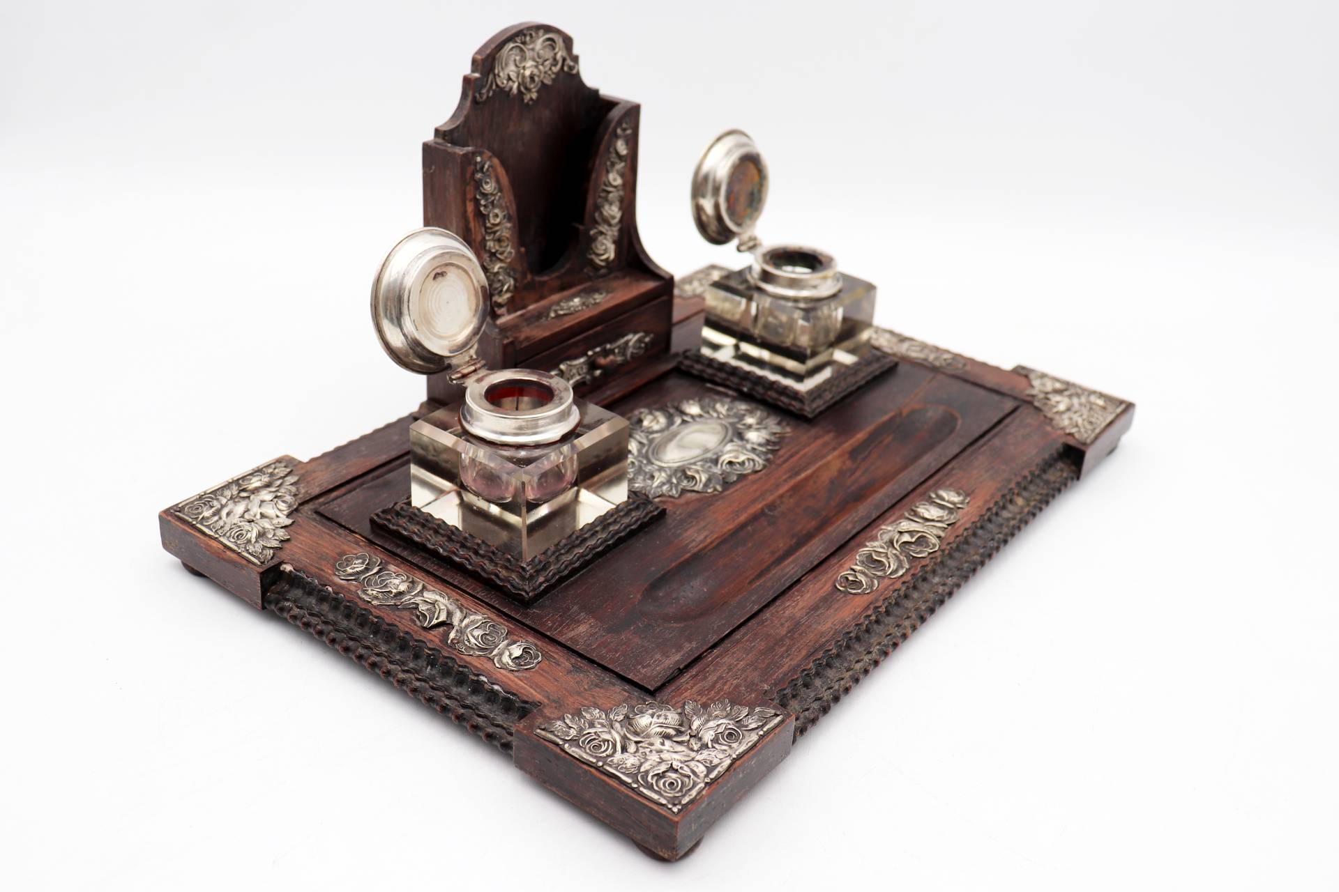 Tinteiro em madeira com tremidos de pau santo e aplicações em prata.