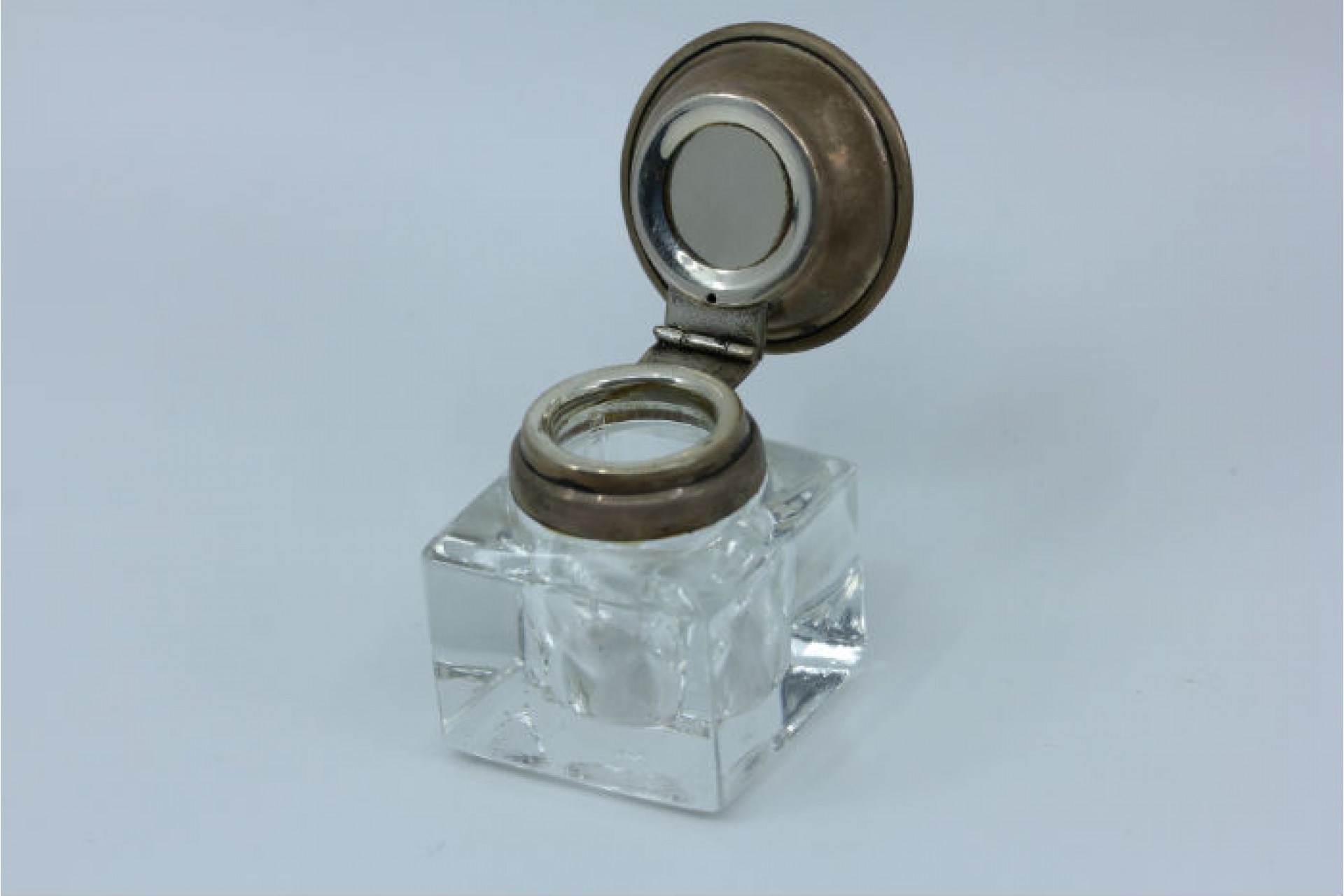 • Descrição: Tinteiro em base em madeira com aplicações em prata, depósito em vidro, mata borrão e caneta.