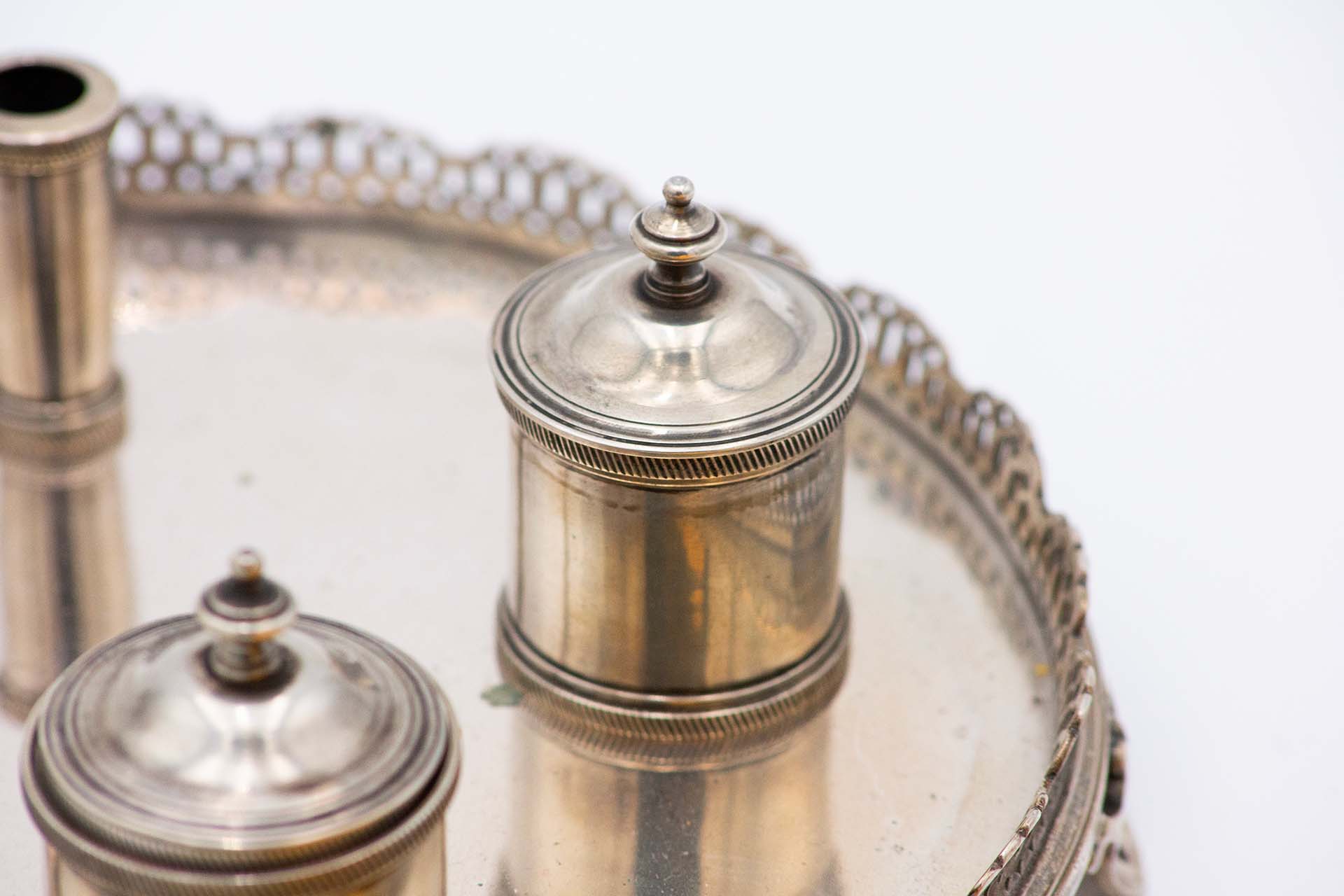 • Descrição: Tinteiro em prata com gradinha de forma circular, dois depósitos e campainha com assente em três pés vazados.