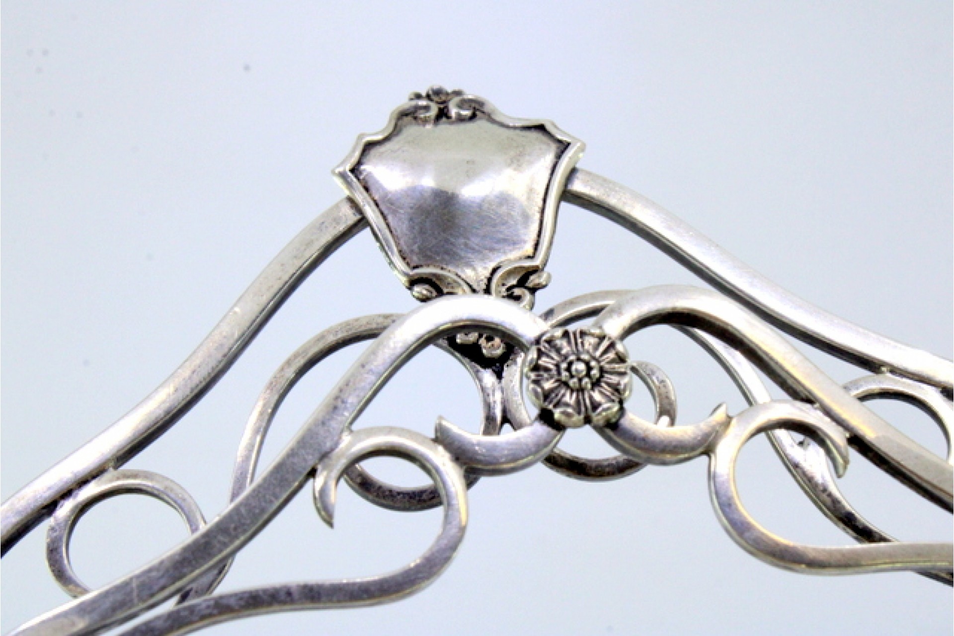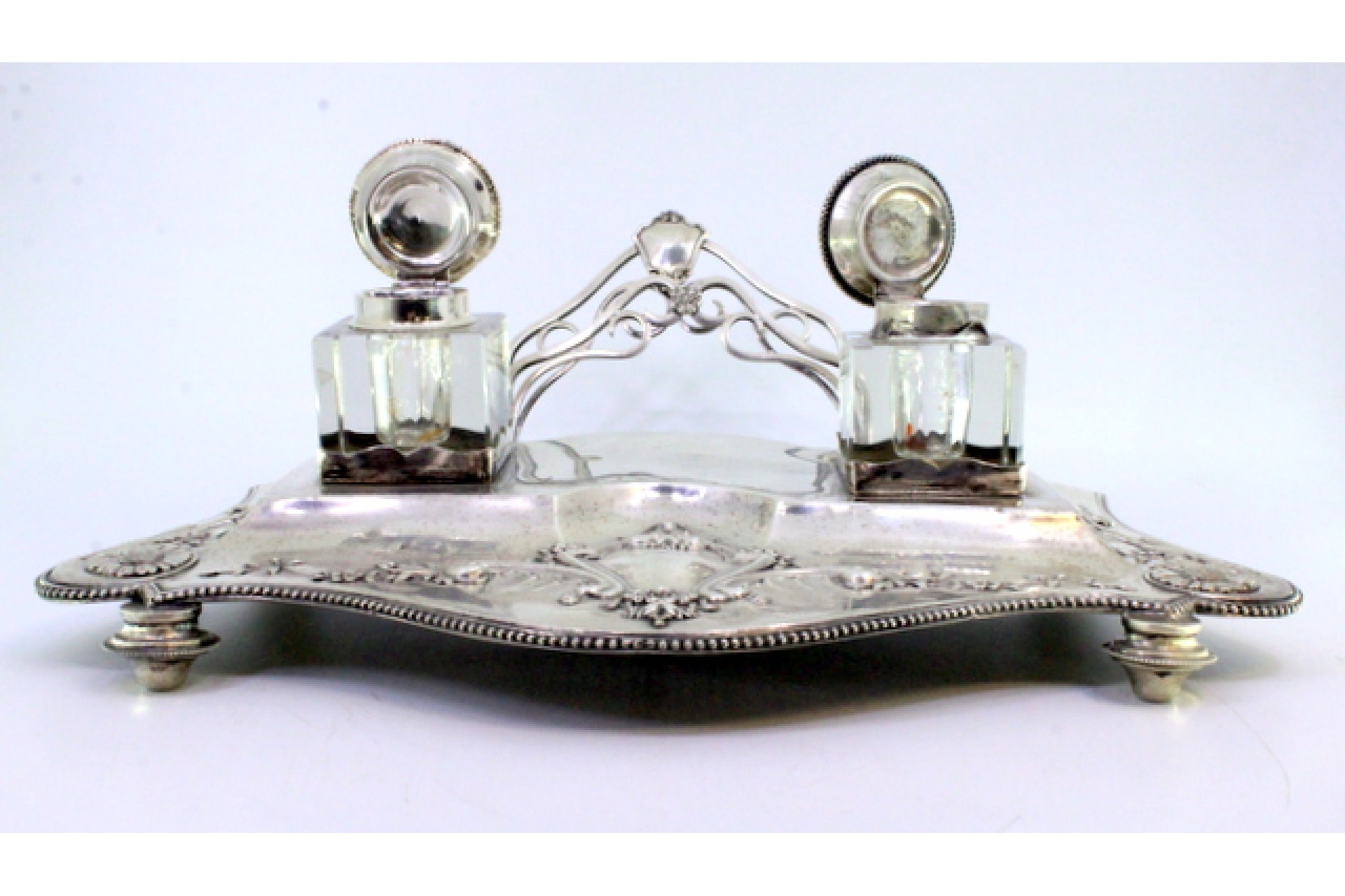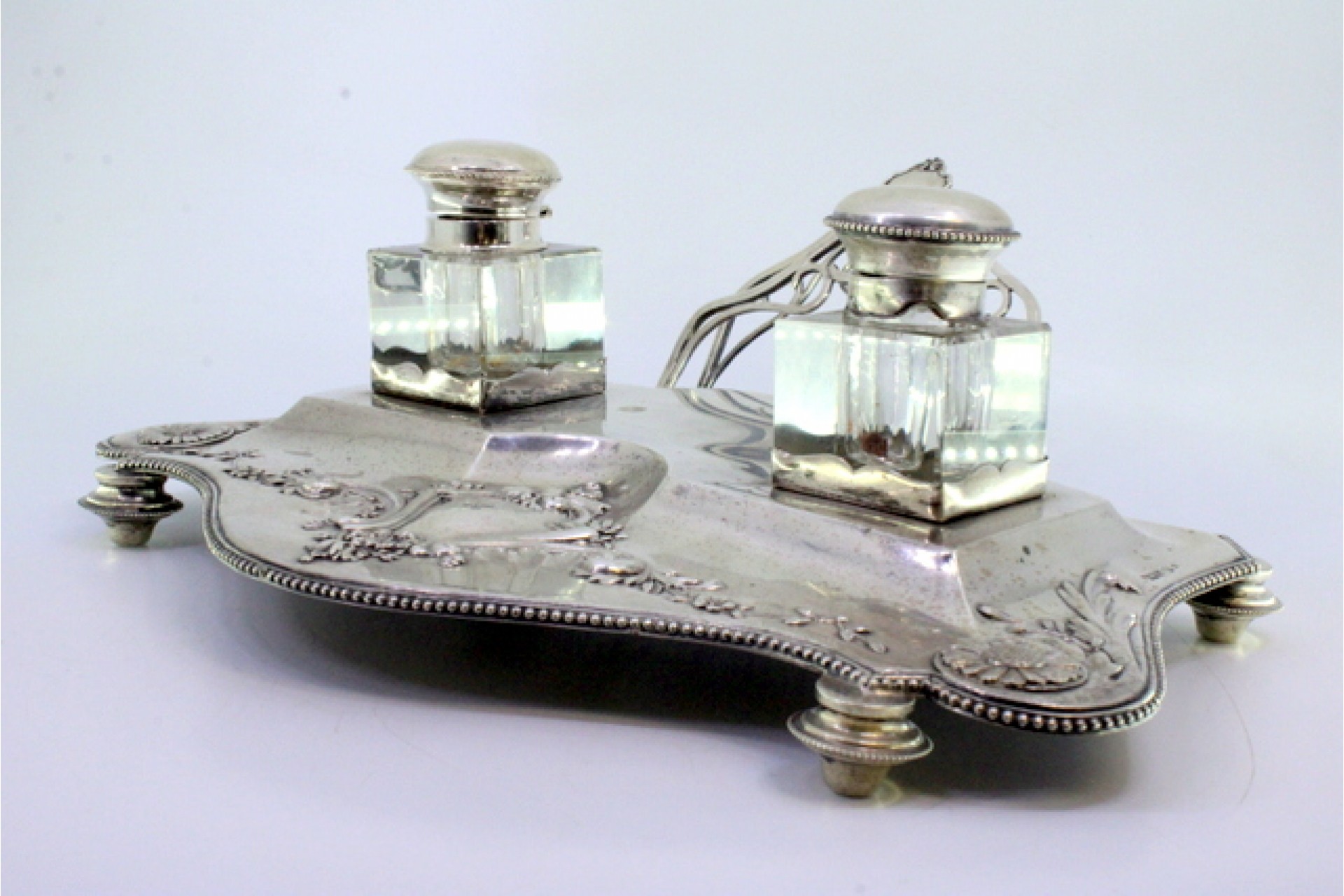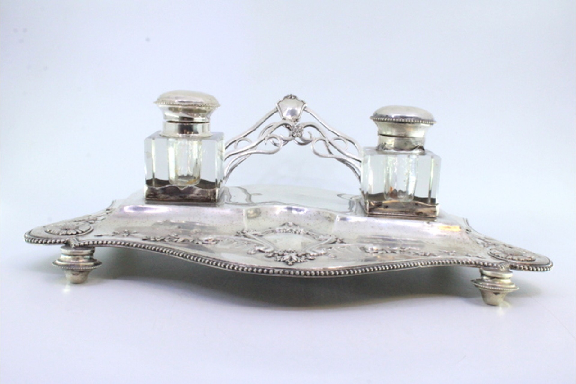 • Descrição: Tinteiro em prata com motivos florais relevados e envolvendo cartela para monograma, dois depósitos em vidro, porta cartas, friso perlado e assente em quatro pés redondos.