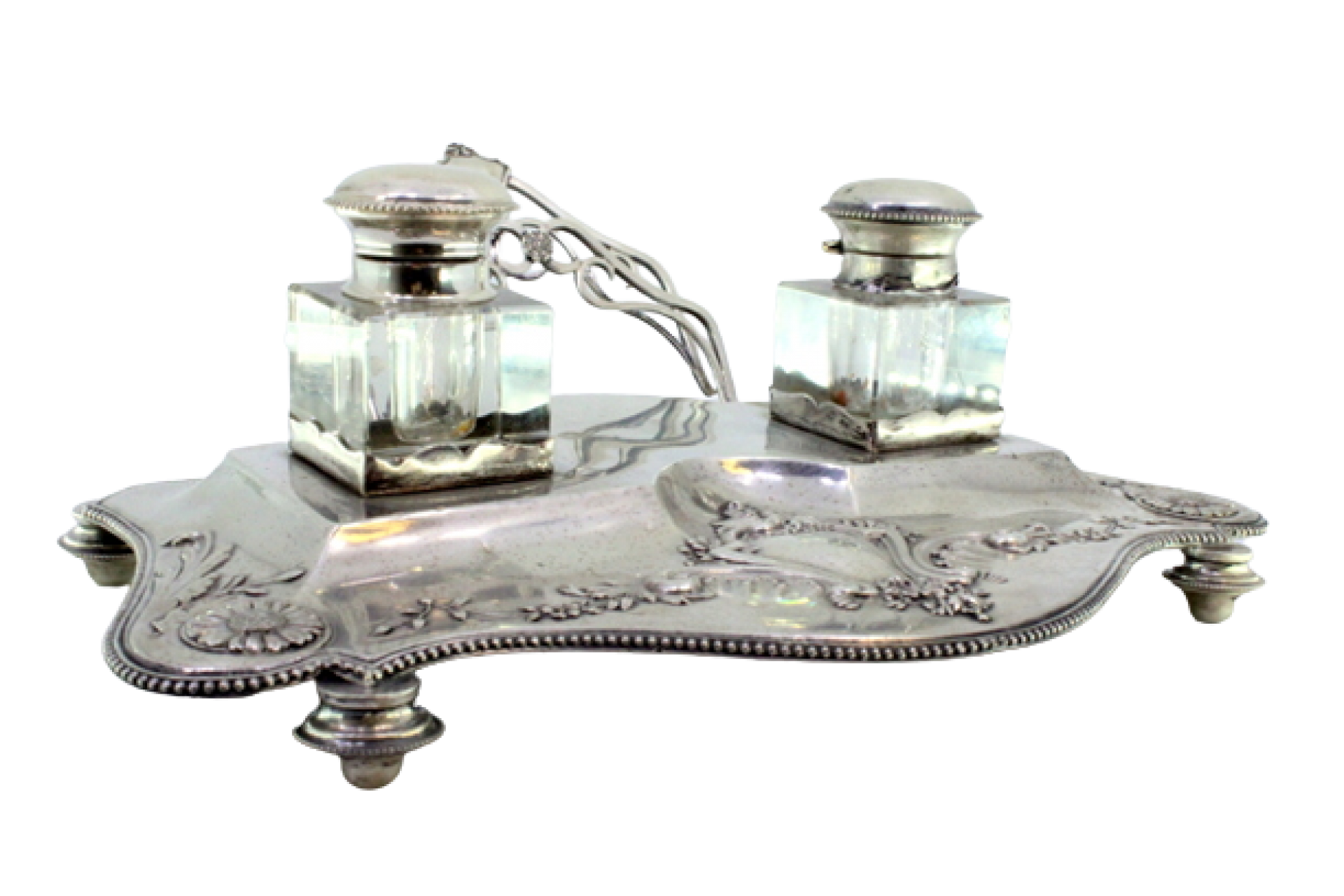 Tinteiro em prata com motivos florais relevados e envolvendo cartela para monograma, dois depósitos em vidro, porta cartas, friso perlado e assente em quatro pés redondos.