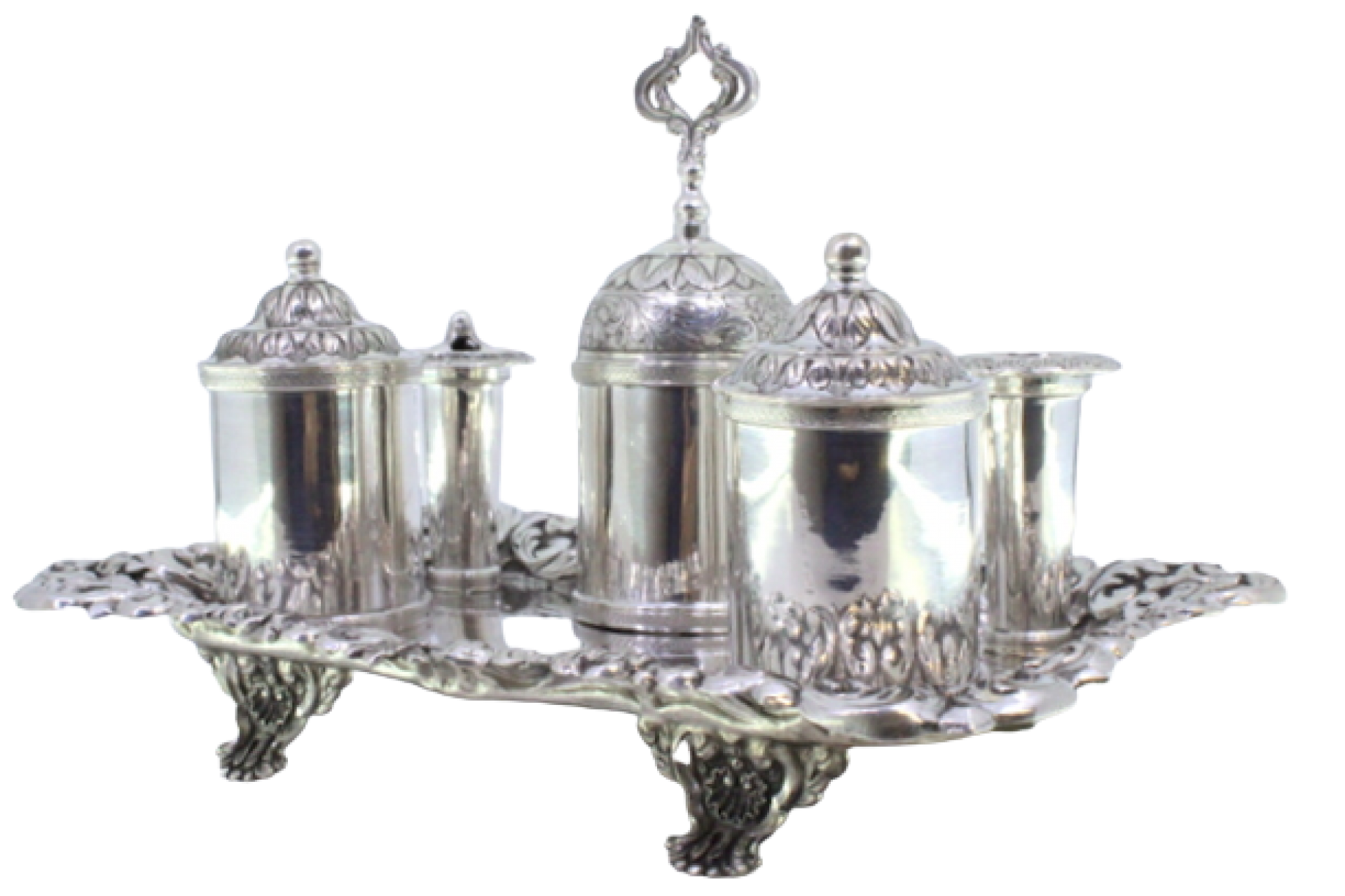 Tinteiro em prata relevada com dois depósitos, campainha, suportes para canetas e assente em quatro pés em forma de garras.
