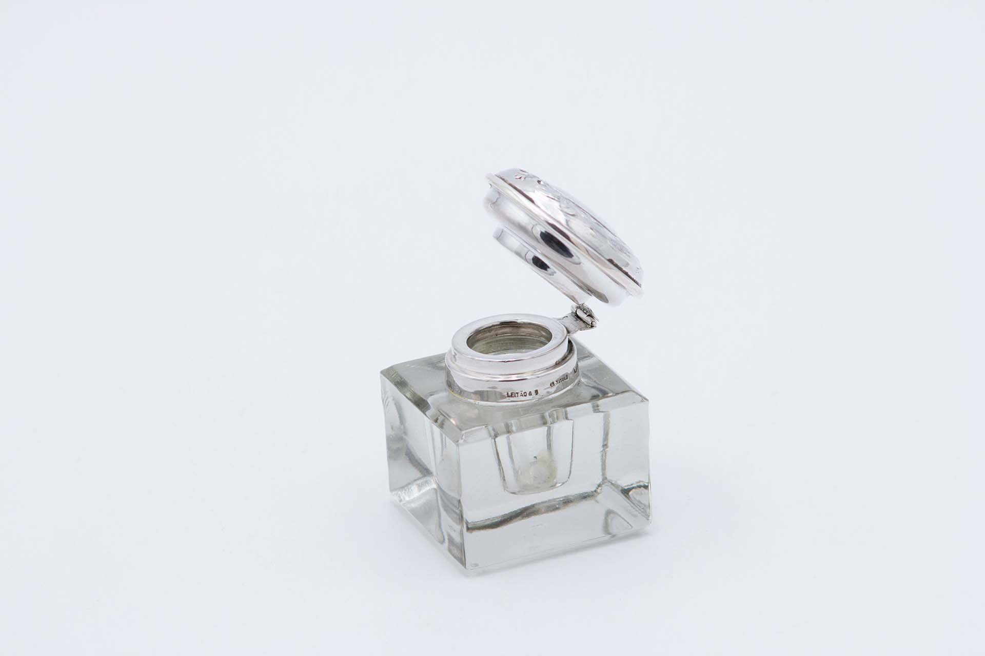 Tinteiro com depósito em vidro liso e tampa em prata relevada