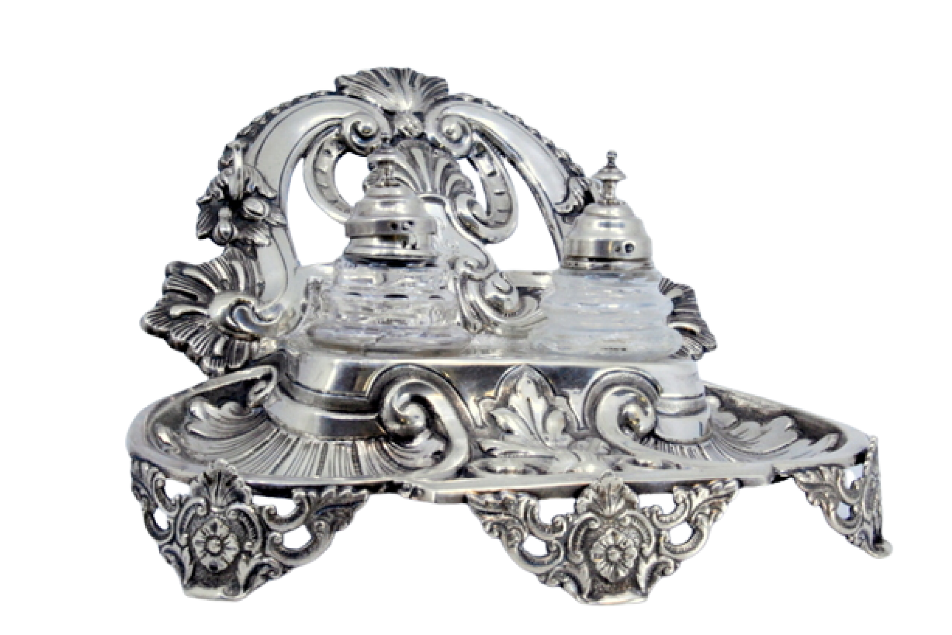 • Descrição: Tinteiro em prata recortada concheado, folhas de acanto e dois depósitos em vidro facetado.