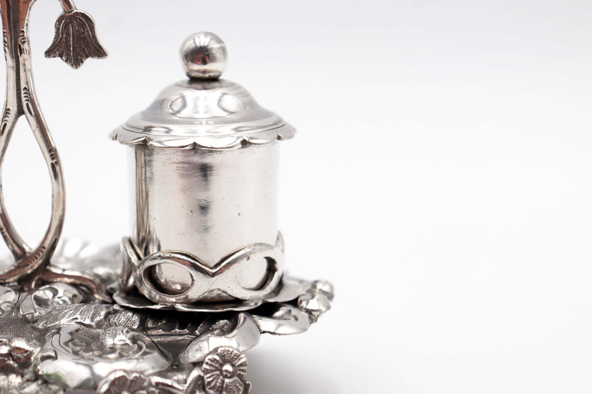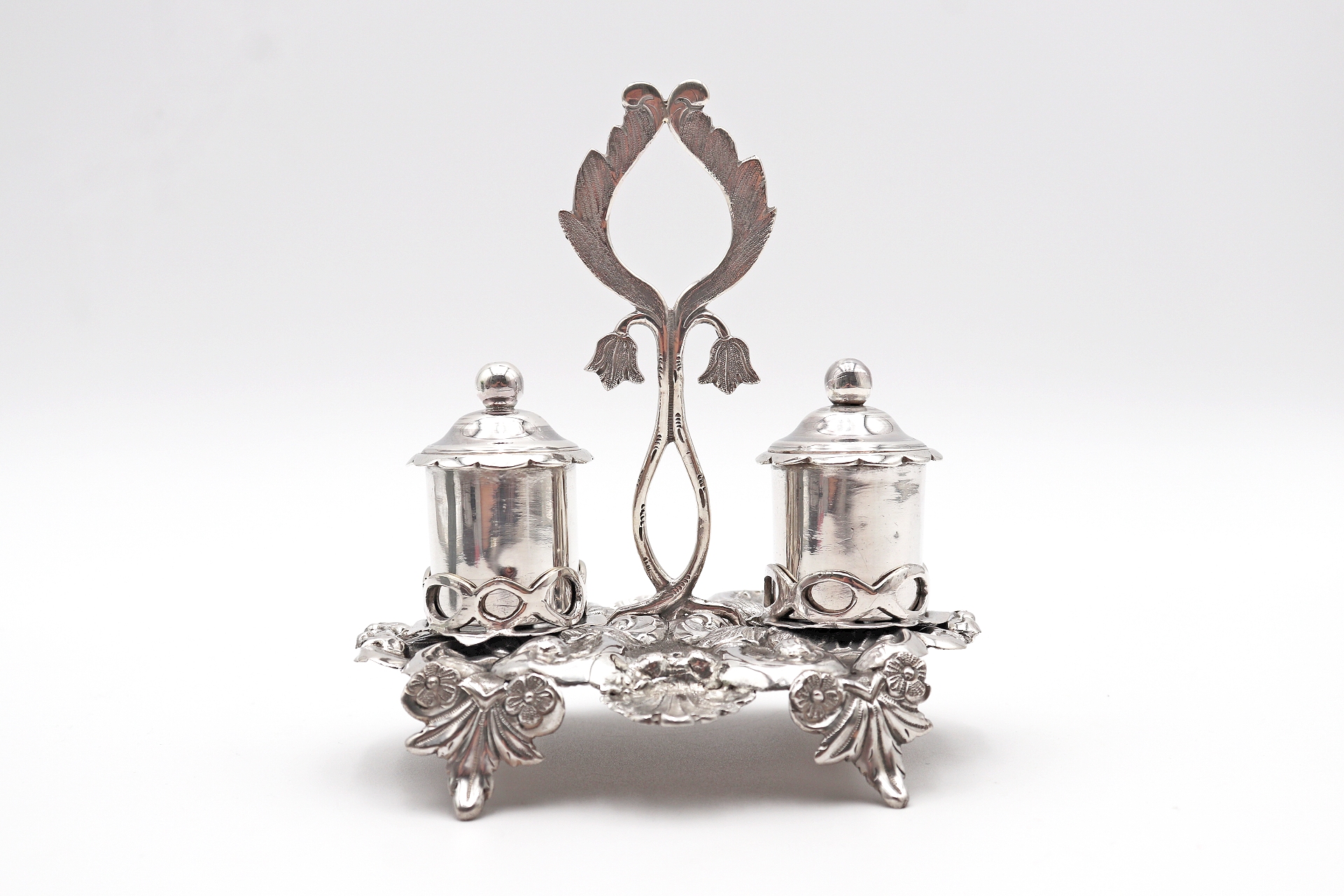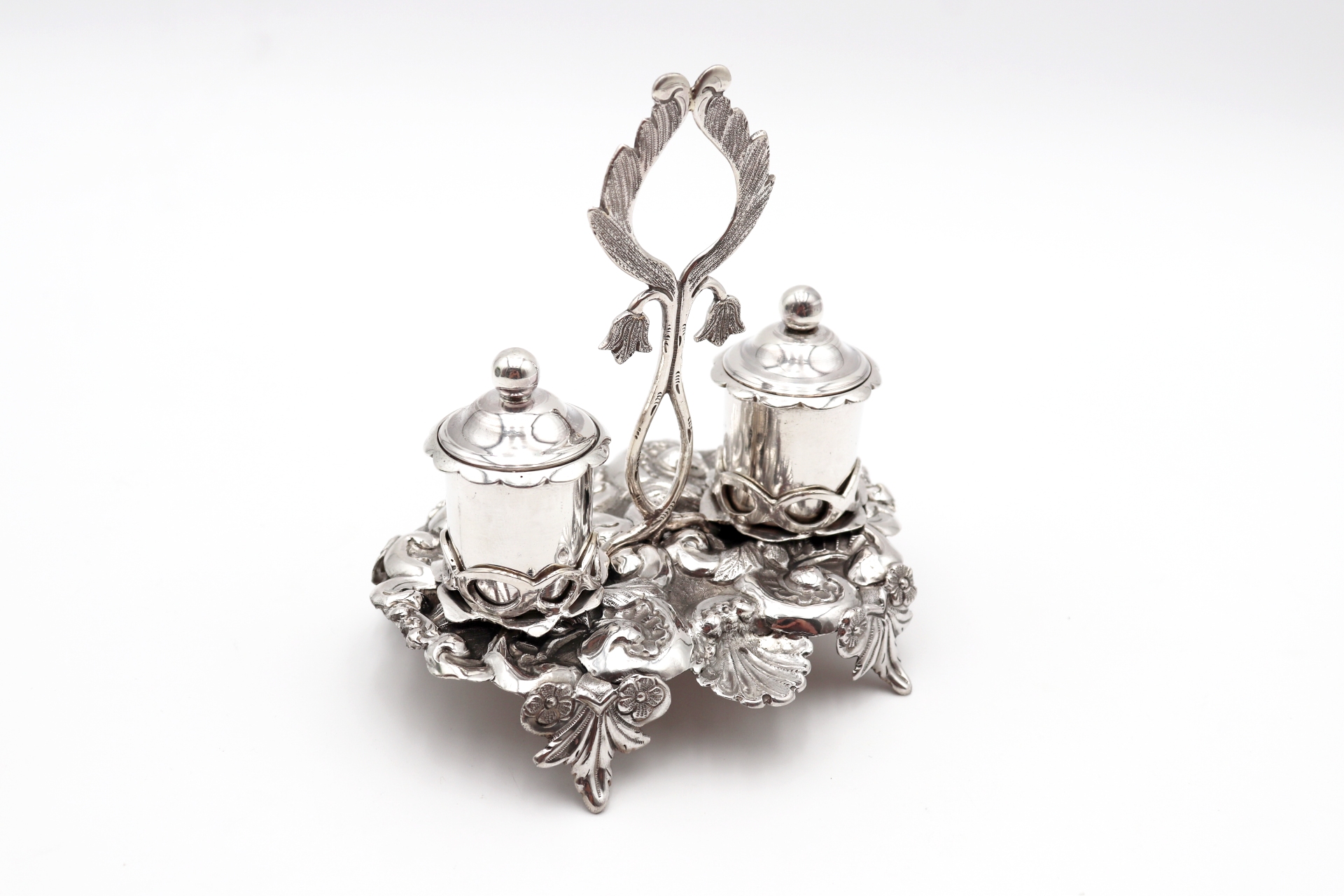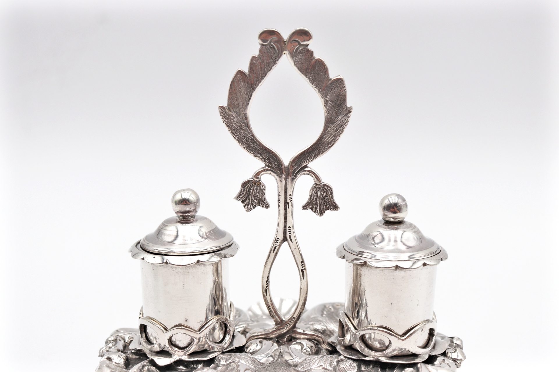 Tinteiro em prata ricamente detalhado com dois depósitos e motivos vegetalistas