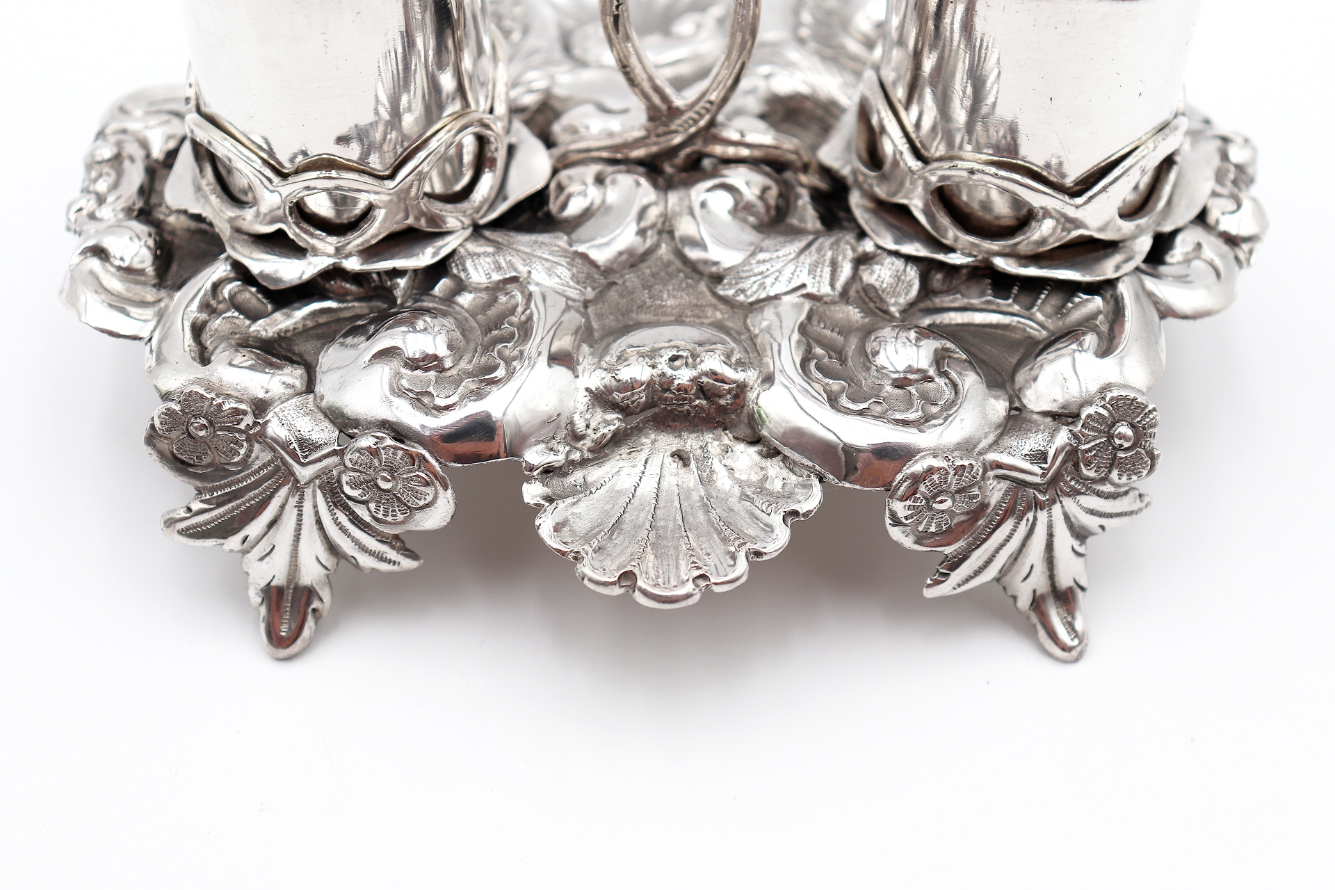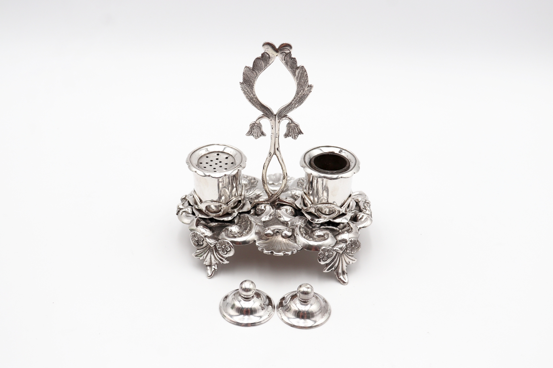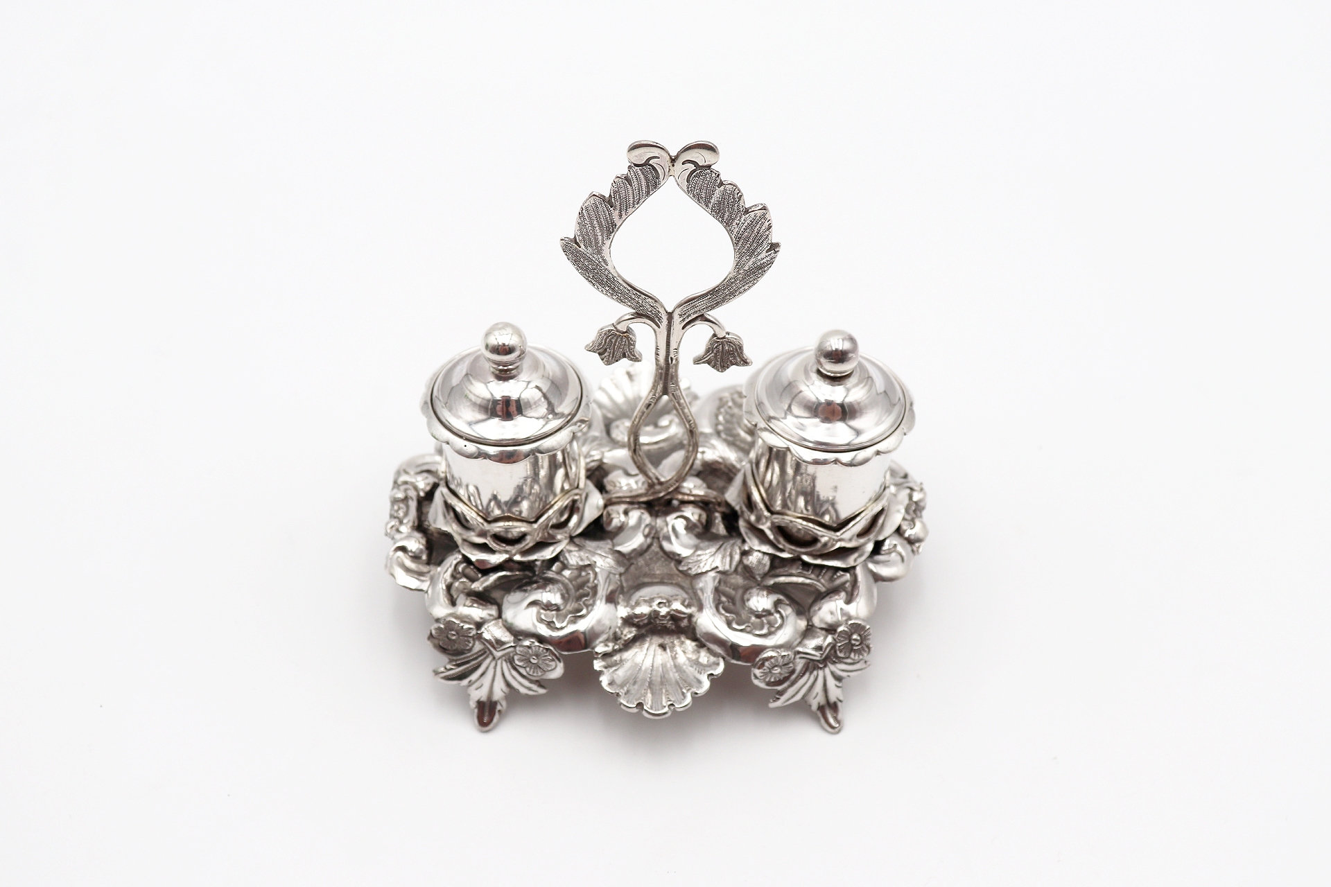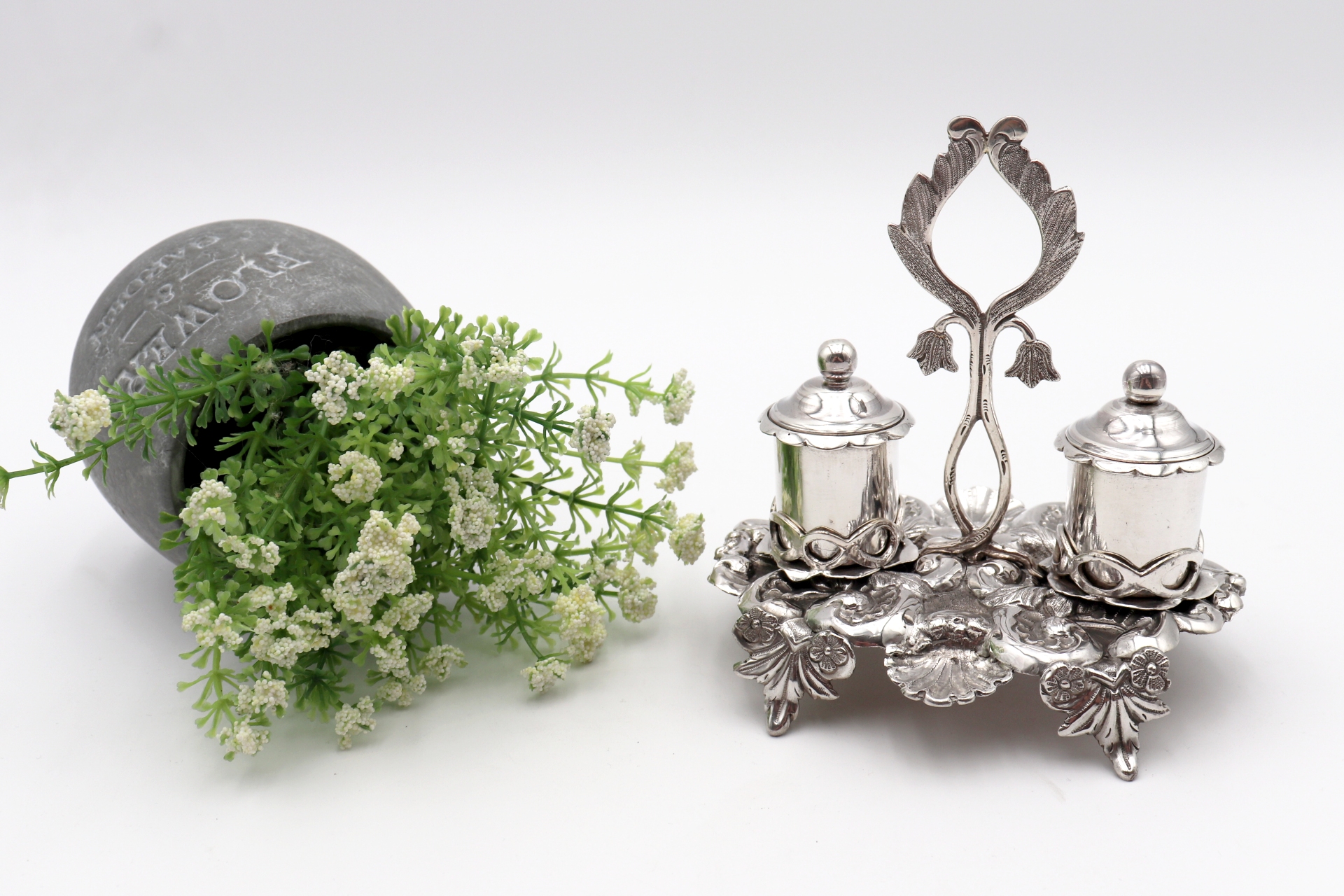 Tinteiro em prata ricamente detalhado com dois depósitos e motivos vegetalistas