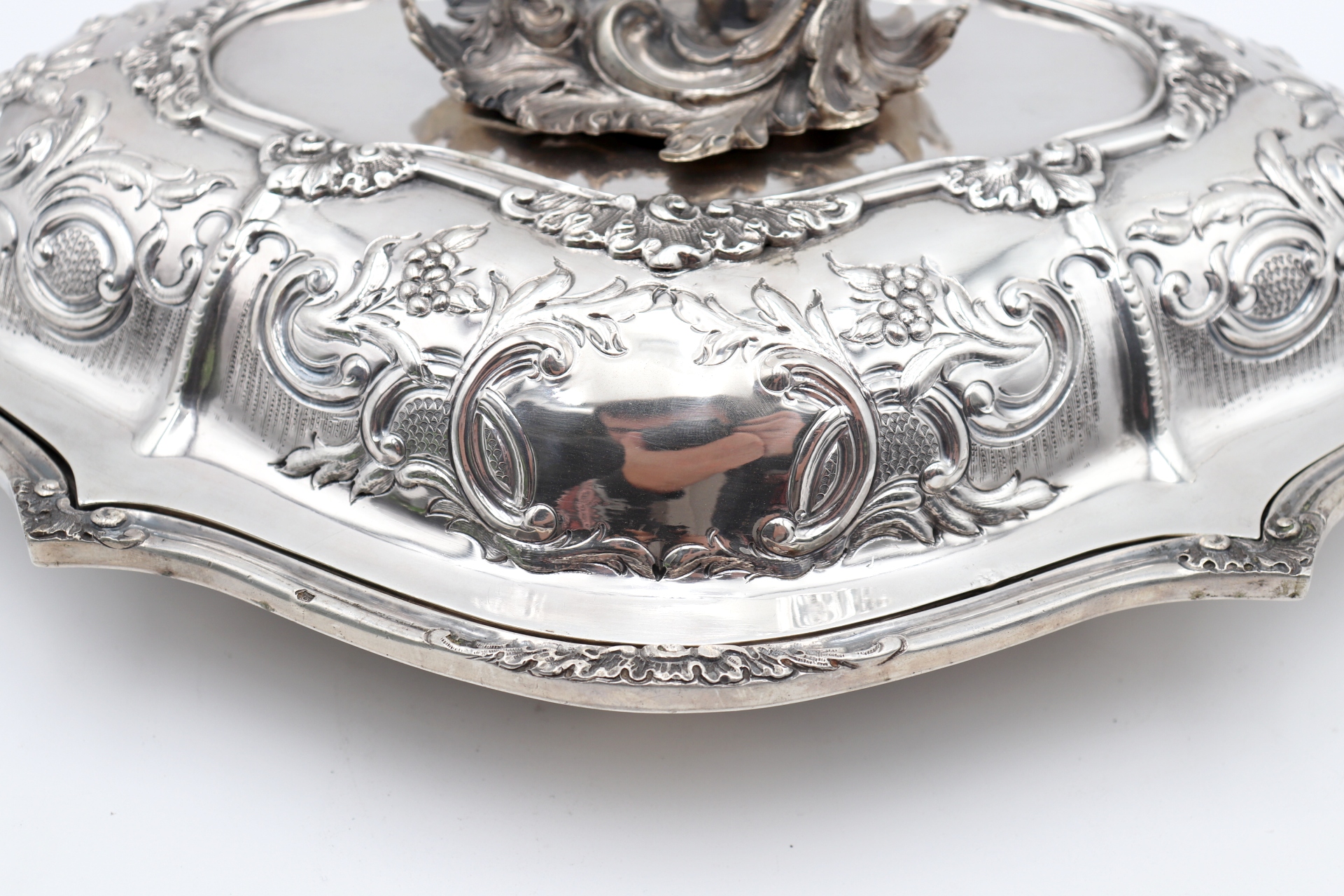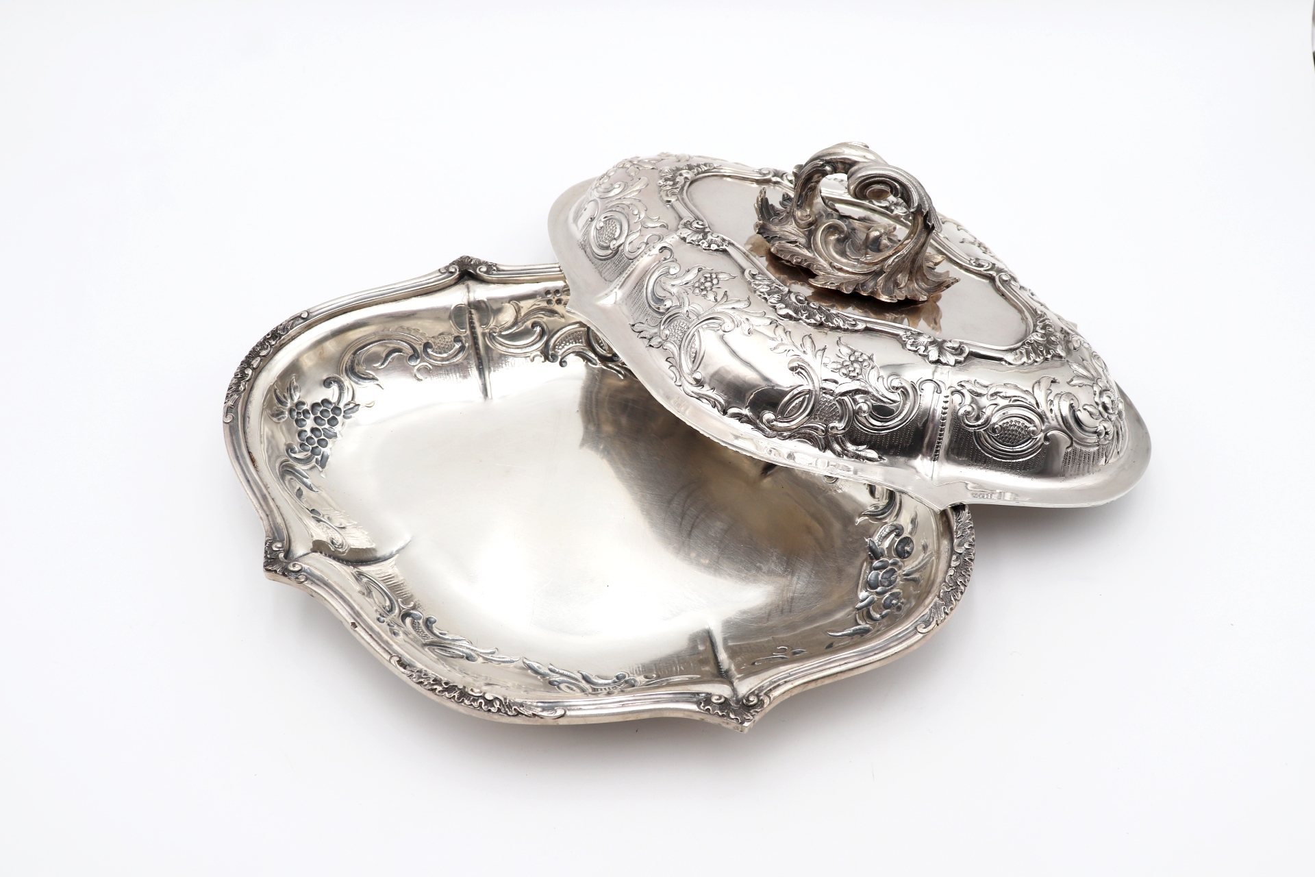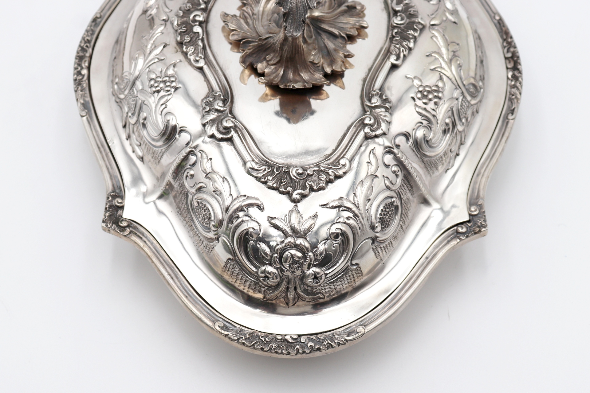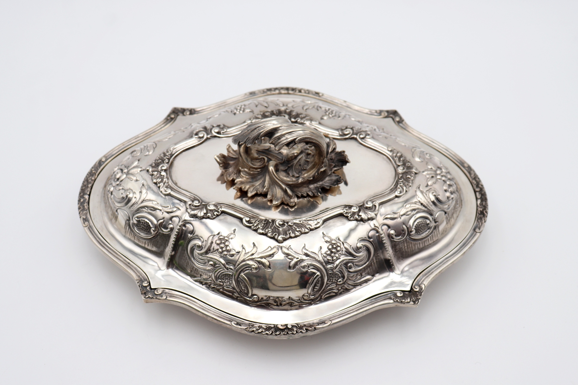• Descrição: Prato coberto em prata com ornamentos em alto relevo, friso na envolvência e pomo vazado na tampa amovível com folhas de acanto em vulto perfeito.