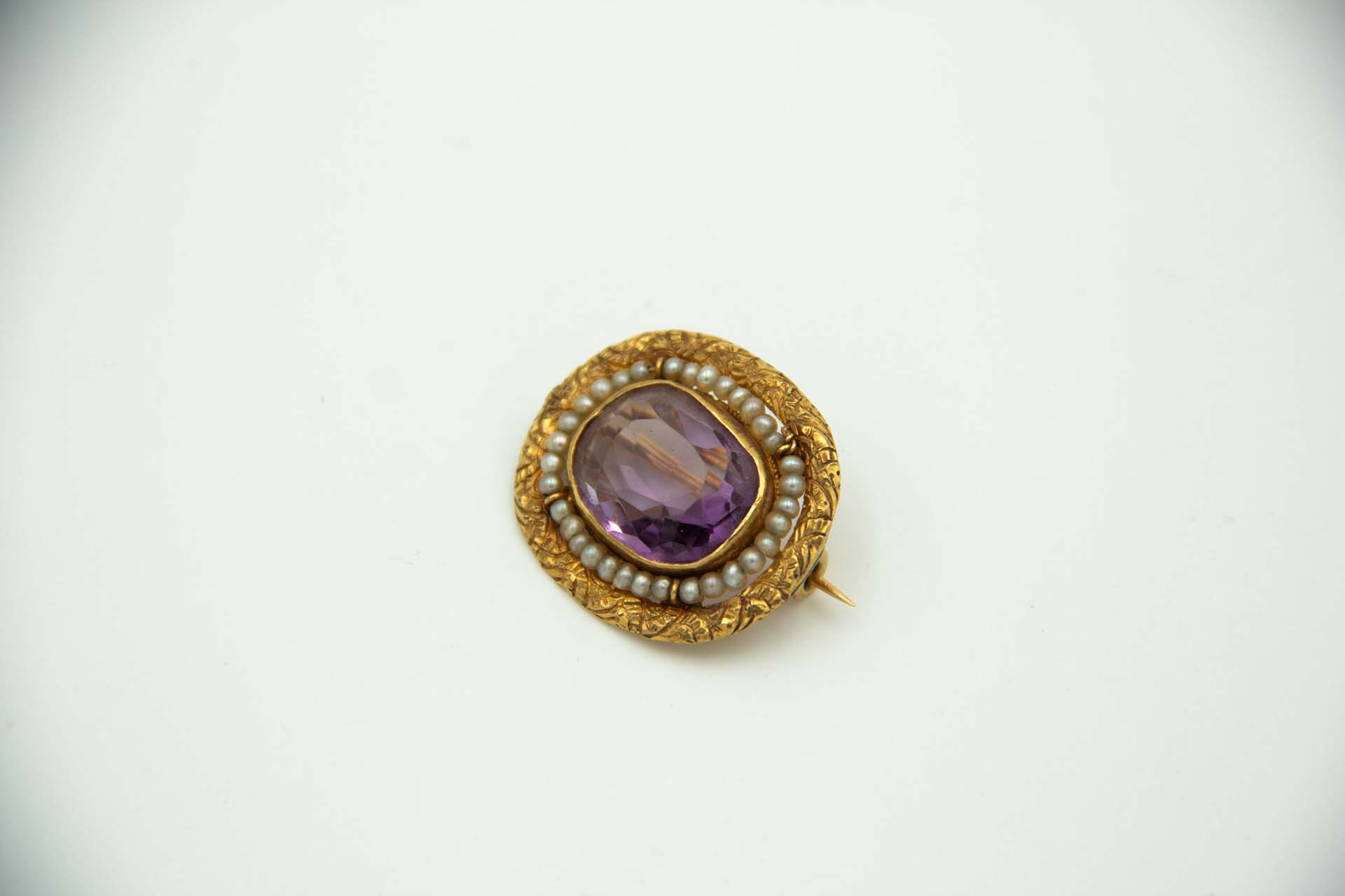 Pregadeira de ouro amarelo com pérolas de semente em moldura envolvendo amatista
