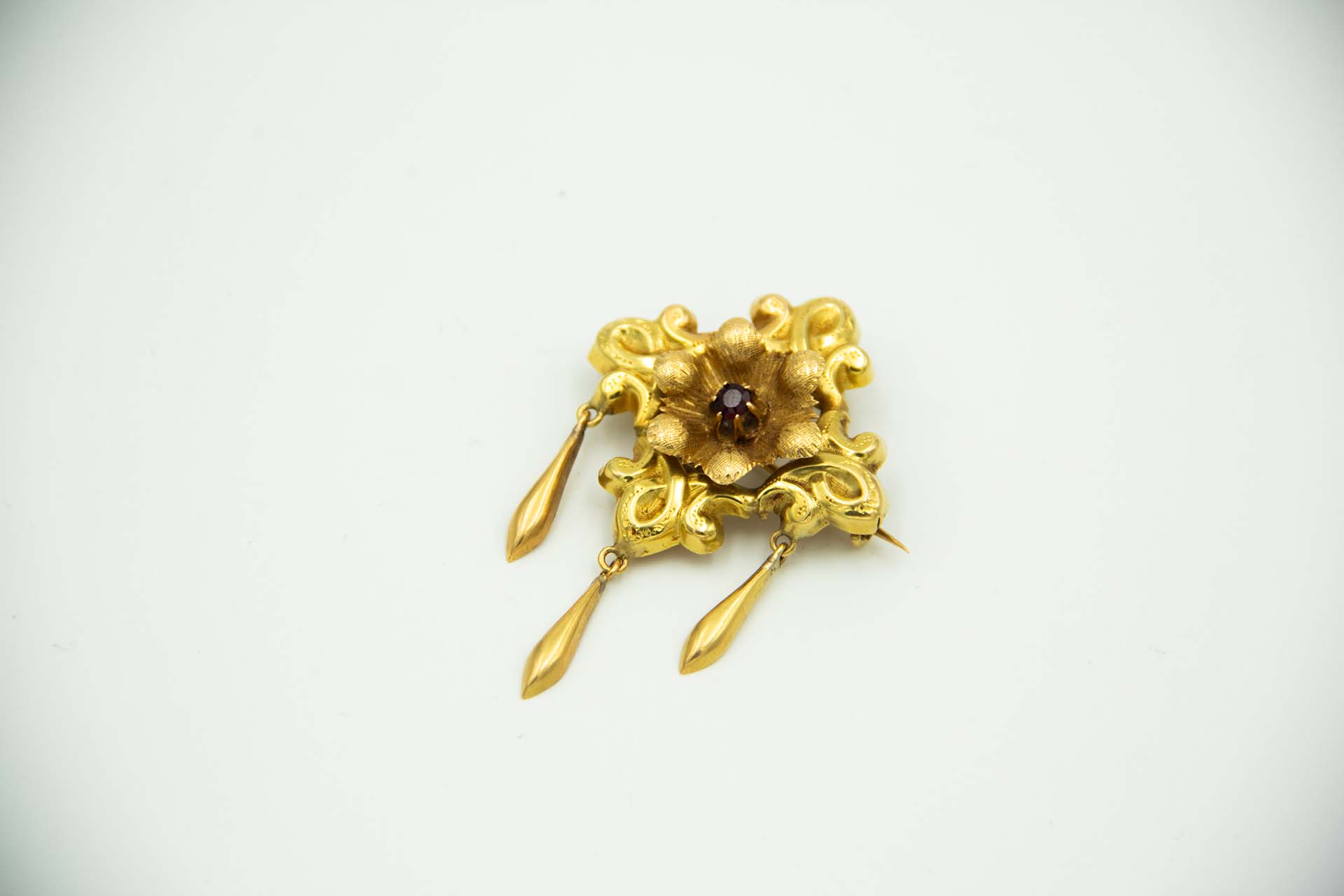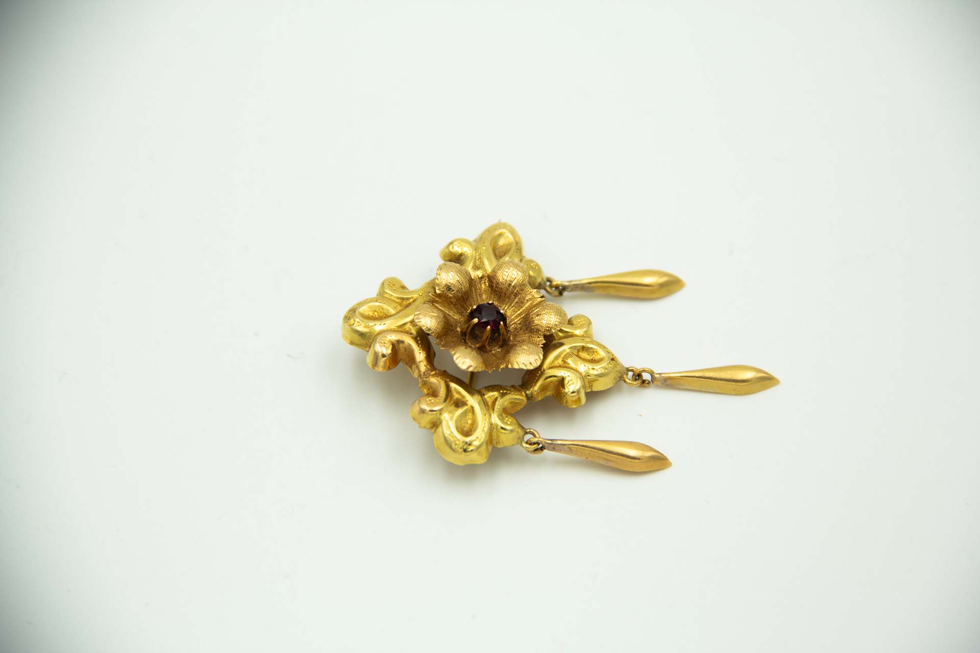 • Descrição: Pregadeira de ouro amarelo em forma de flor com pingentes articulados e rubi lapidado aplicado no centro.