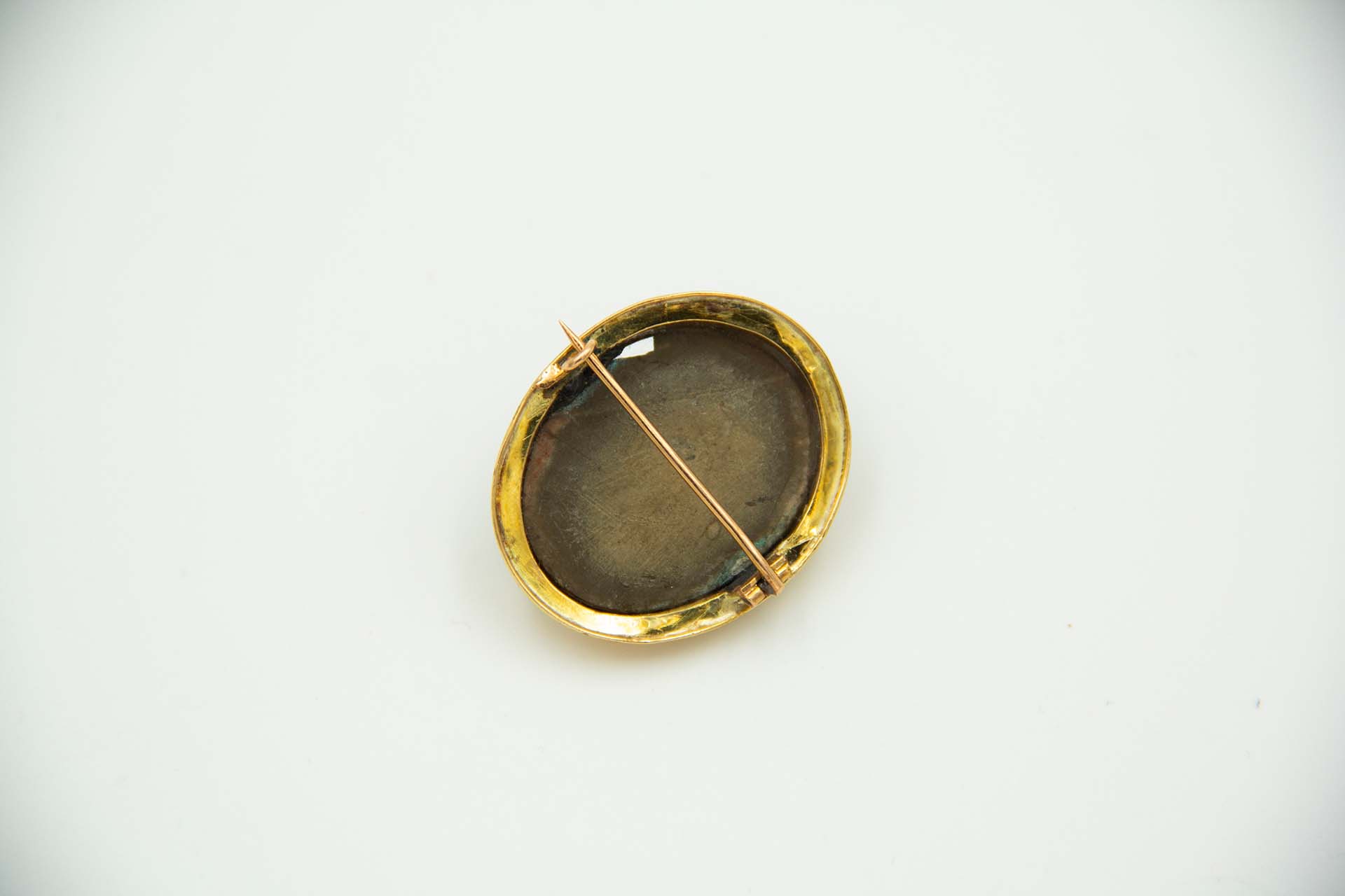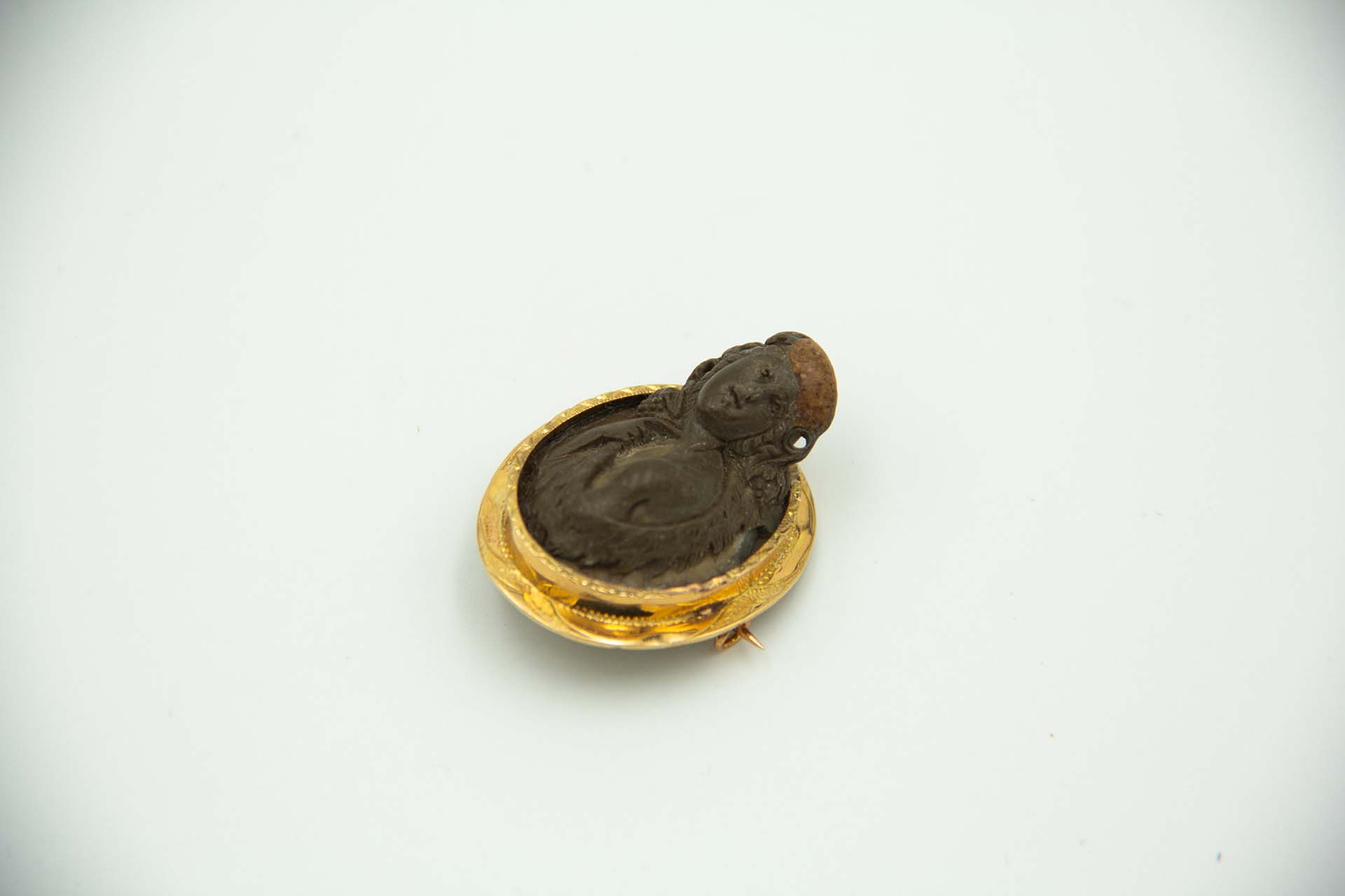 • Descrição: Pregadeira de ouro com busto feminino em matéria vegetal
