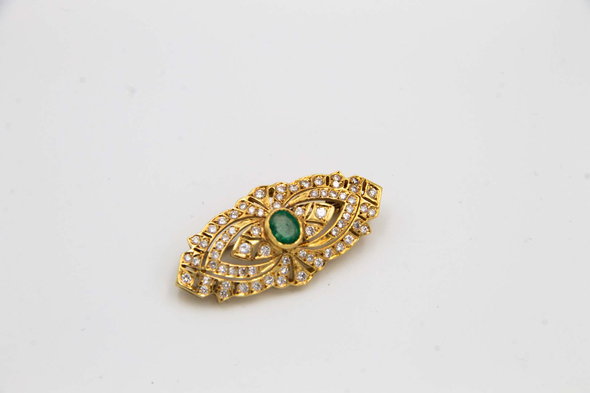 • Descrição: Pregadeira de ouro com pedras de diamantes (59) em talhe brilhante 8/8 e esmeralda lapidada.
