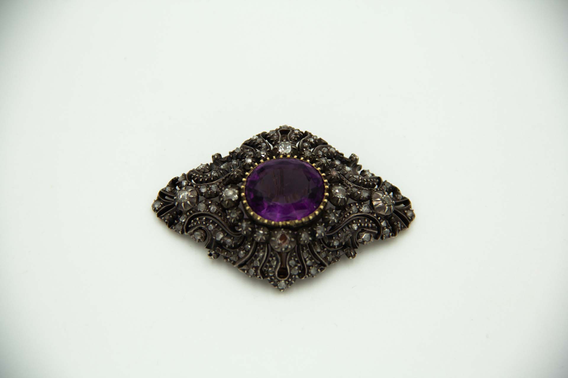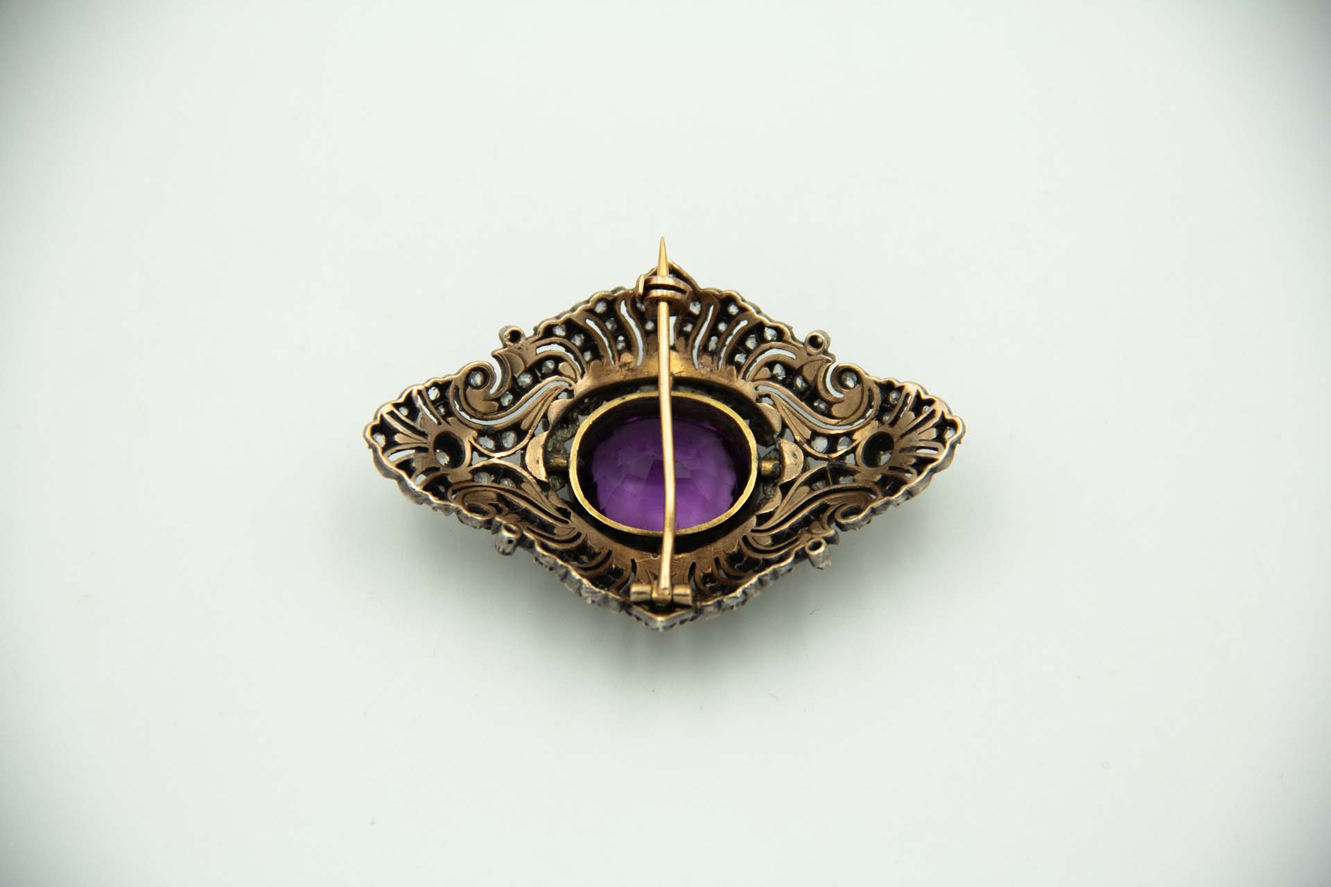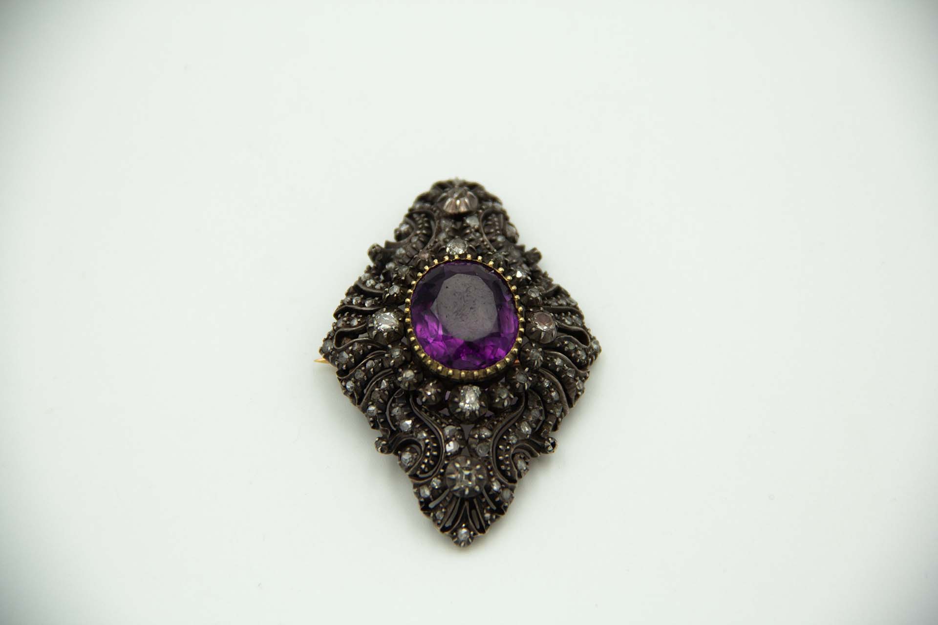Pregadeira de ouro e prata com diamantes coroados, lascas de diamante e ametista