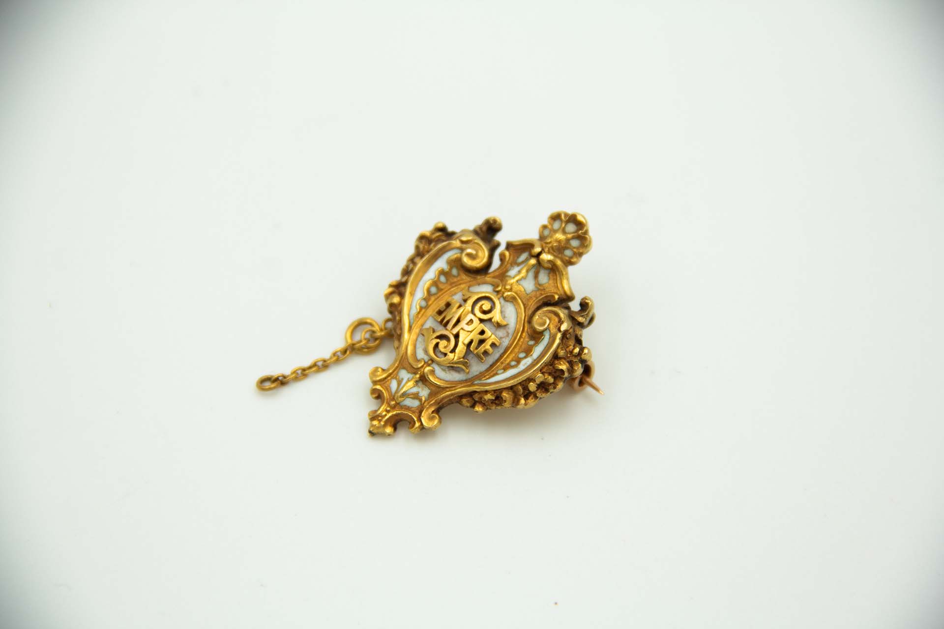 • Descrição: Pregadeira em ouro amarelo com conchas e motivos florais, palavra "SEMPRE".
