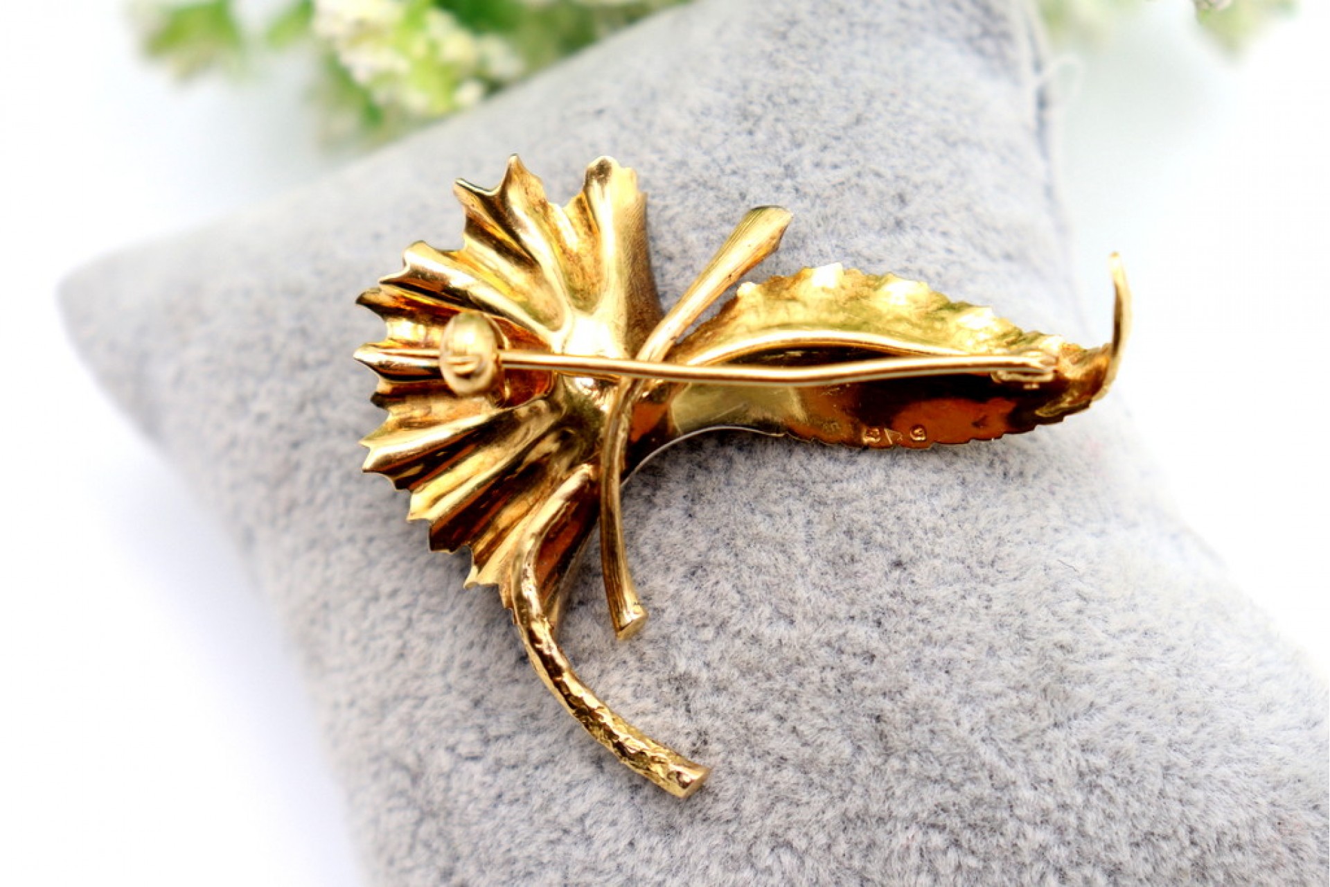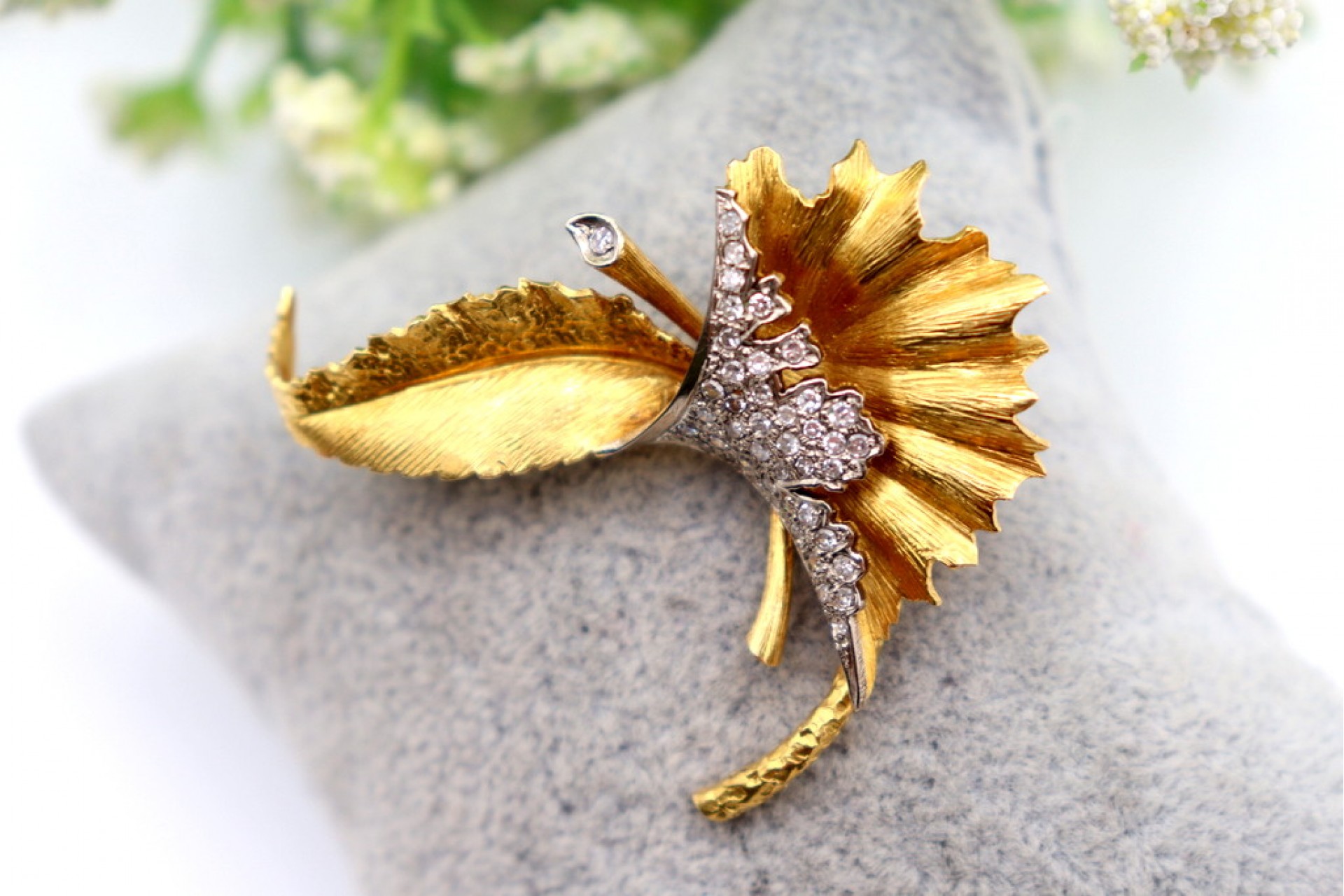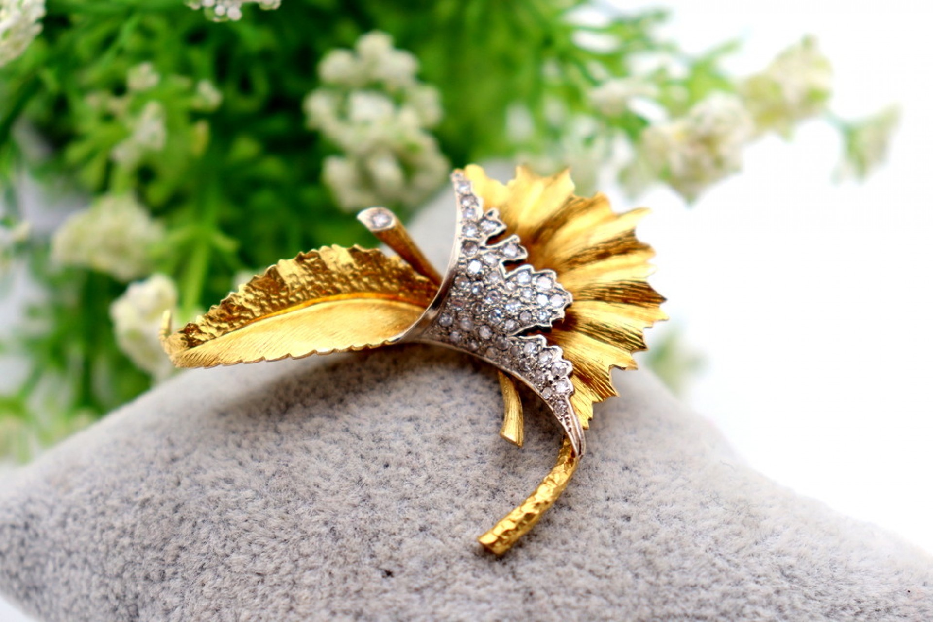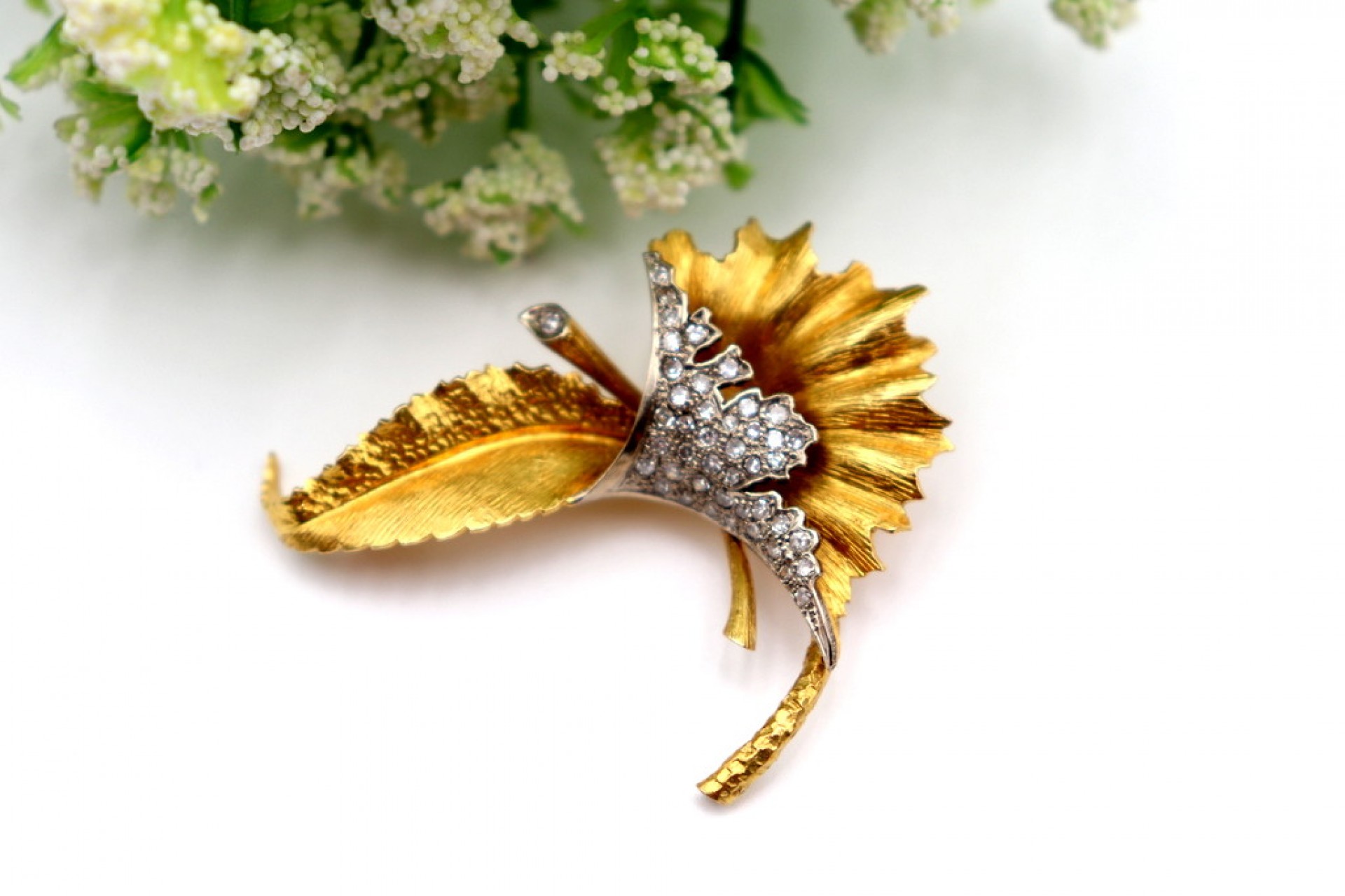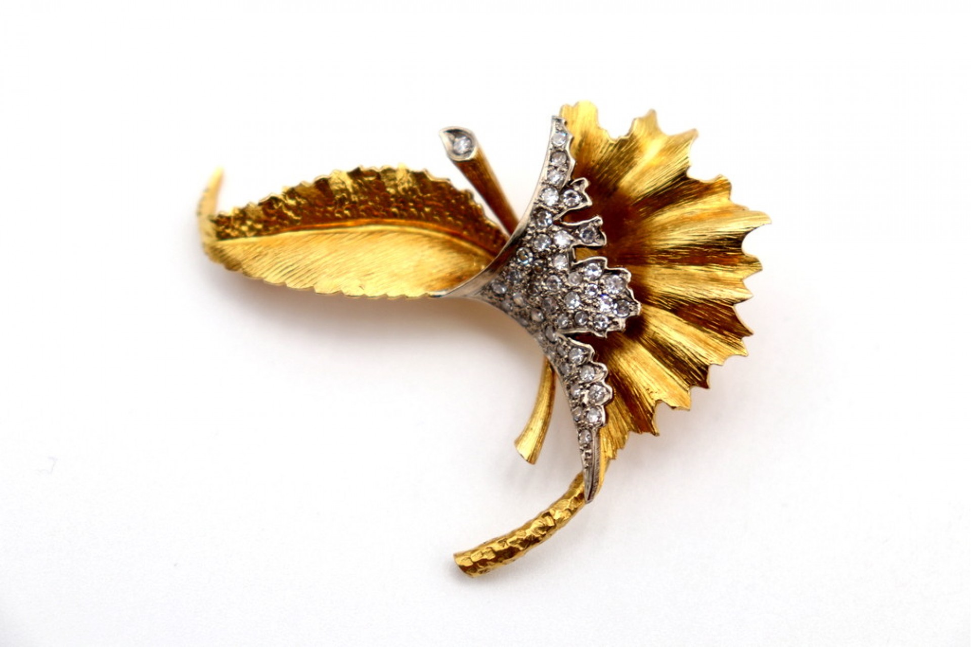 • Descrição: Pregadeira em ouro em forma de folha com diamantes em talhe brilhante 8/8  e relevos com recortes.