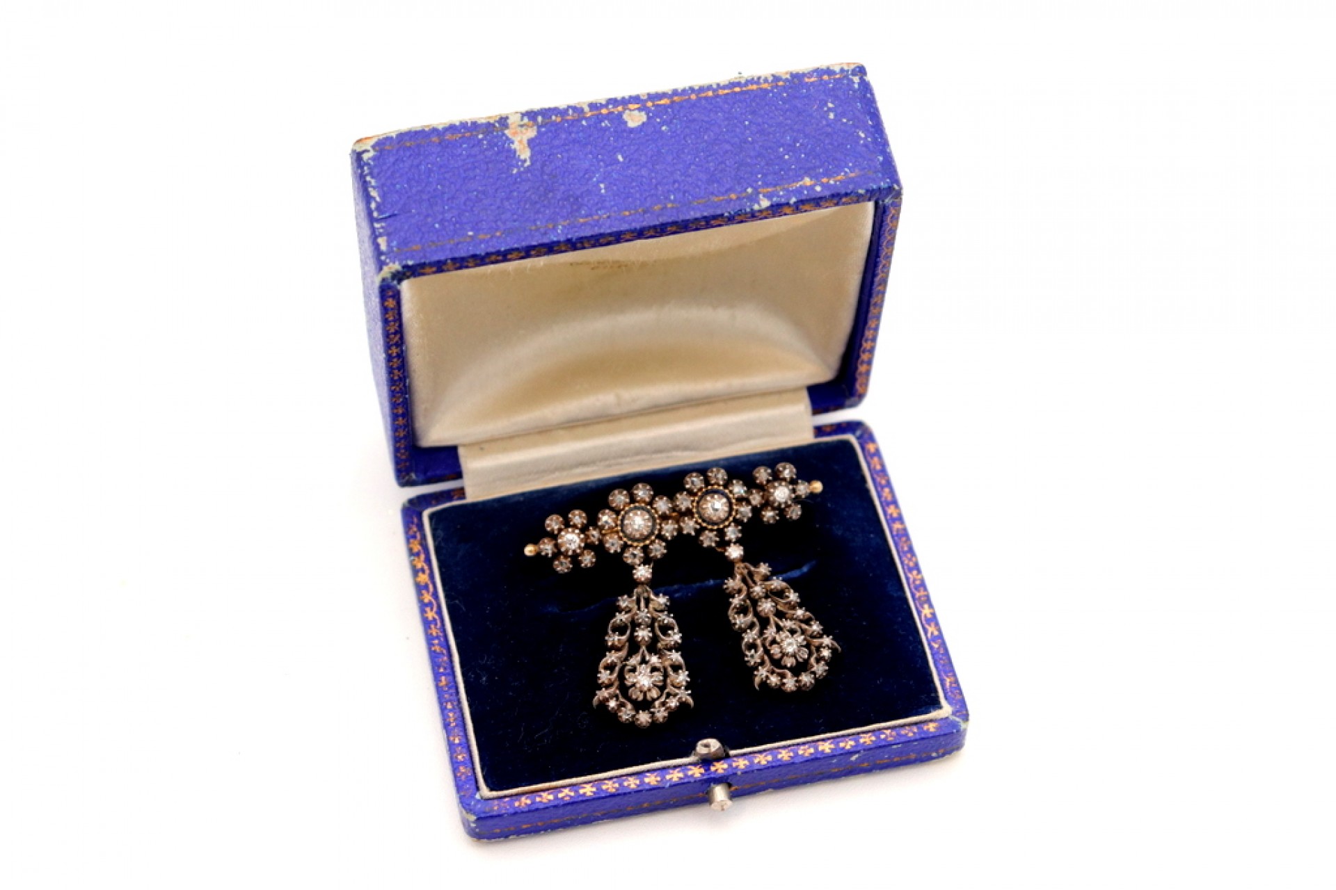 • Descrição: Pregadeira em ouro e prata com diamantes (8) e lascas de diamantes com dois pingentes basculantes.