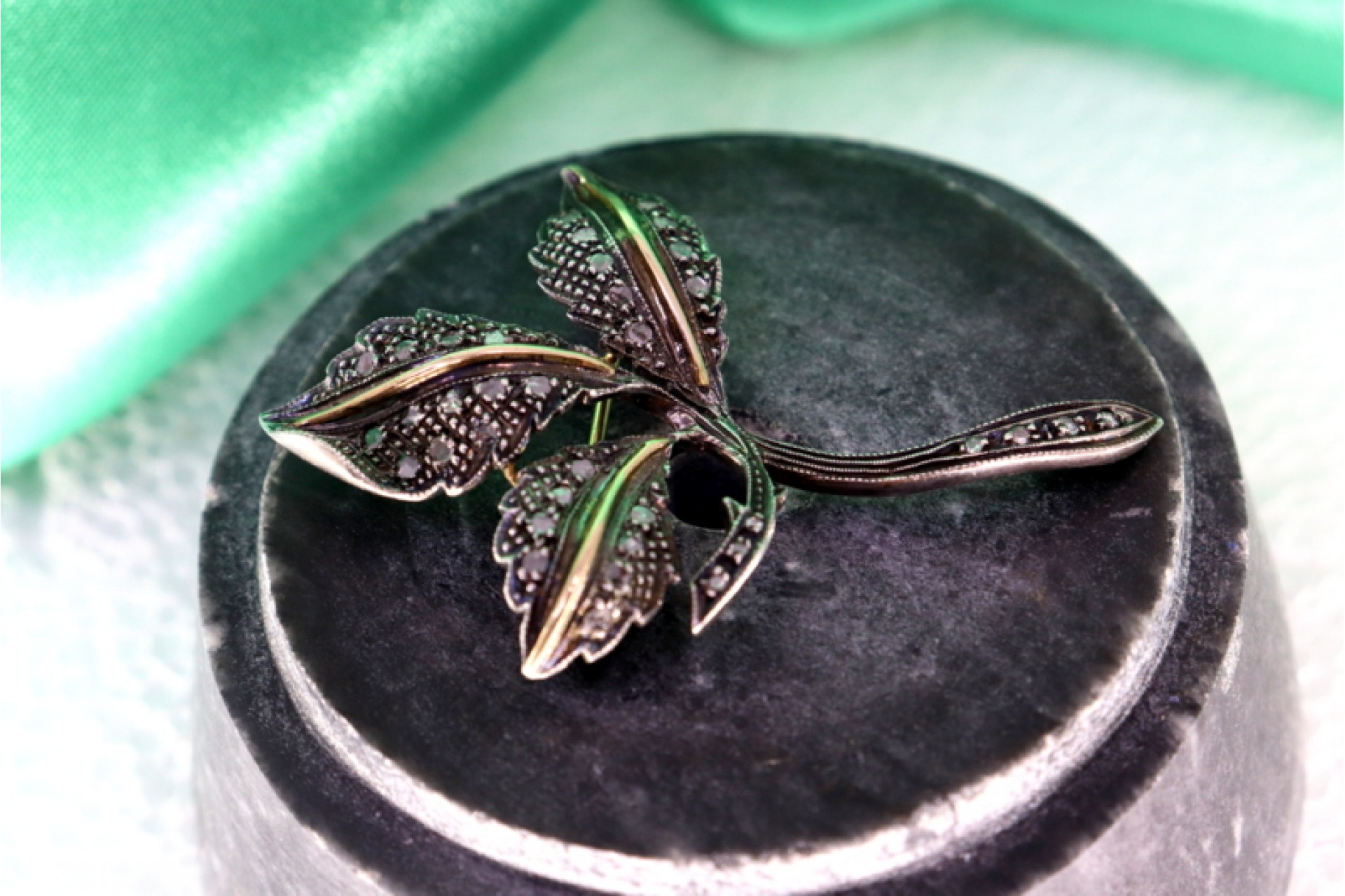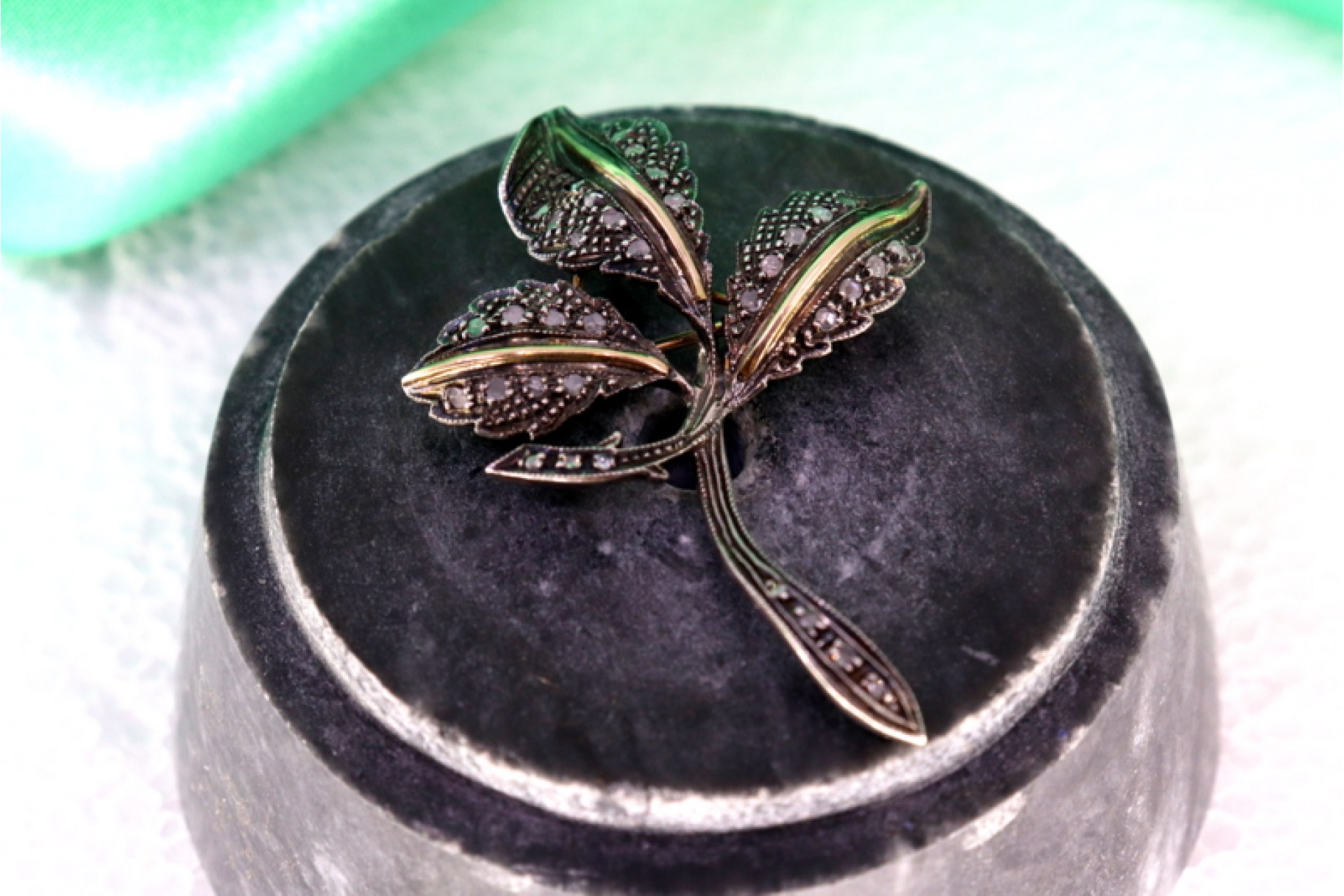 Pregadeira em ouro e prata com forma de flor com lascas de diamantes.