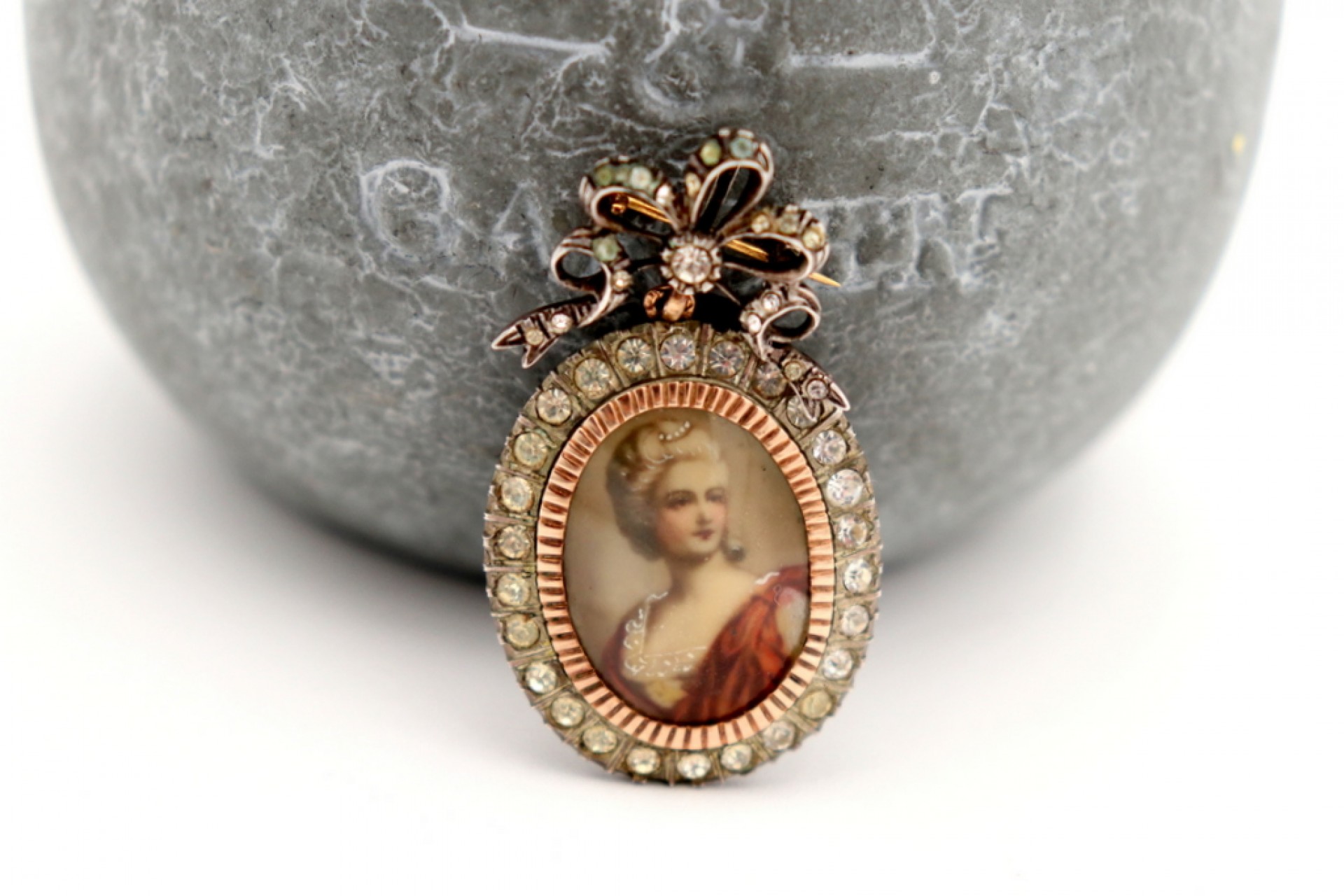 • Descrição: Pregadeira em ouro e prata em forma de laço e medalha com dama antiga como pingente articulado, quartz envolvendo medalha e laçarote.