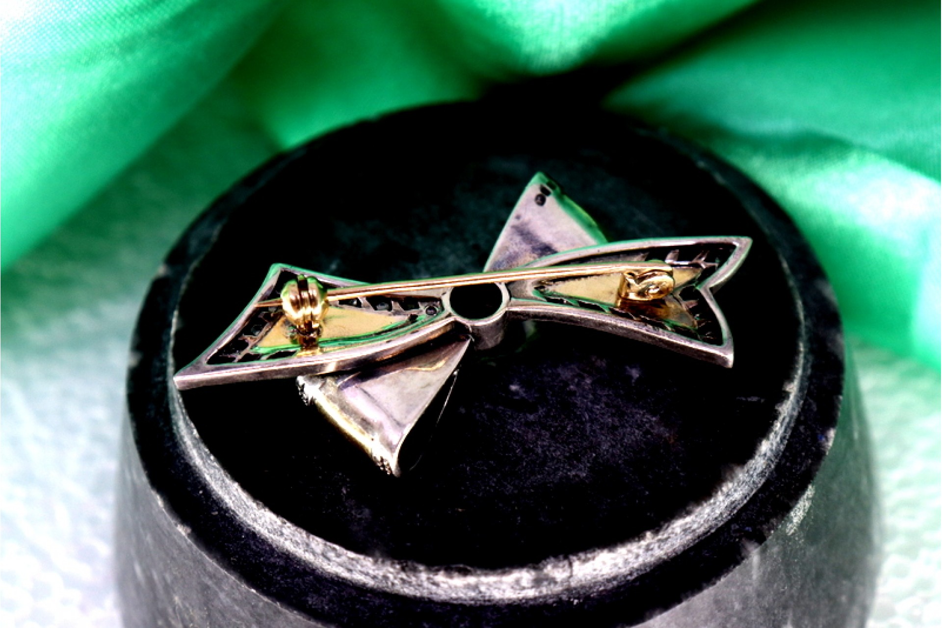 • Descrição: Pregadeira em ouro e prata em forma de laço com lascas de diamantes.