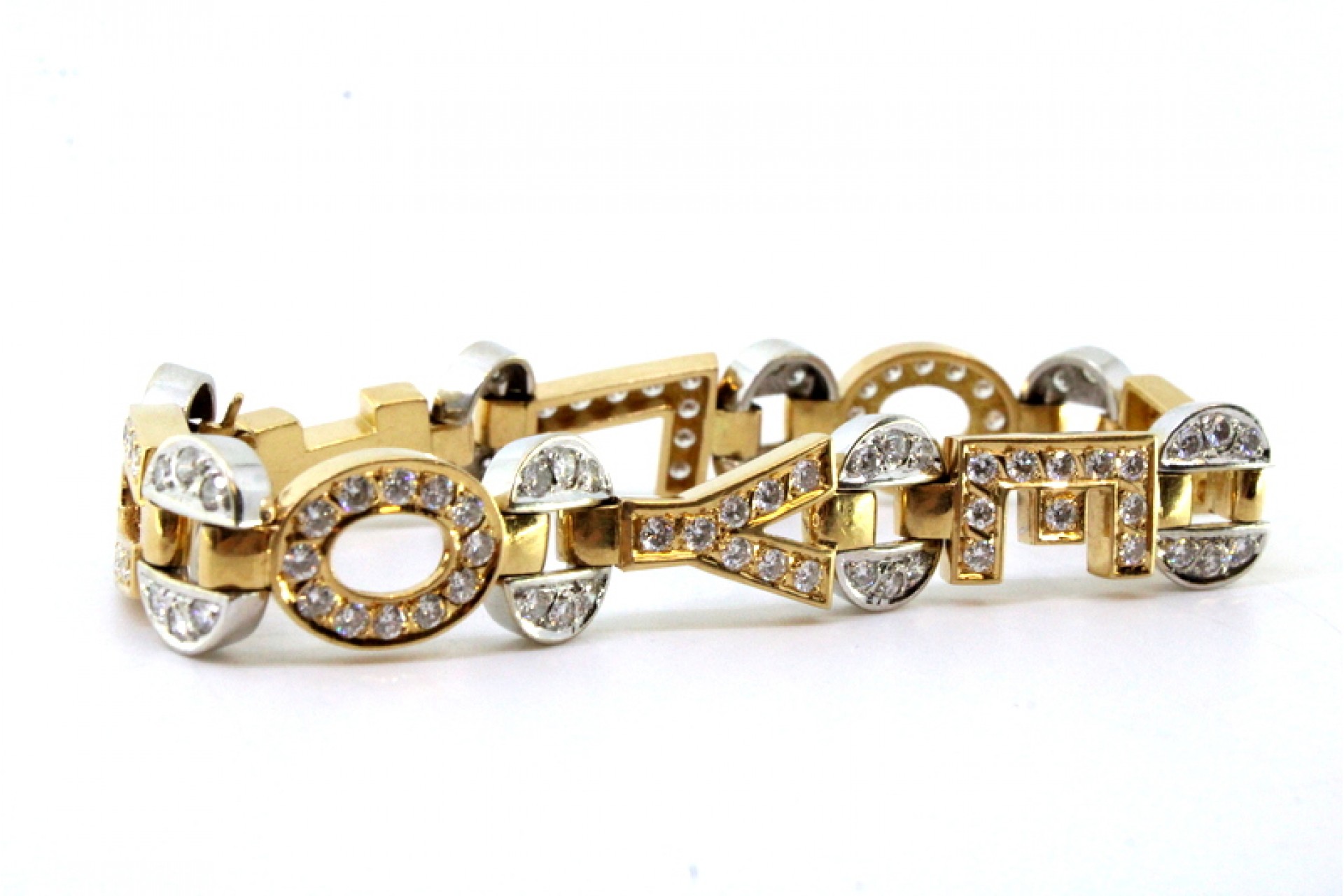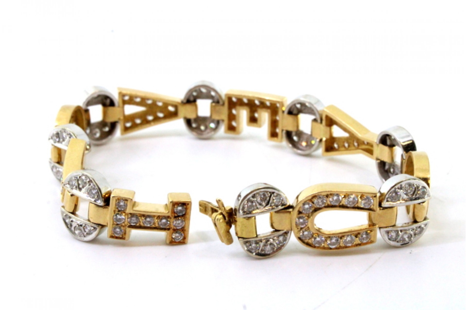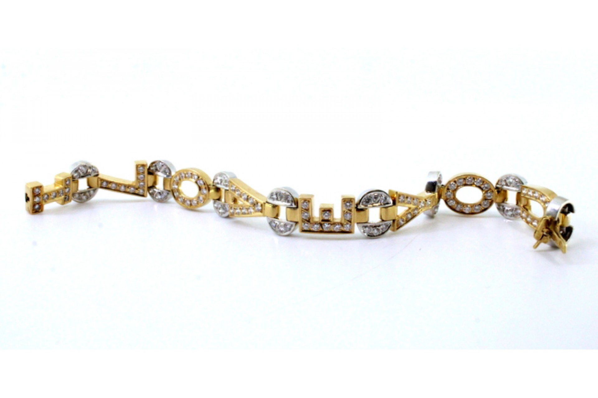 • Descrição: Pulseira em ouro bicolor com 128 diamantes em talhe brilhante e frase "I LOVE YOU".