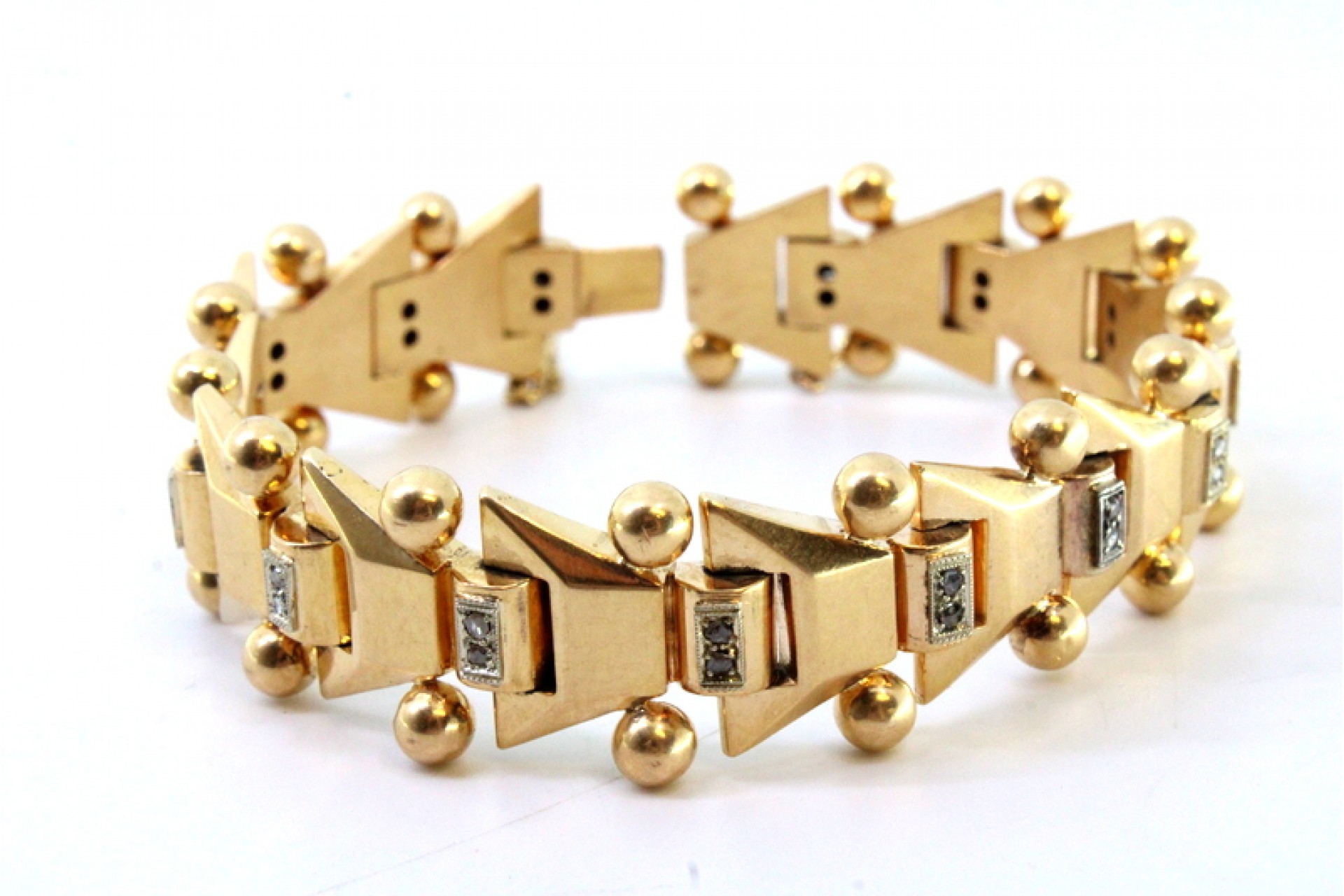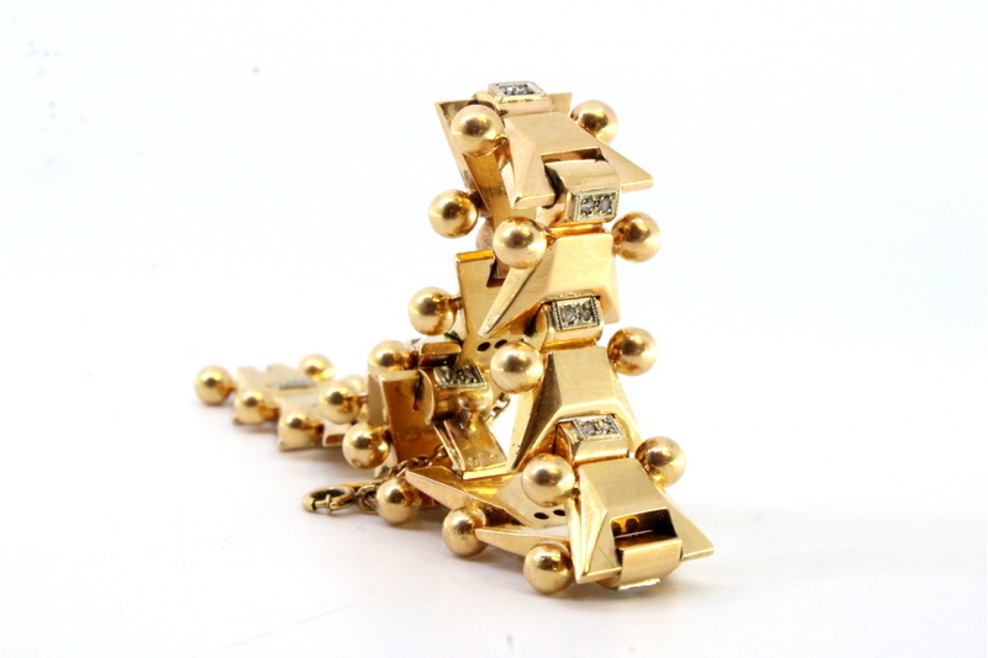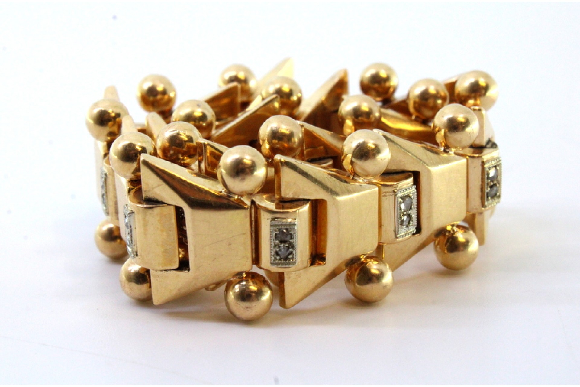 • Descrição: Pulseira em ouro de forma arliculada com lascas de diamantes e par bolas em cada elo, ao estilo Art Dêco.