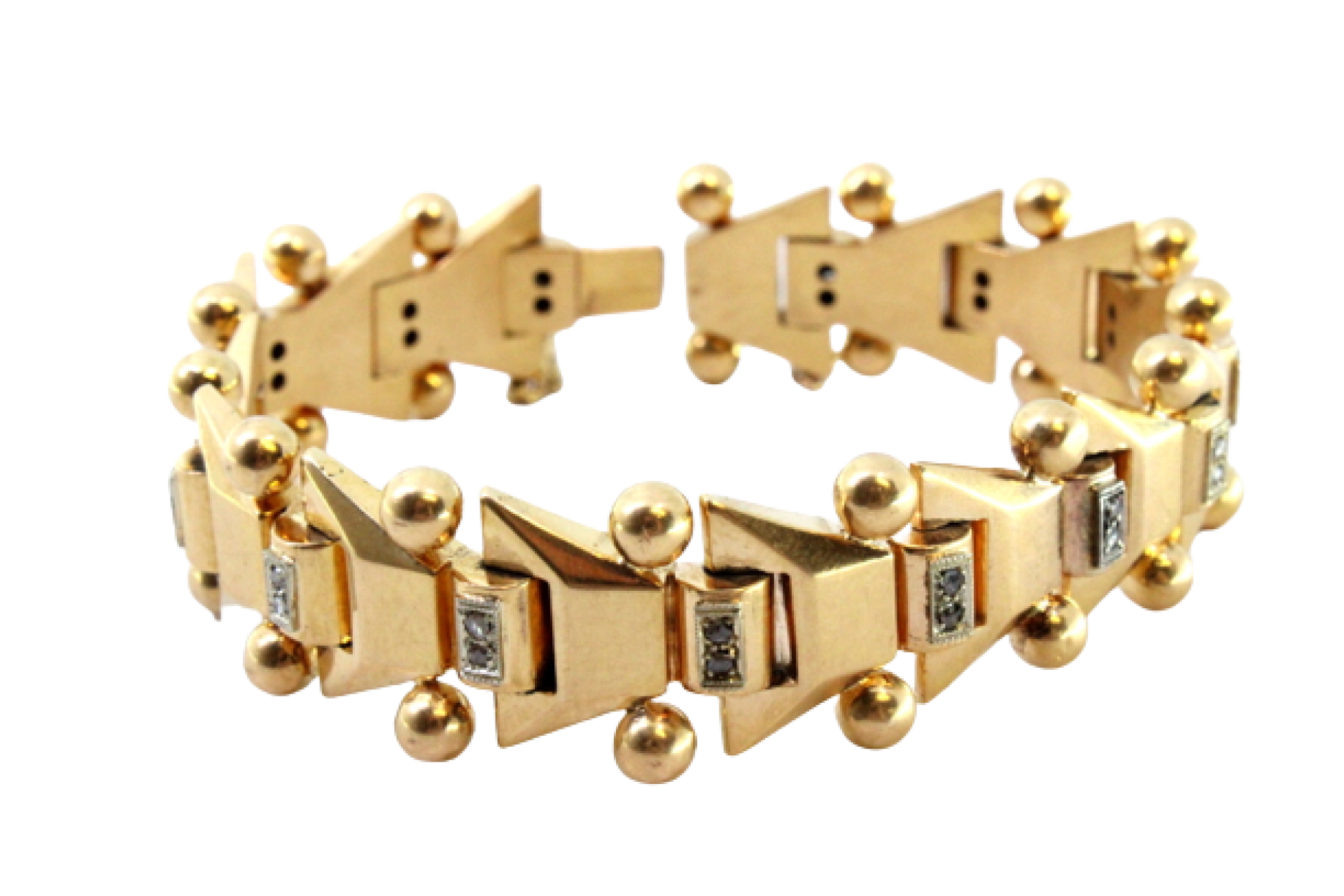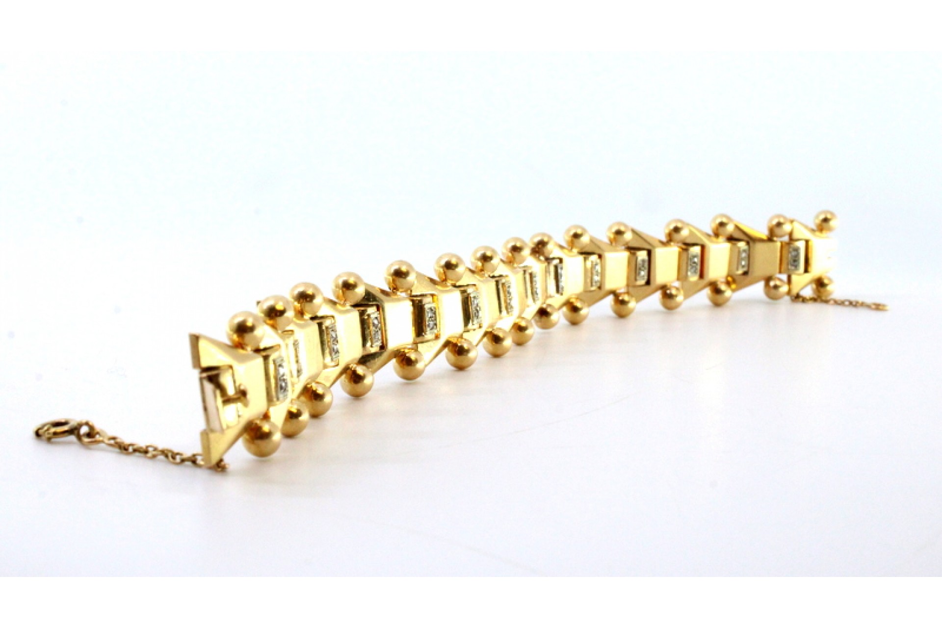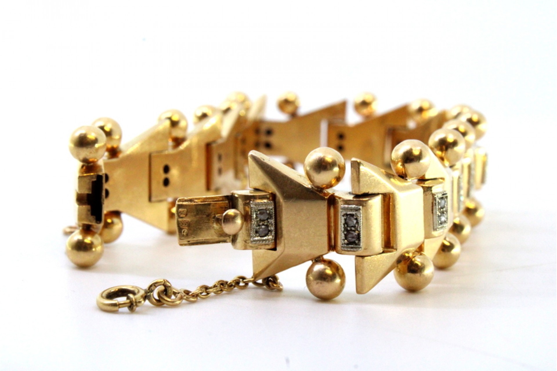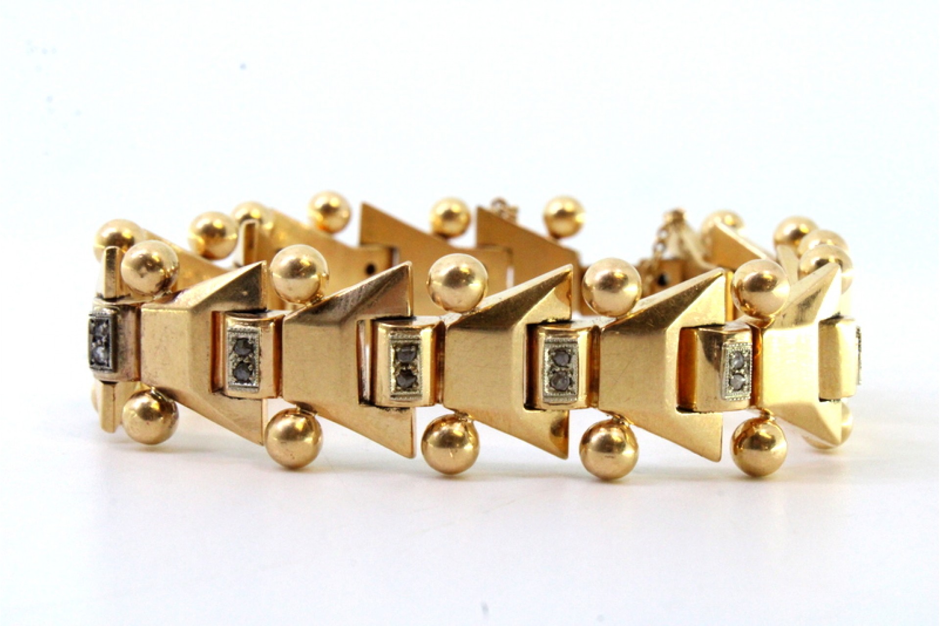 • Descrição: Pulseira em ouro de forma arliculada com lascas de diamantes e par bolas em cada elo, ao estilo Art Dêco.