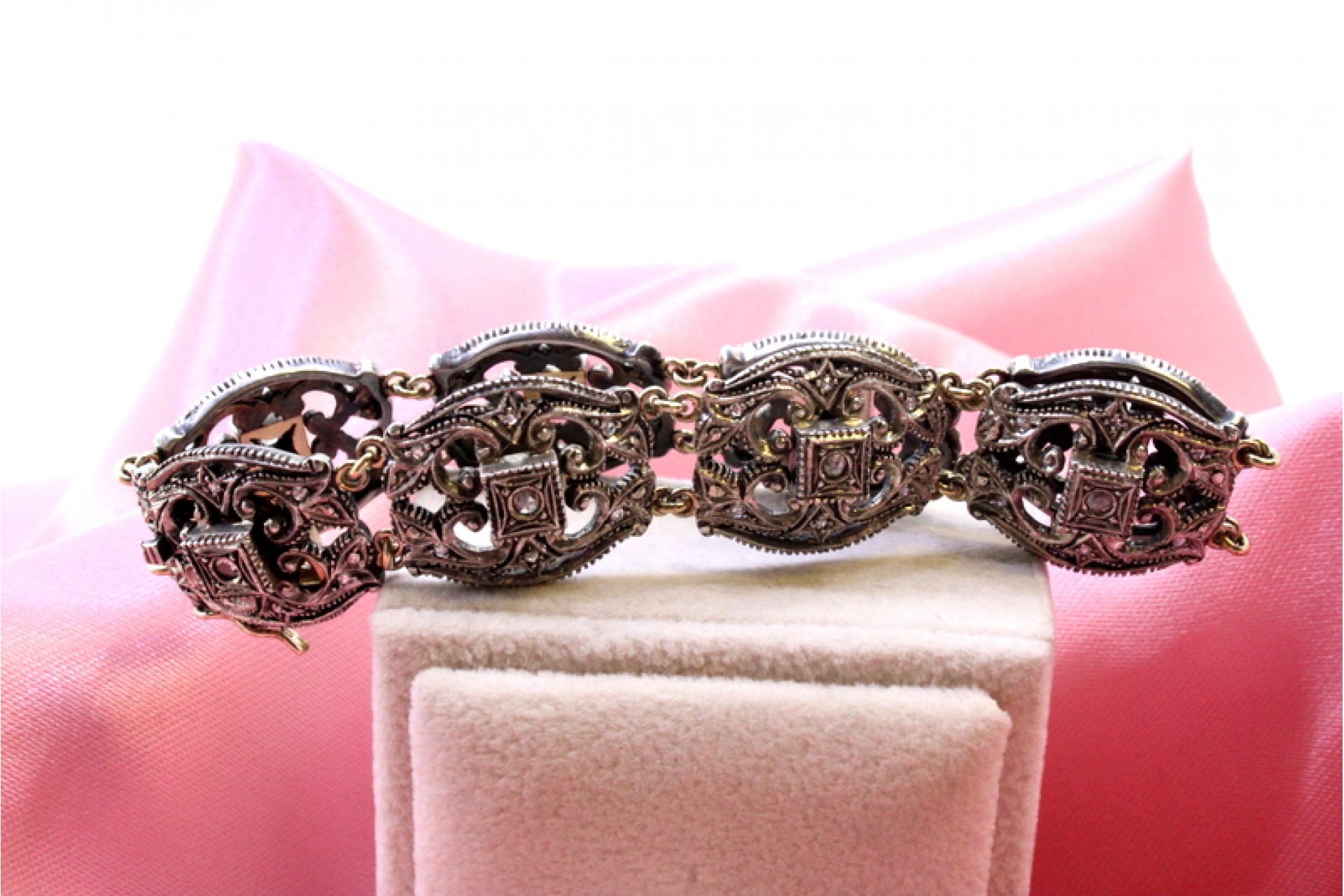 • Descrição: Pulseira em ouro e prata com diamantes coroados no centro de cada elo, fecho de segurança duplo.