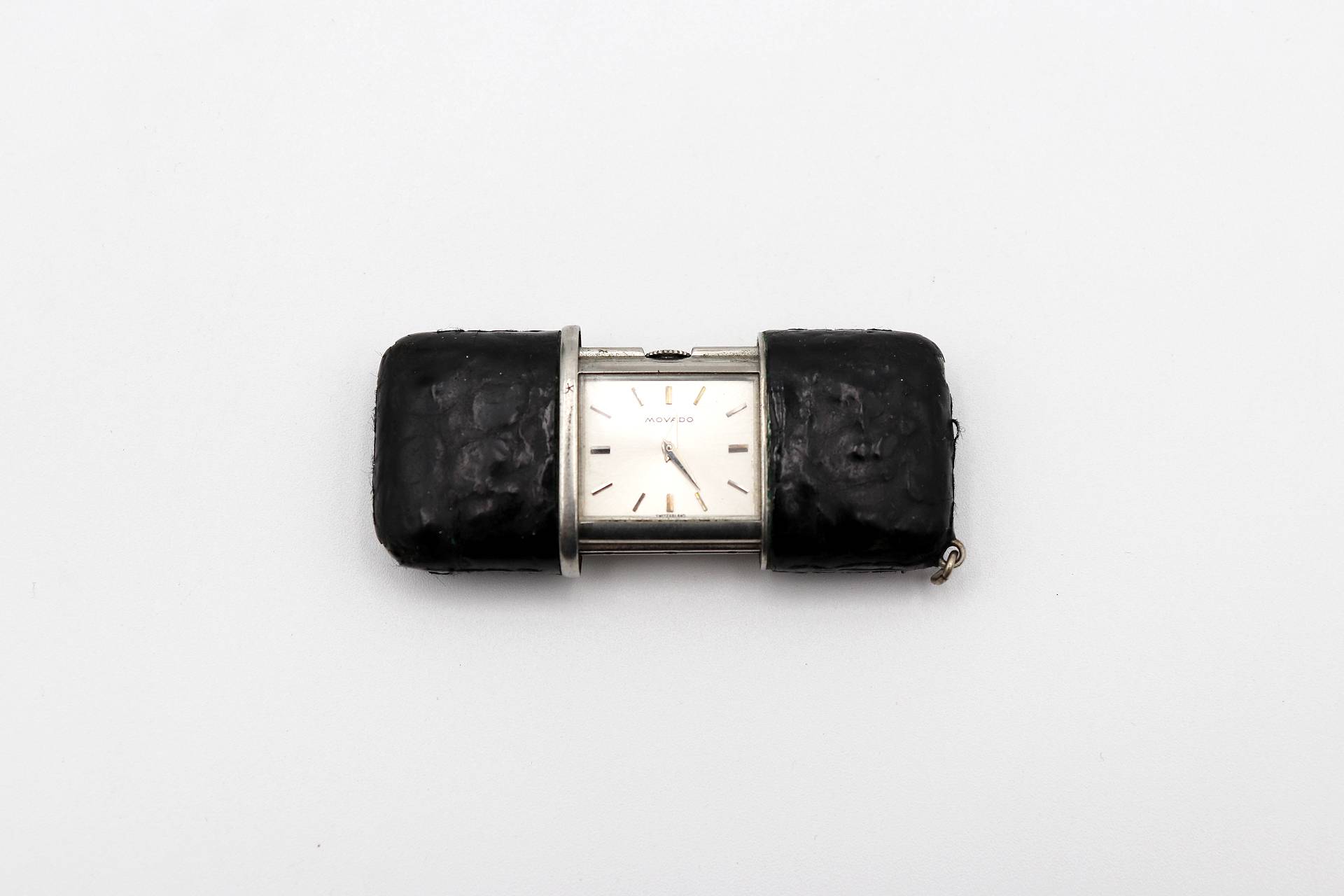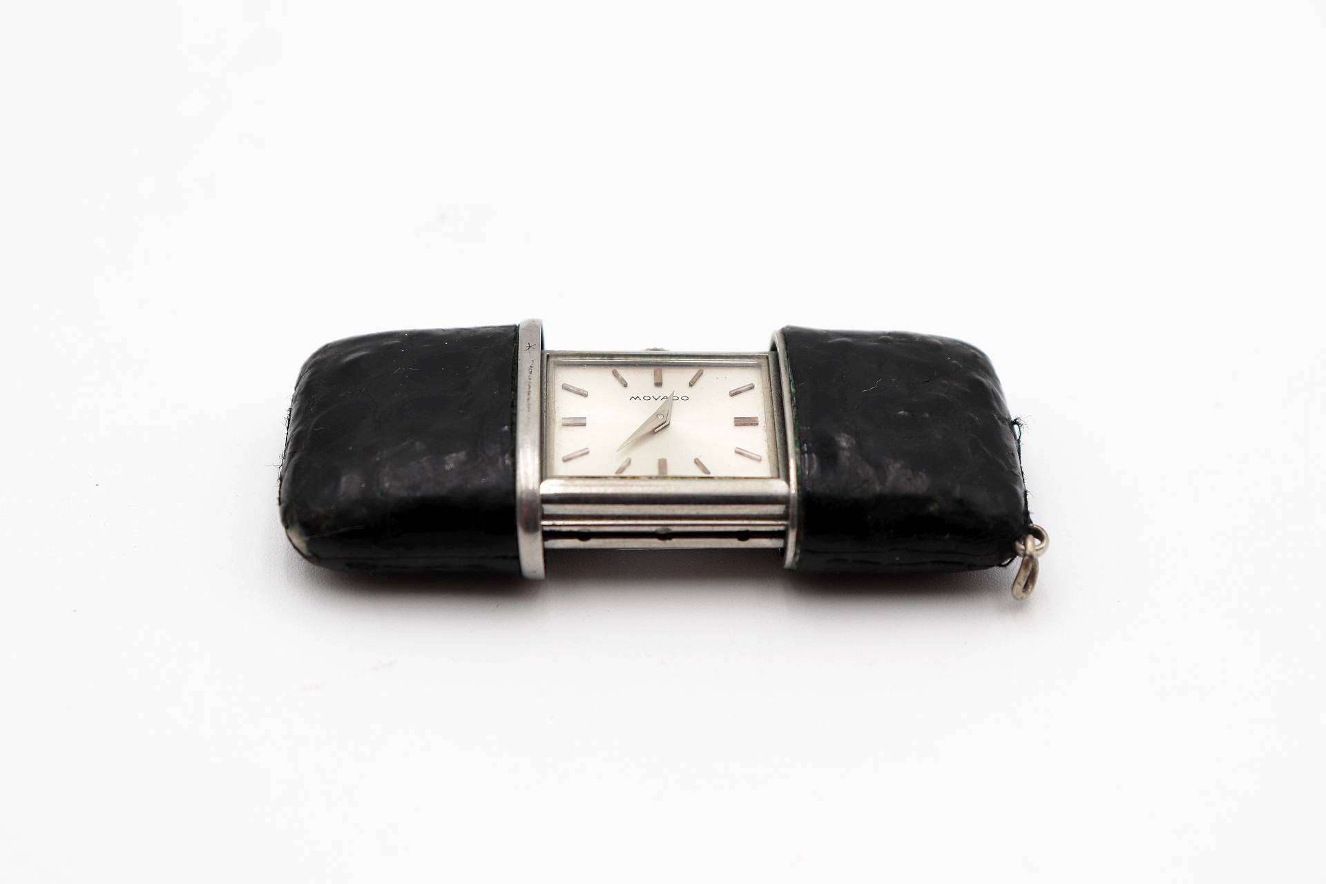 • Descrição: Relógio de viagem Movado com capa em pele preta, sistema mecânico e argola de supensão.
