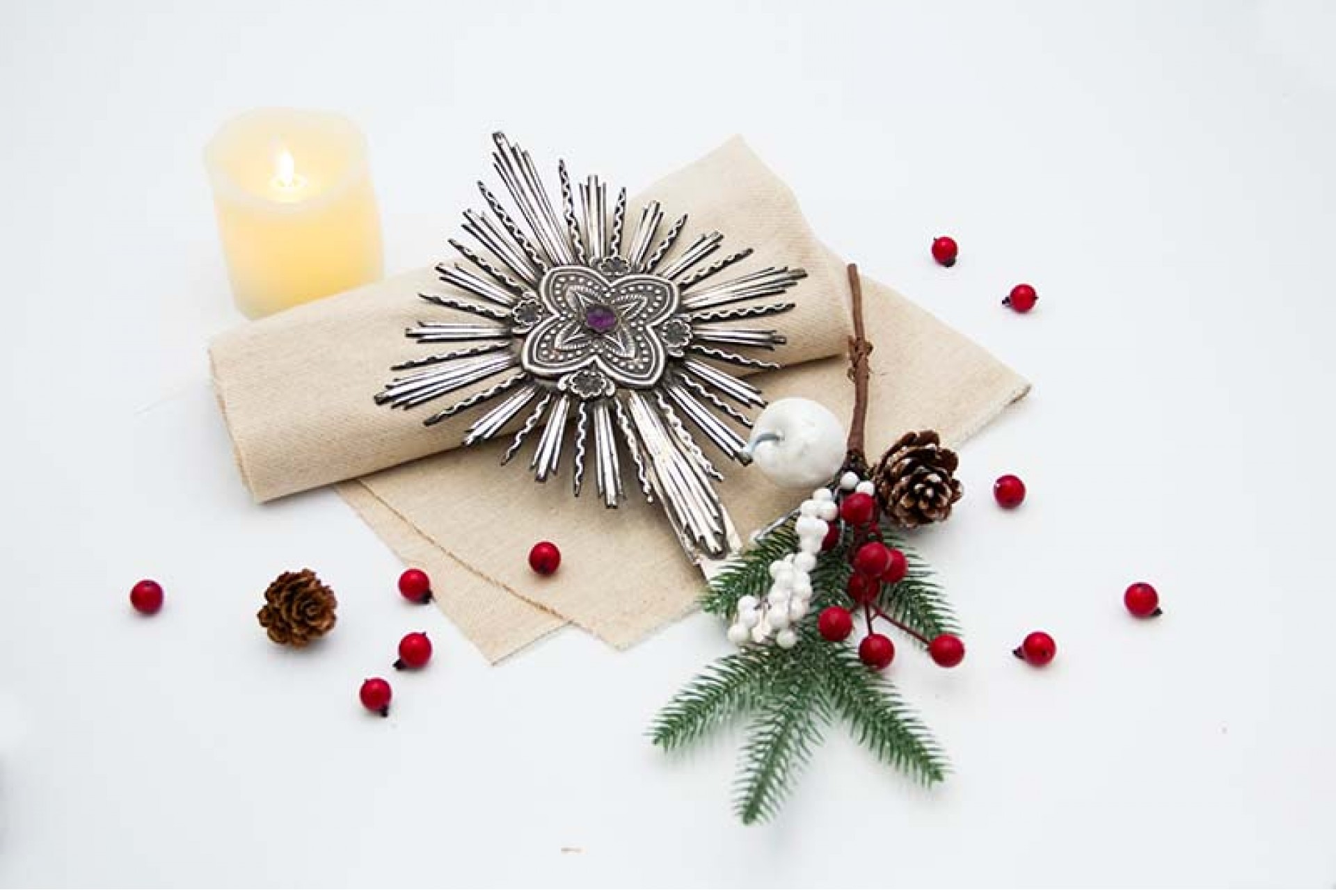 • Descrição: Resplendor de prata com relevos e pedra sintética em formato cabochão no centro.