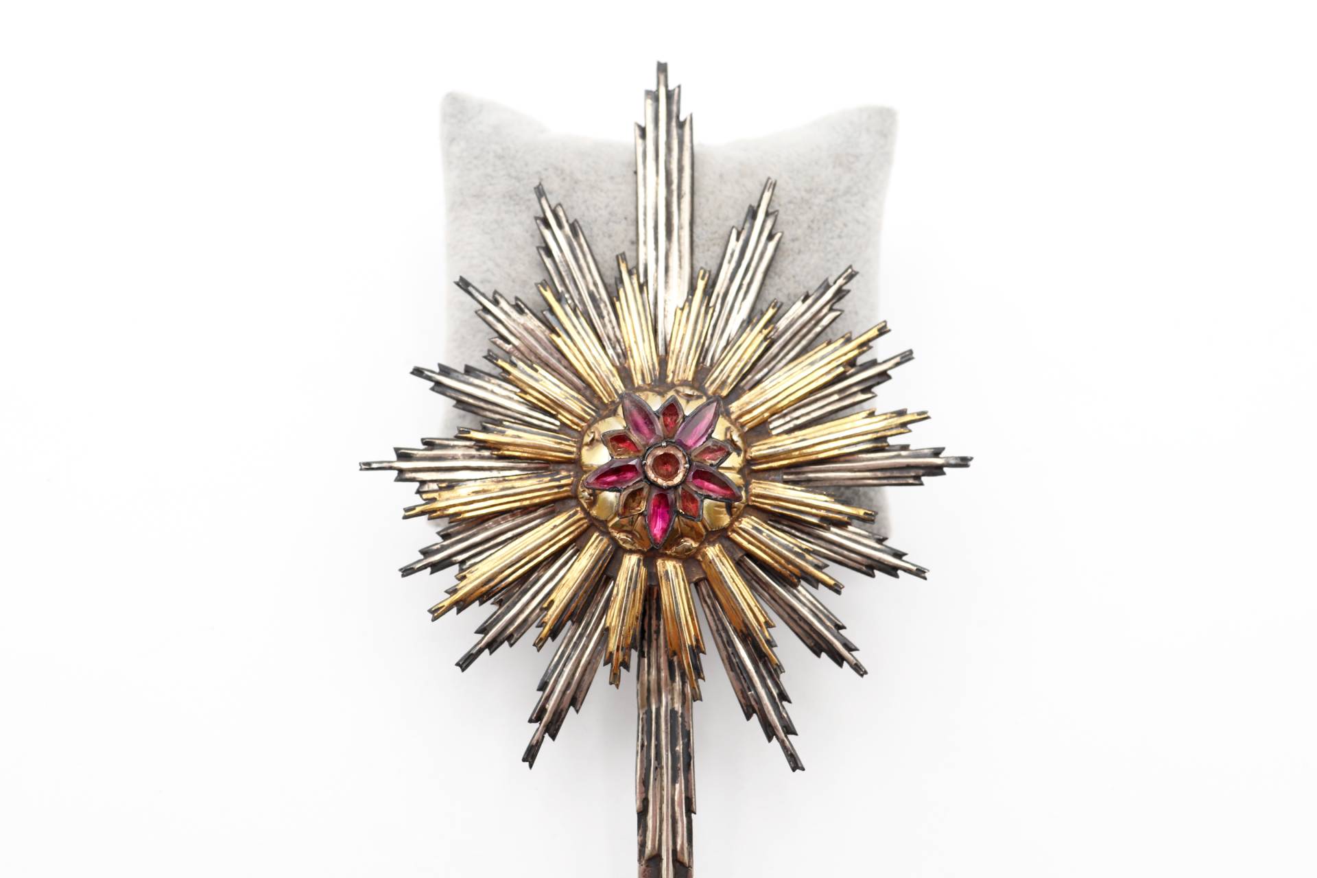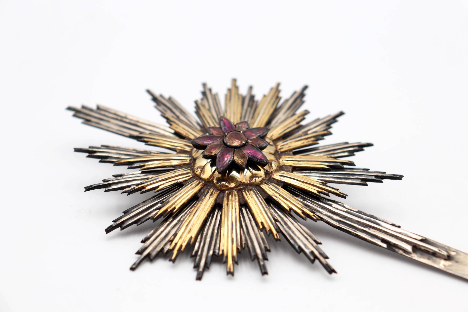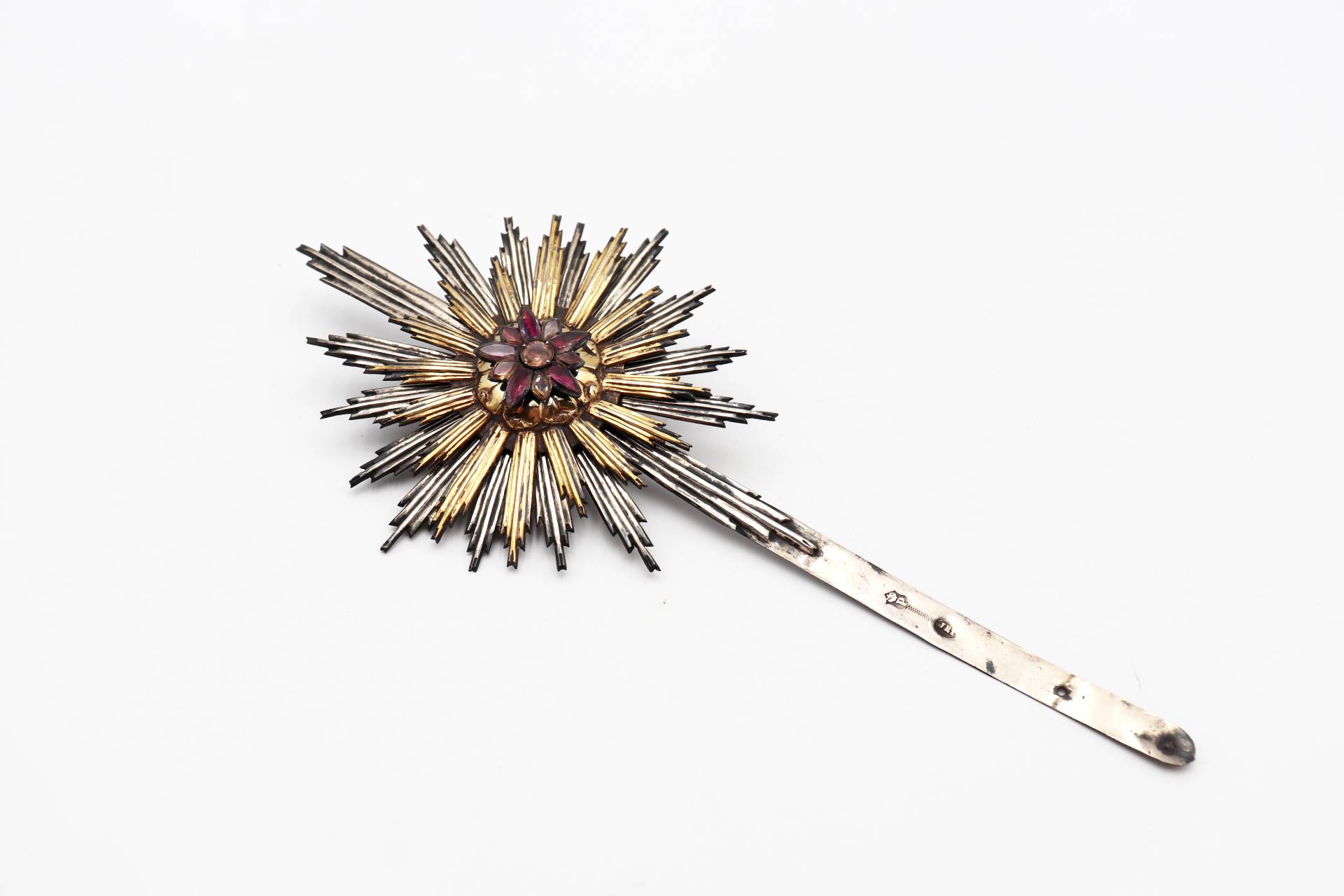 • Descrição: Resplendor de prata bicolorcom relevos e quartzes forrados no centro.
