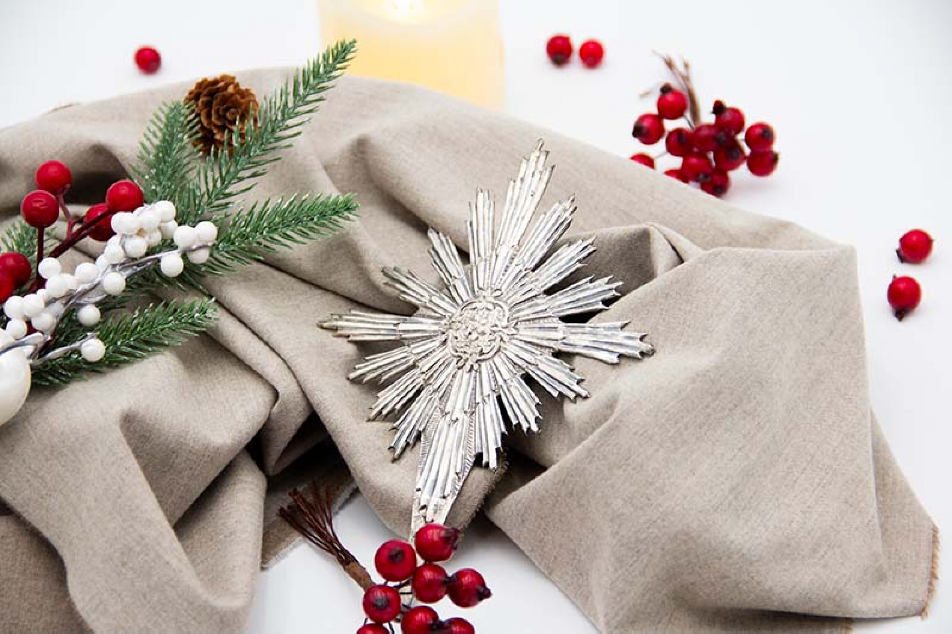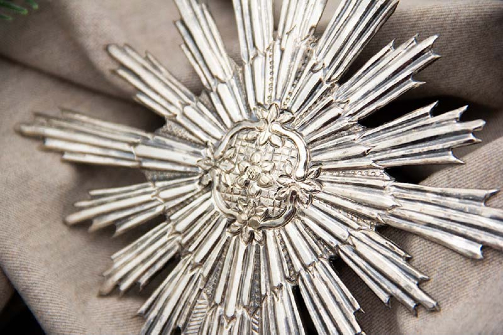 Resplendor de prata relevada com motivos florais no centro.