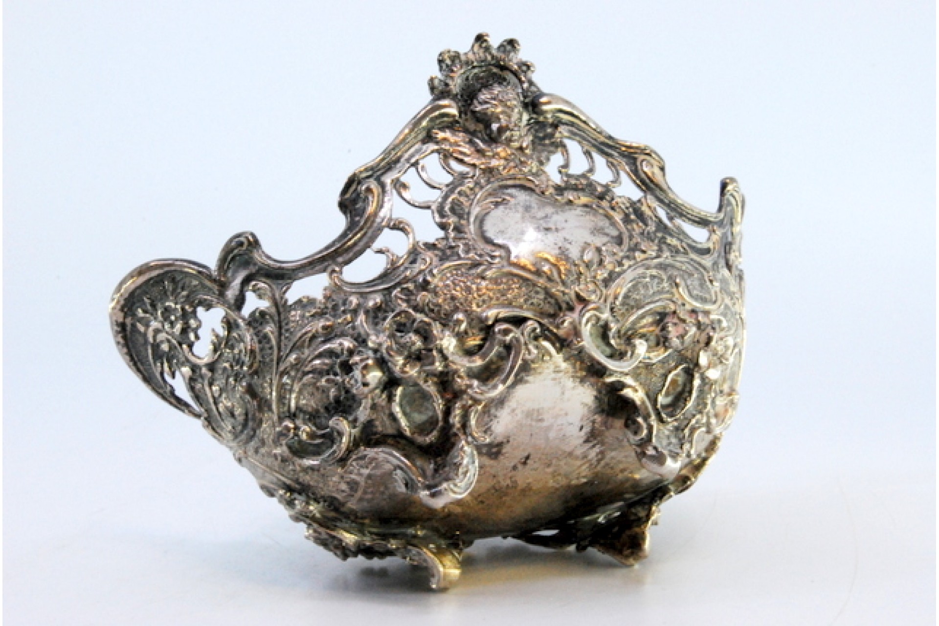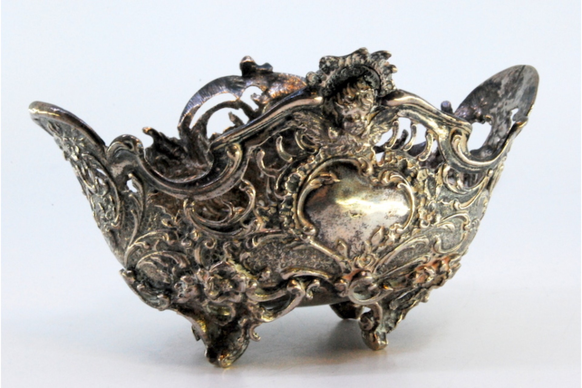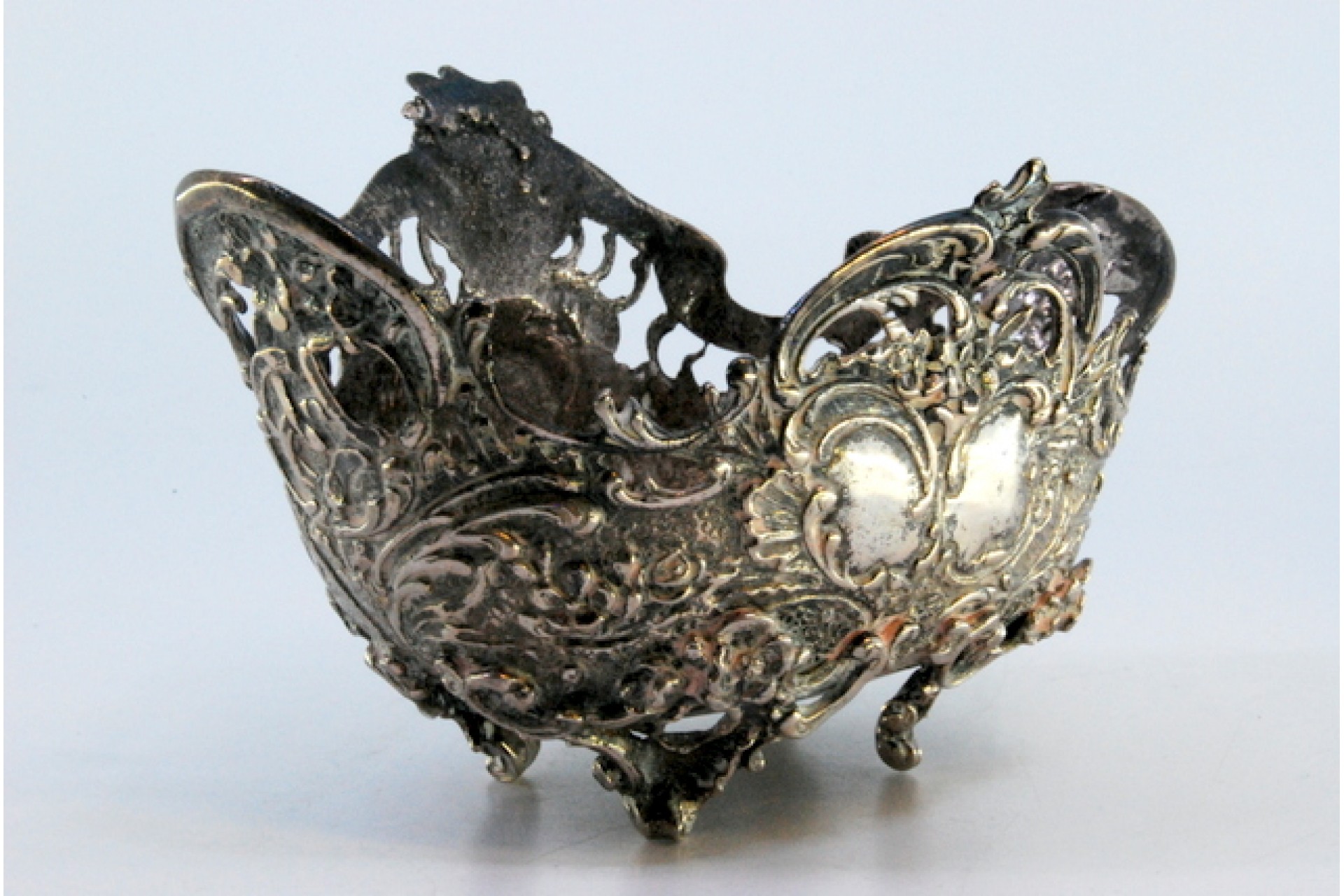 • Descrição: Saboneteira em prata recortada com motivos florais, elementos vegetalistas e assente em quatro pés.