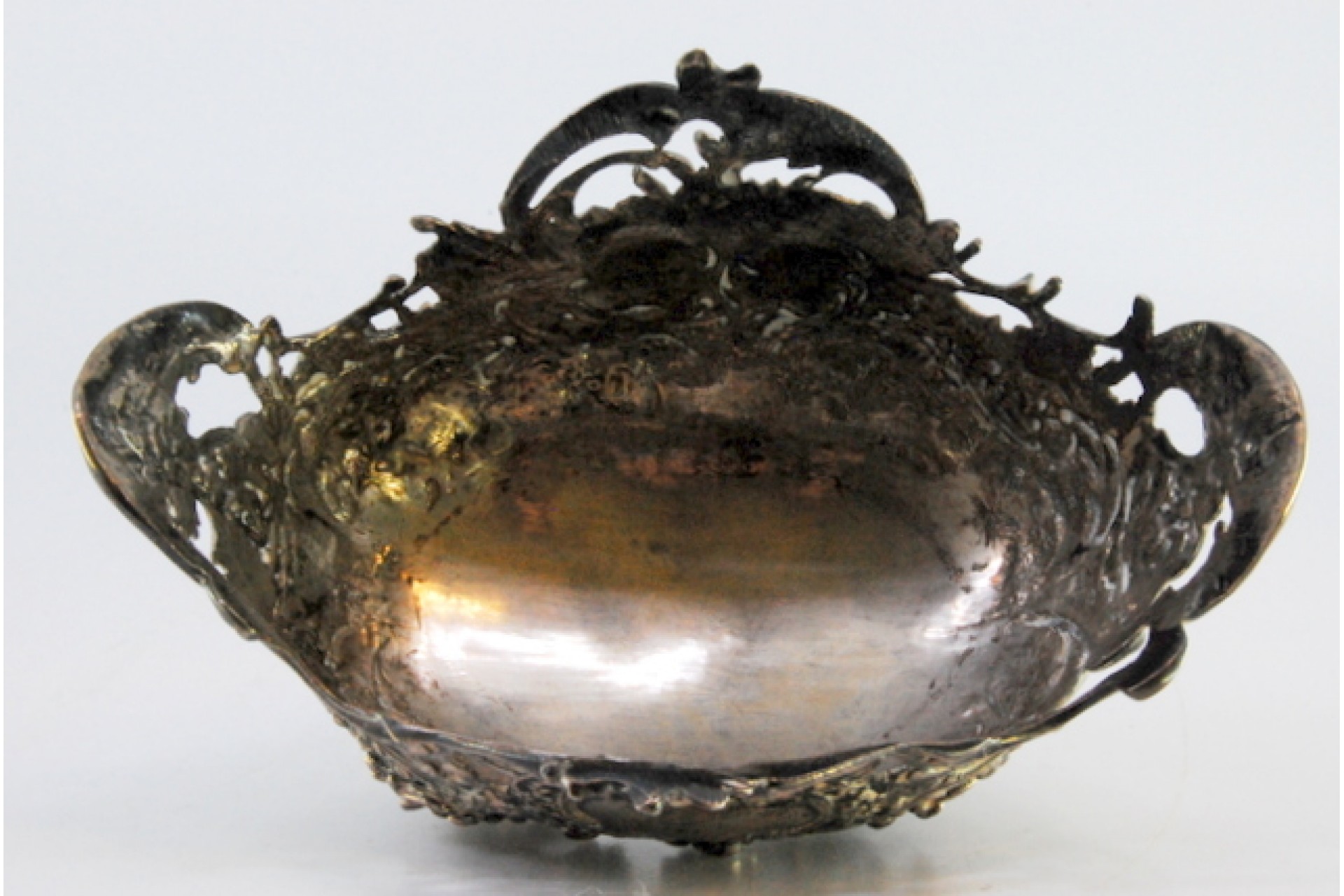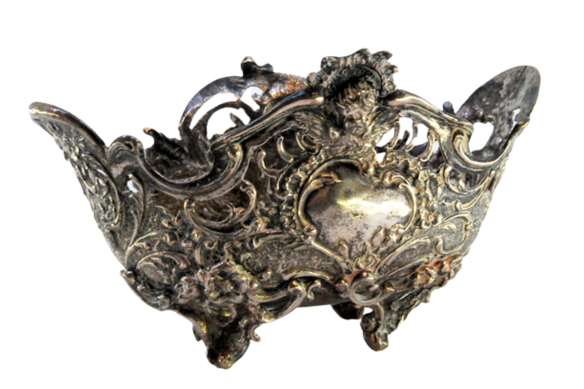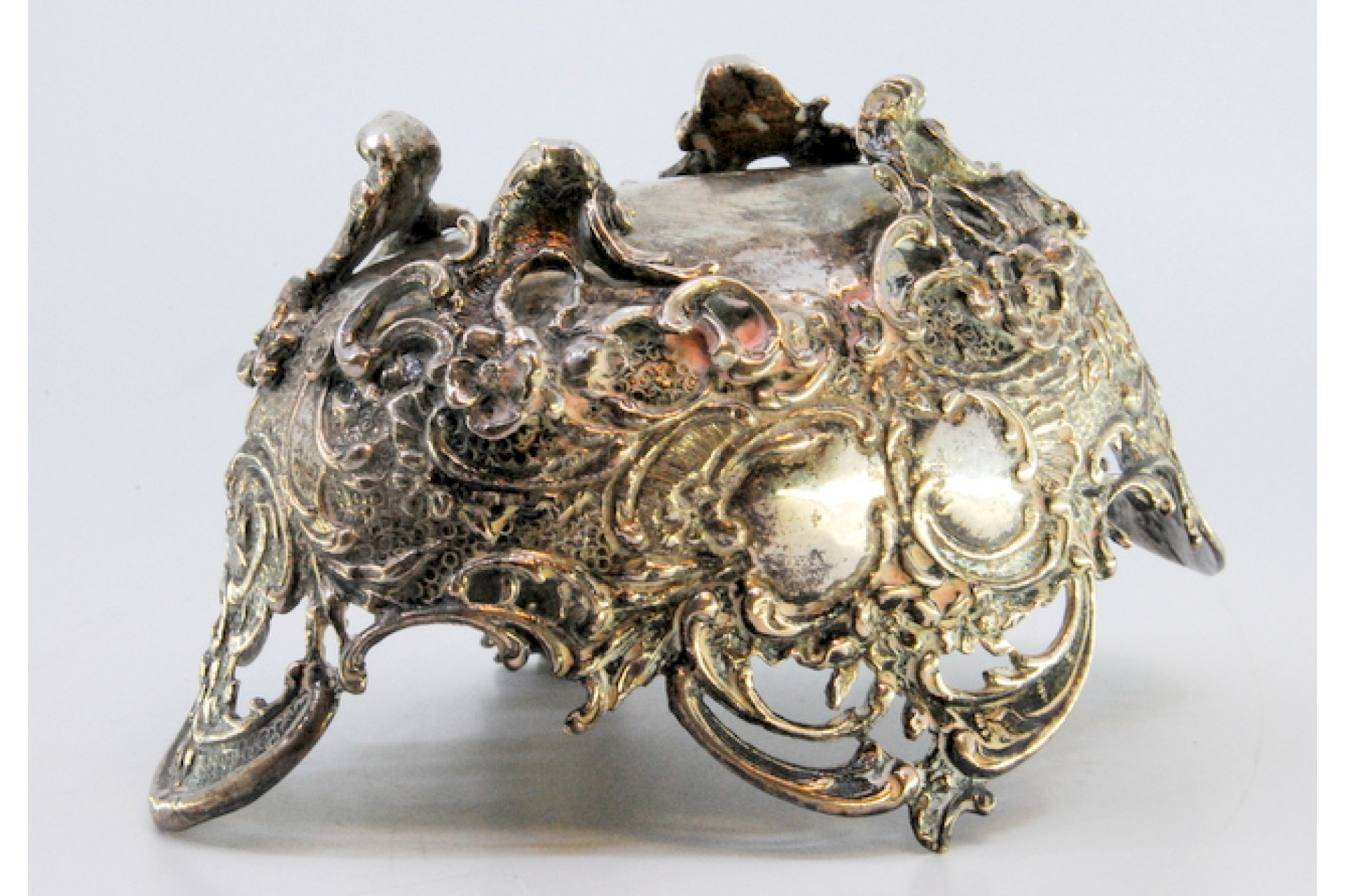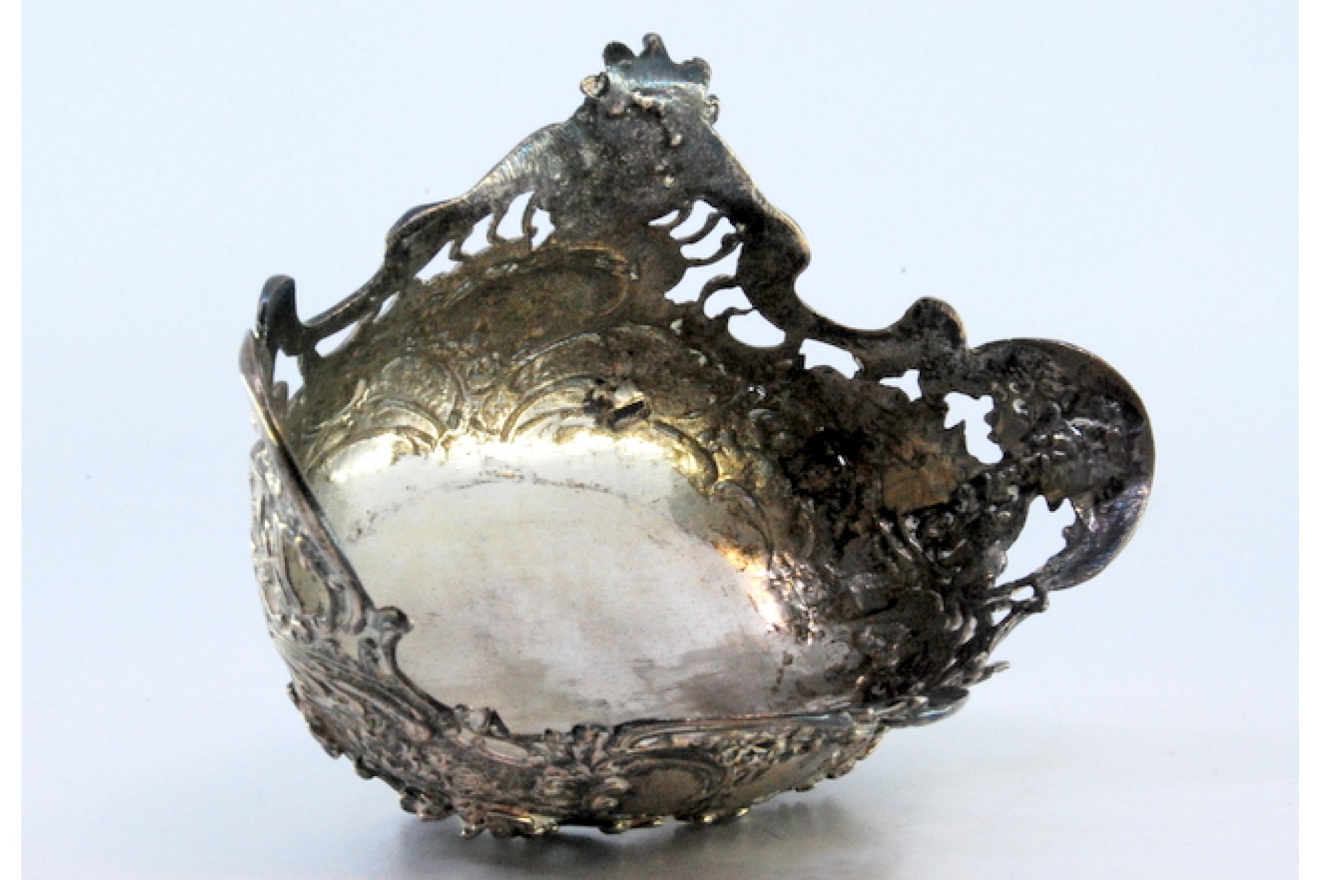 • Descrição: Saboneteira em prata recortada com motivos florais, elementos vegetalistas e assente em quatro pés.