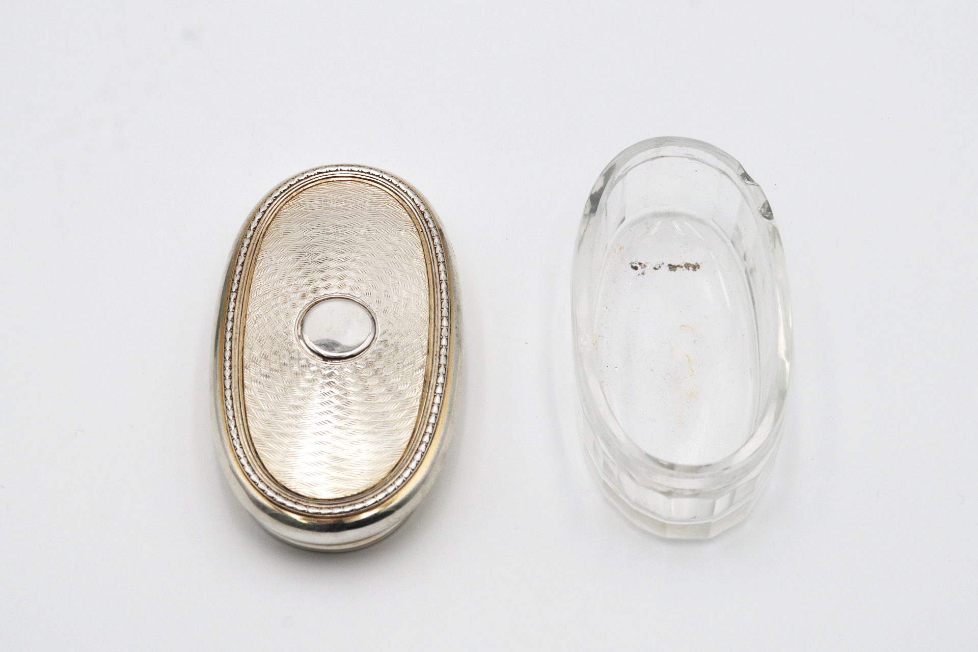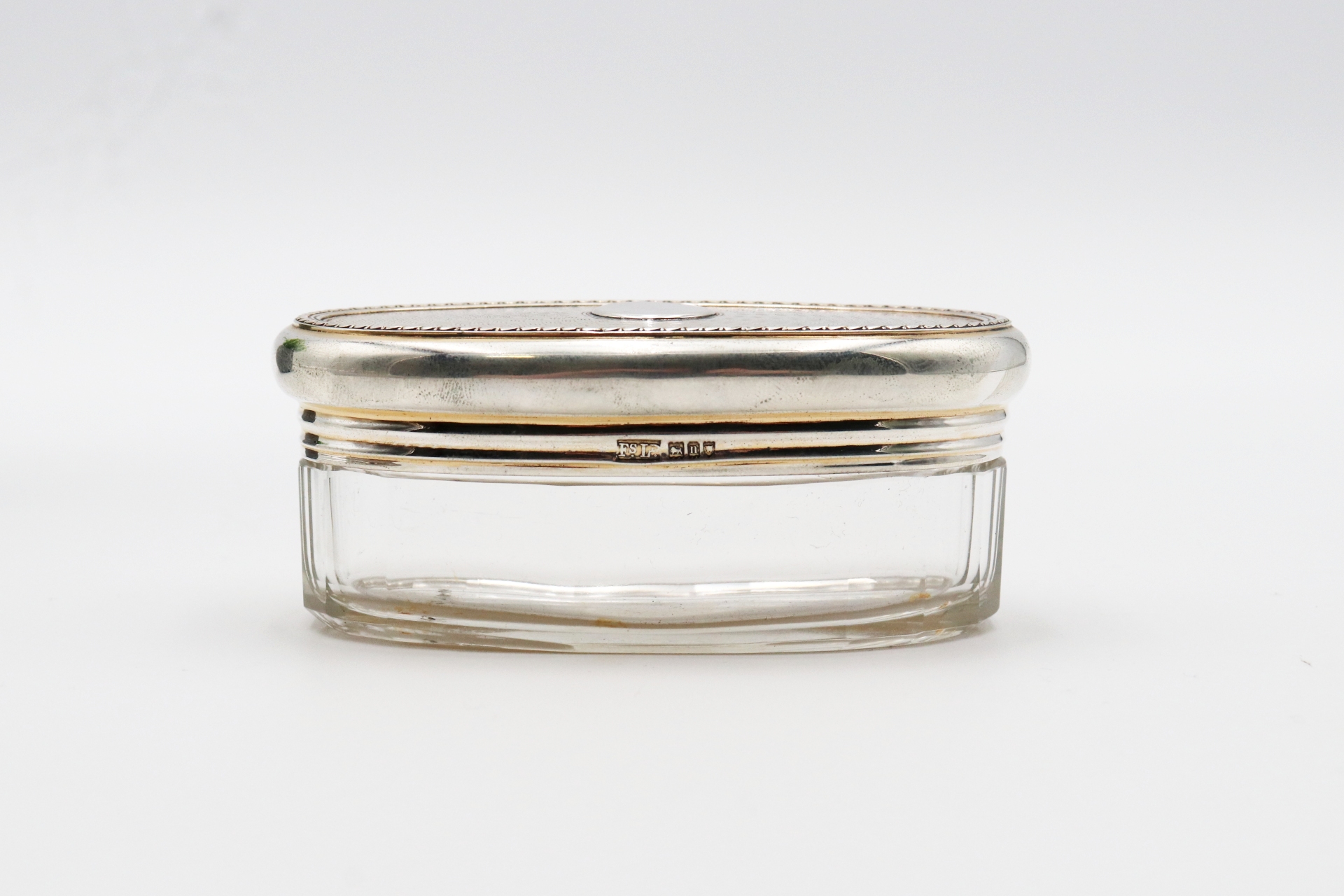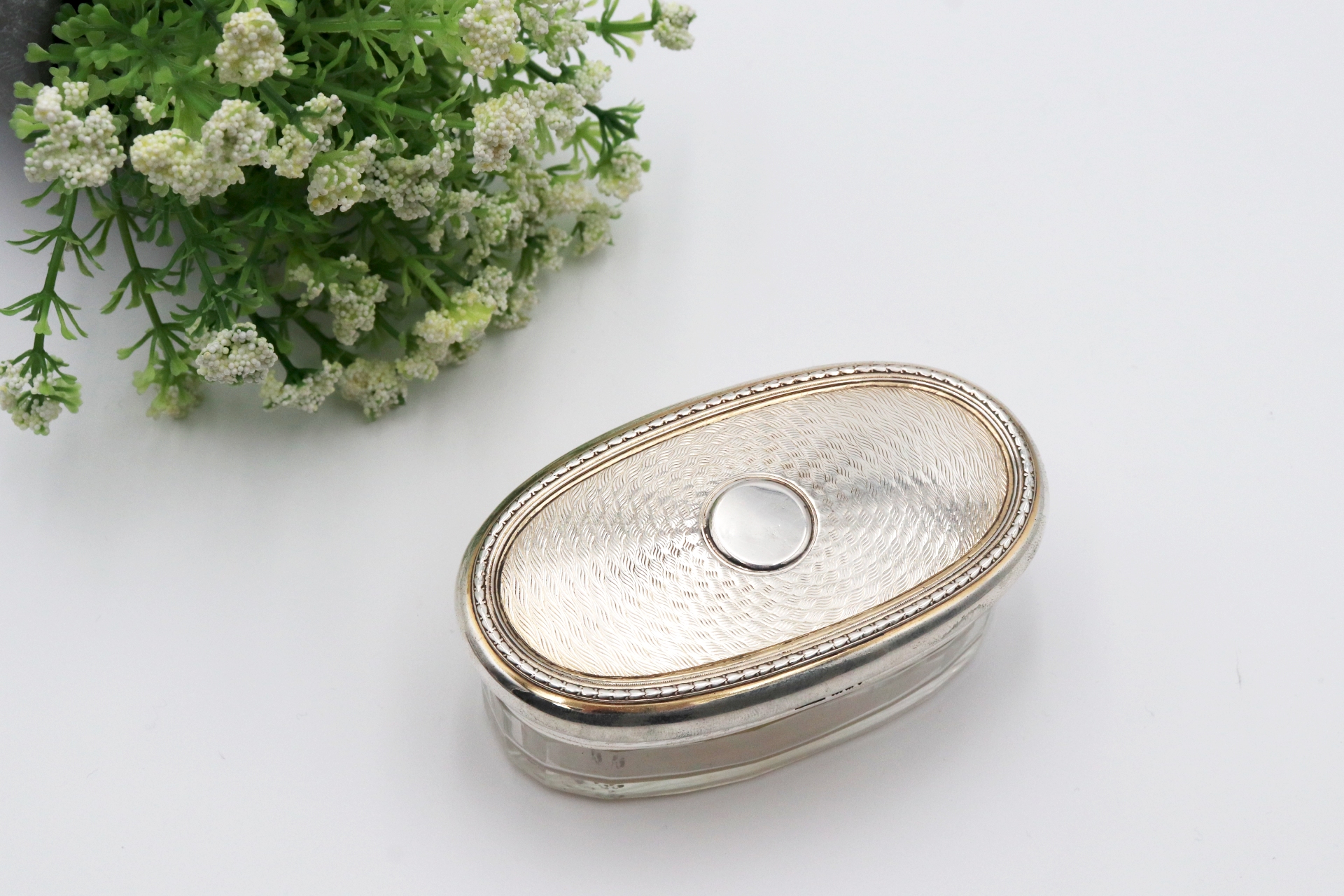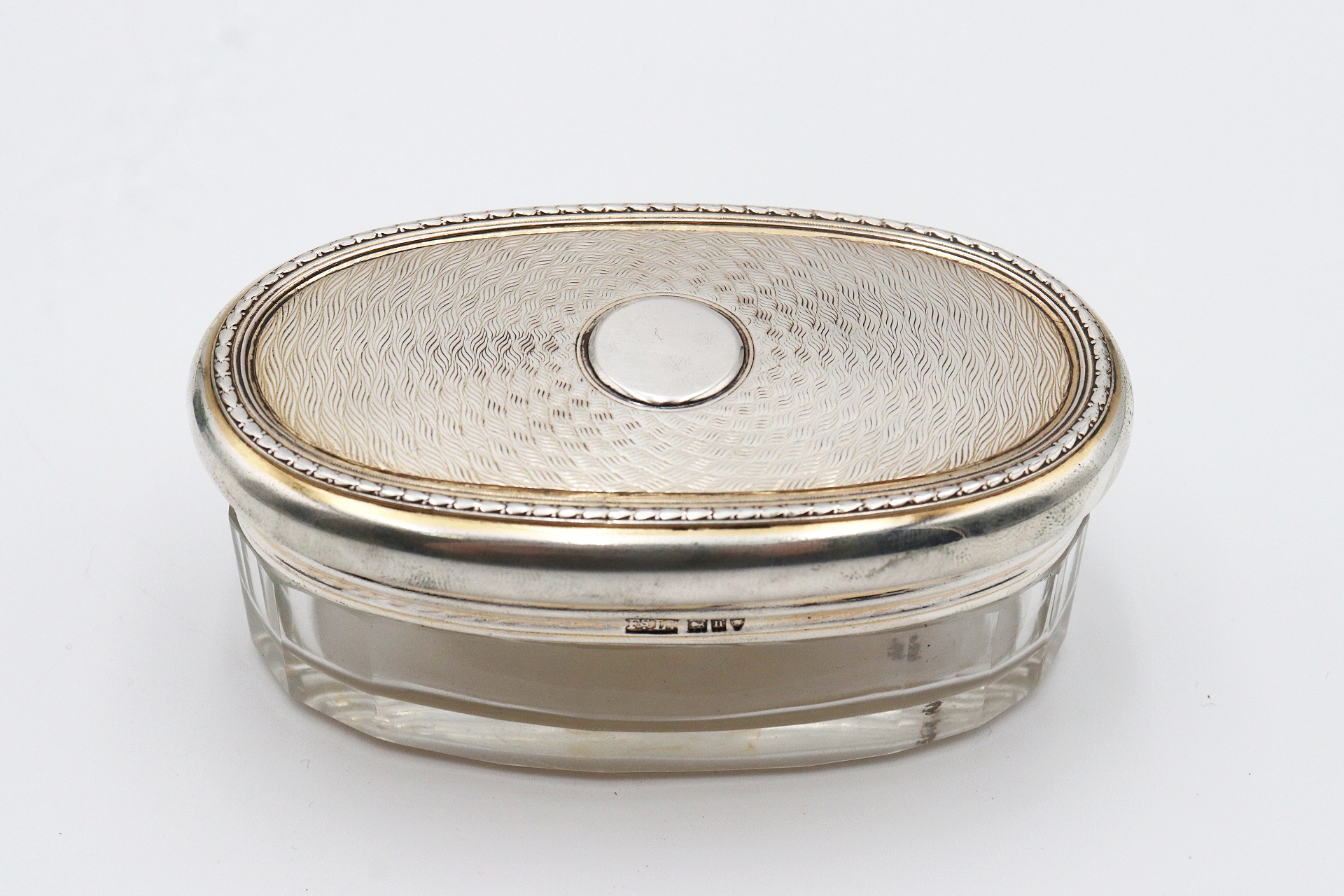 • Descrição: Saboneteira de vidro com tampa amovível em prata guilhochada com friso na envolvência e cartela para monograma.