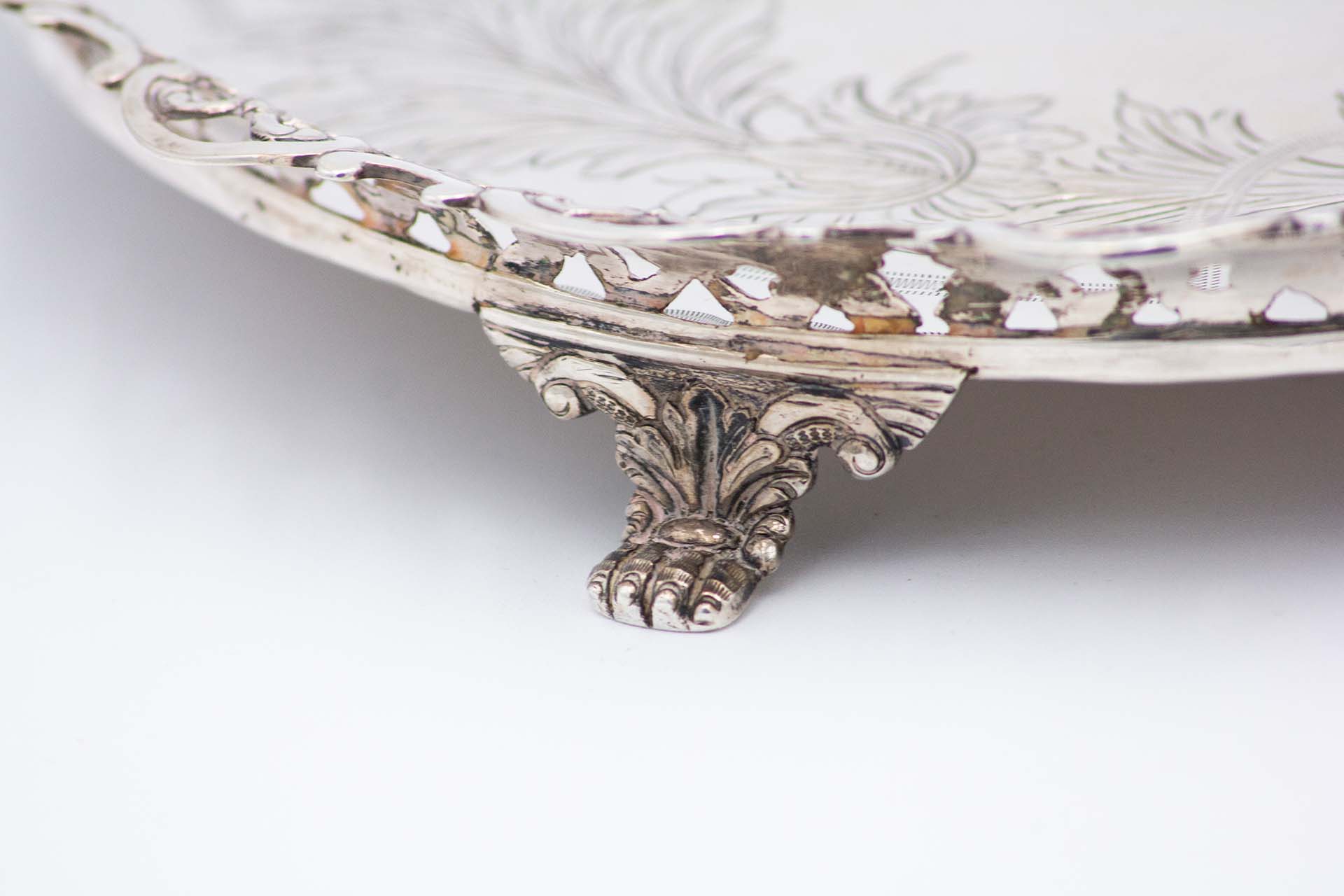 • Descrição: Salva bilheteira em prata com gradinha recortada, motivos florais gravados e assente em três pés relevados.