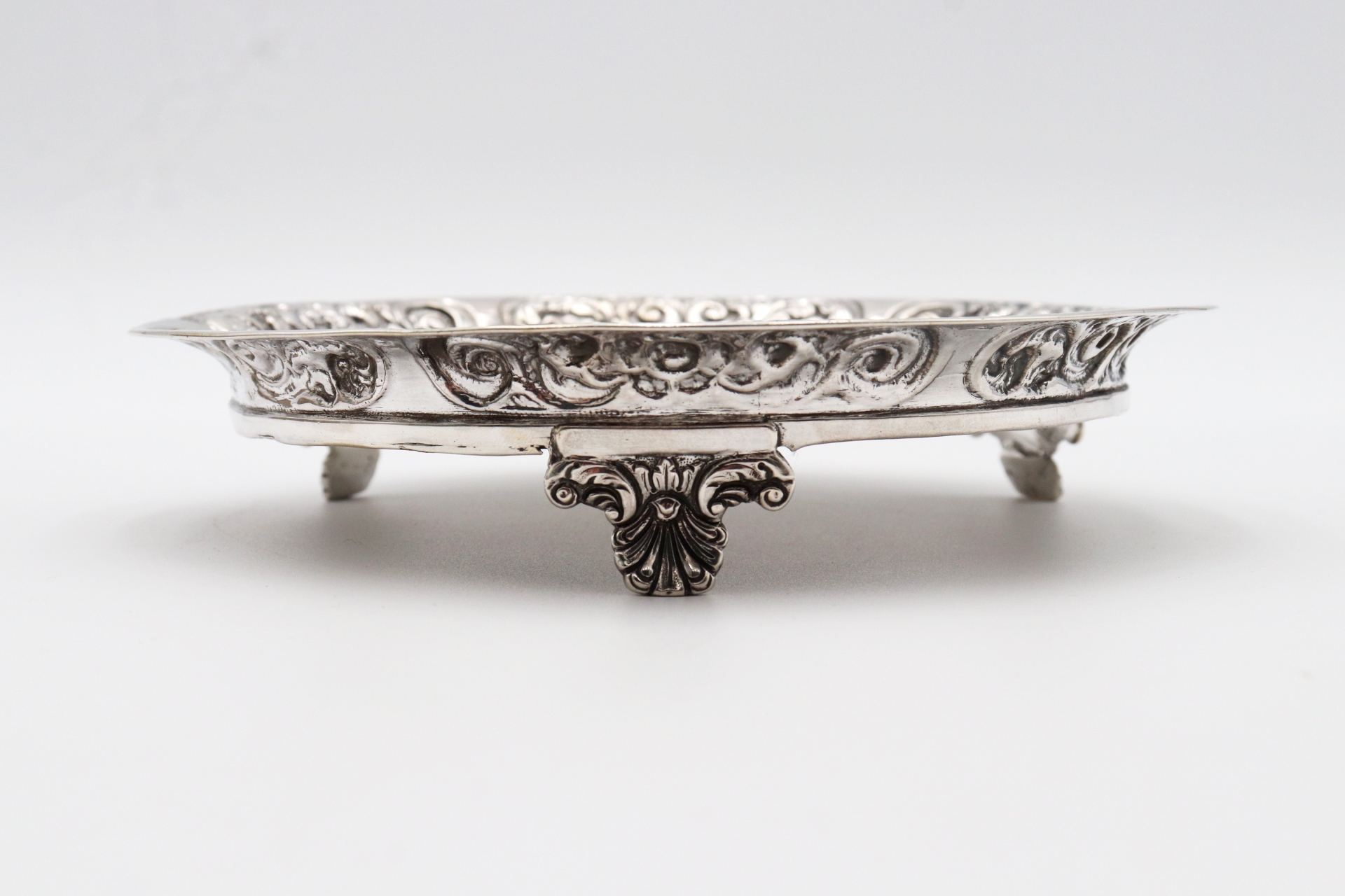 Salva bilheteira em prata com friso em alto relevo e três pés de apoio recortados.