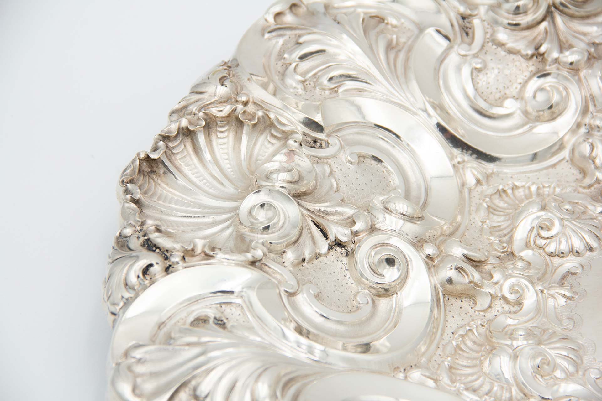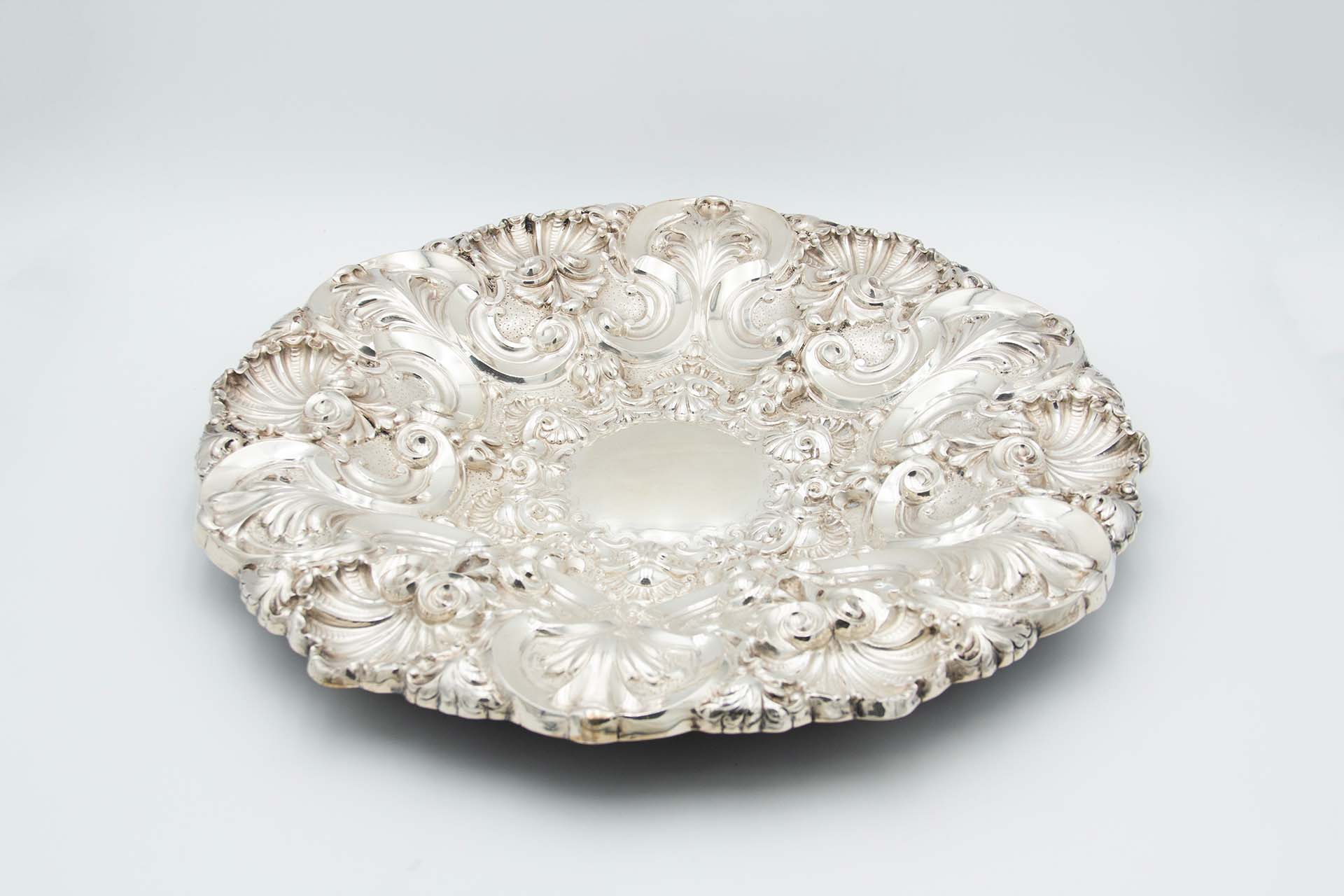 Salva de aparato ao estilo D. João V com motivos florais e conchas relevadas.