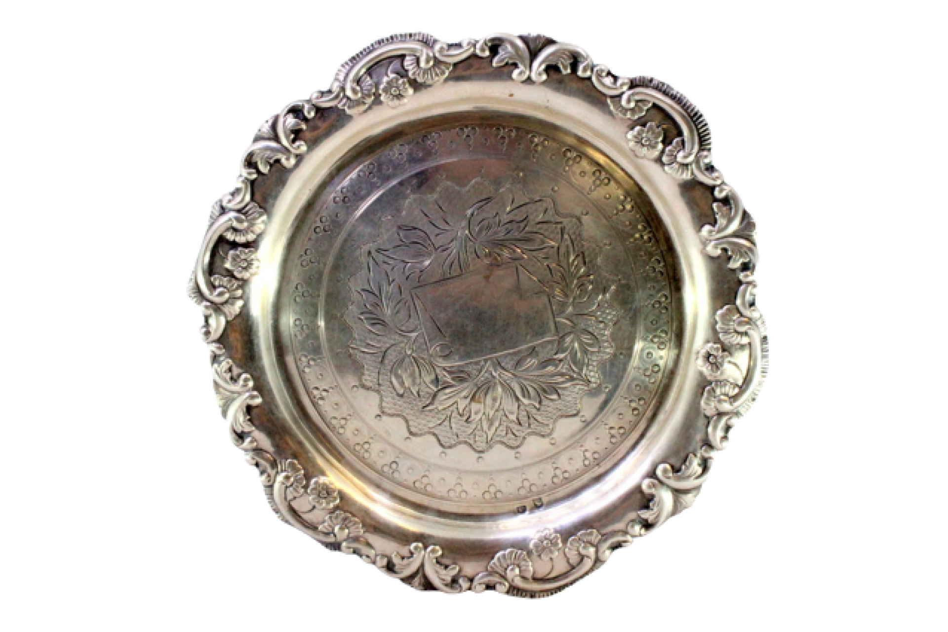 Salva/bilheteira em prata com relevos e motivos florais gravados envolvendo cartela para monograma, assente em três pés recortados.