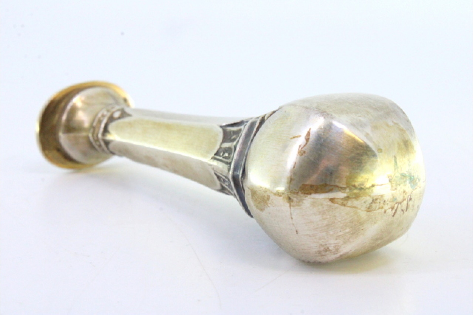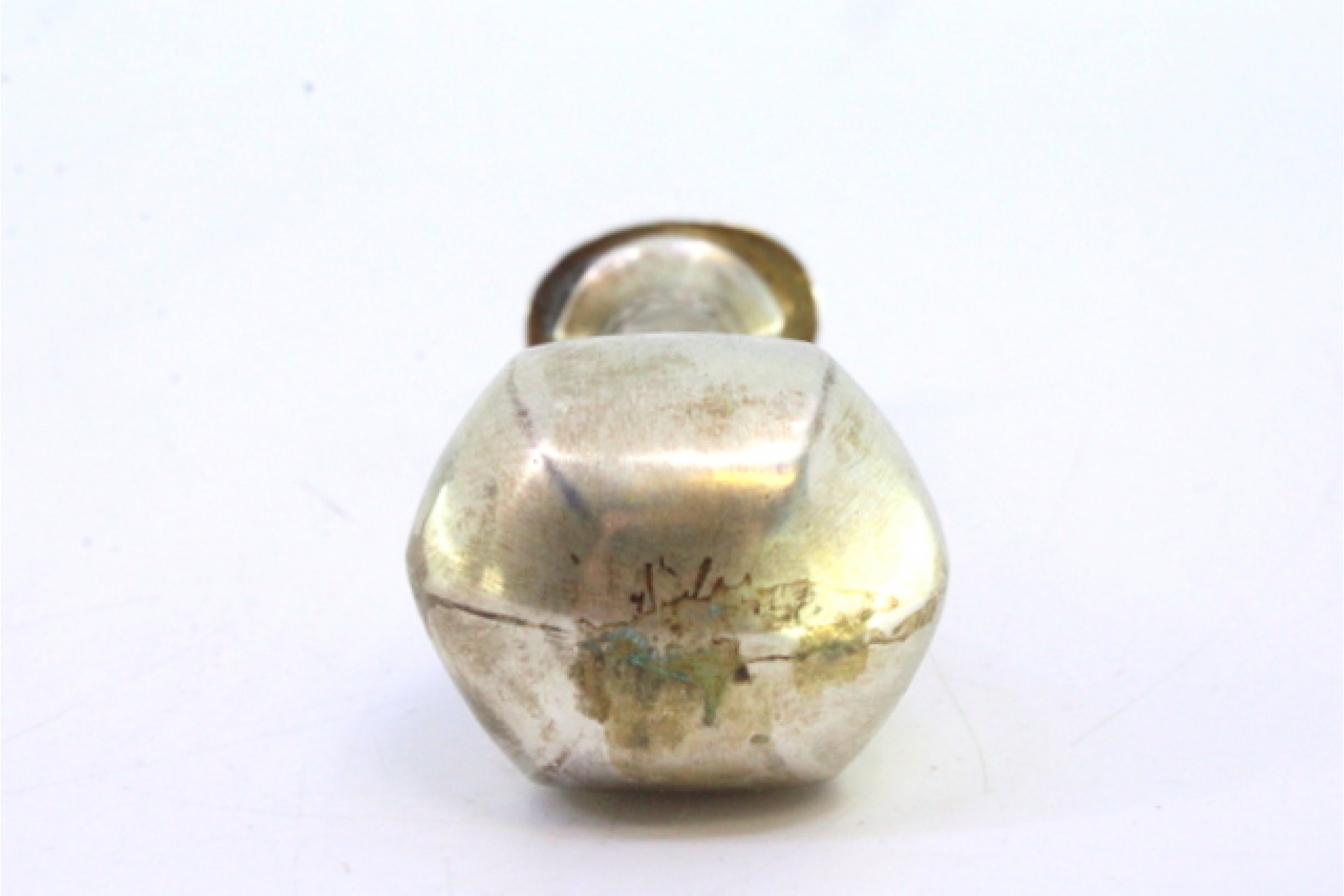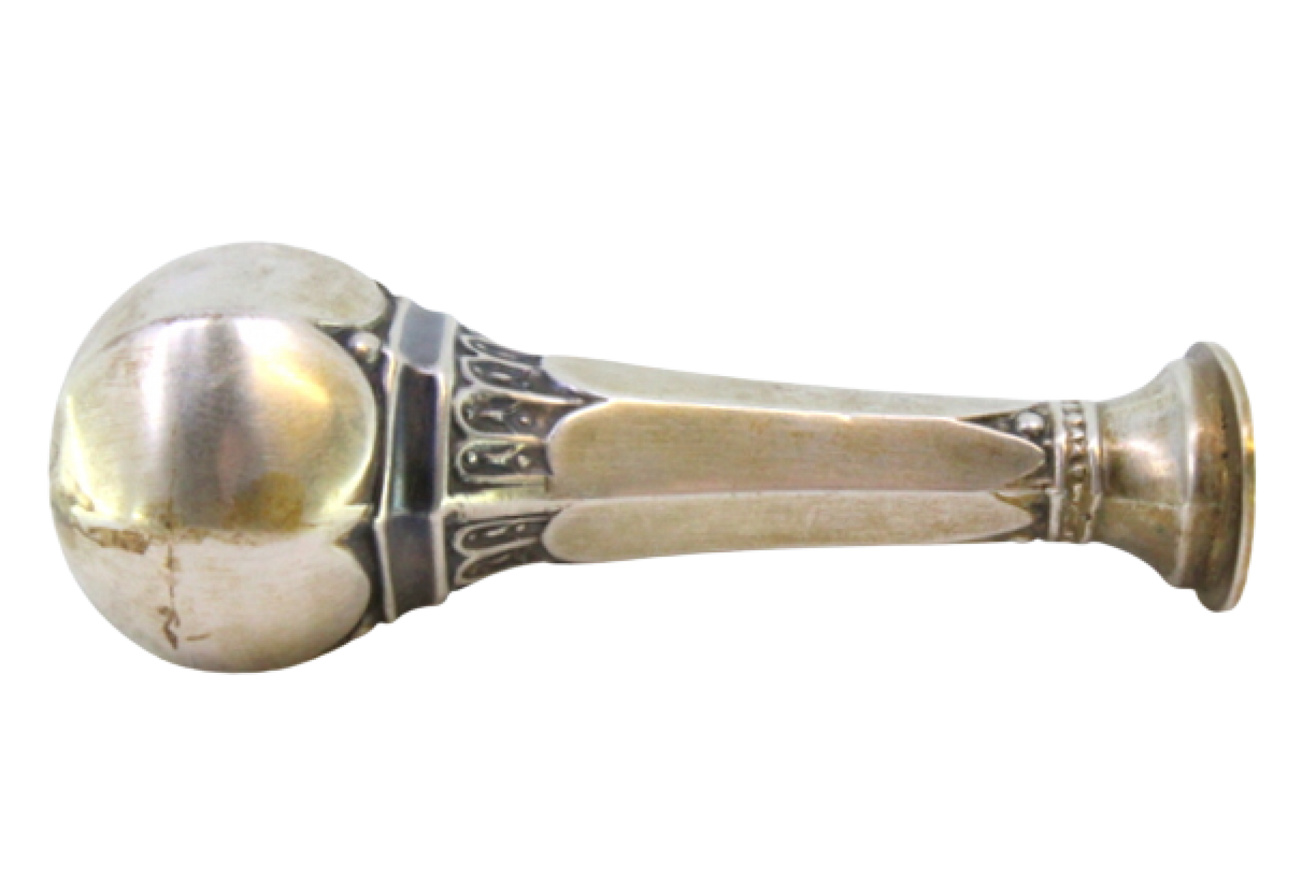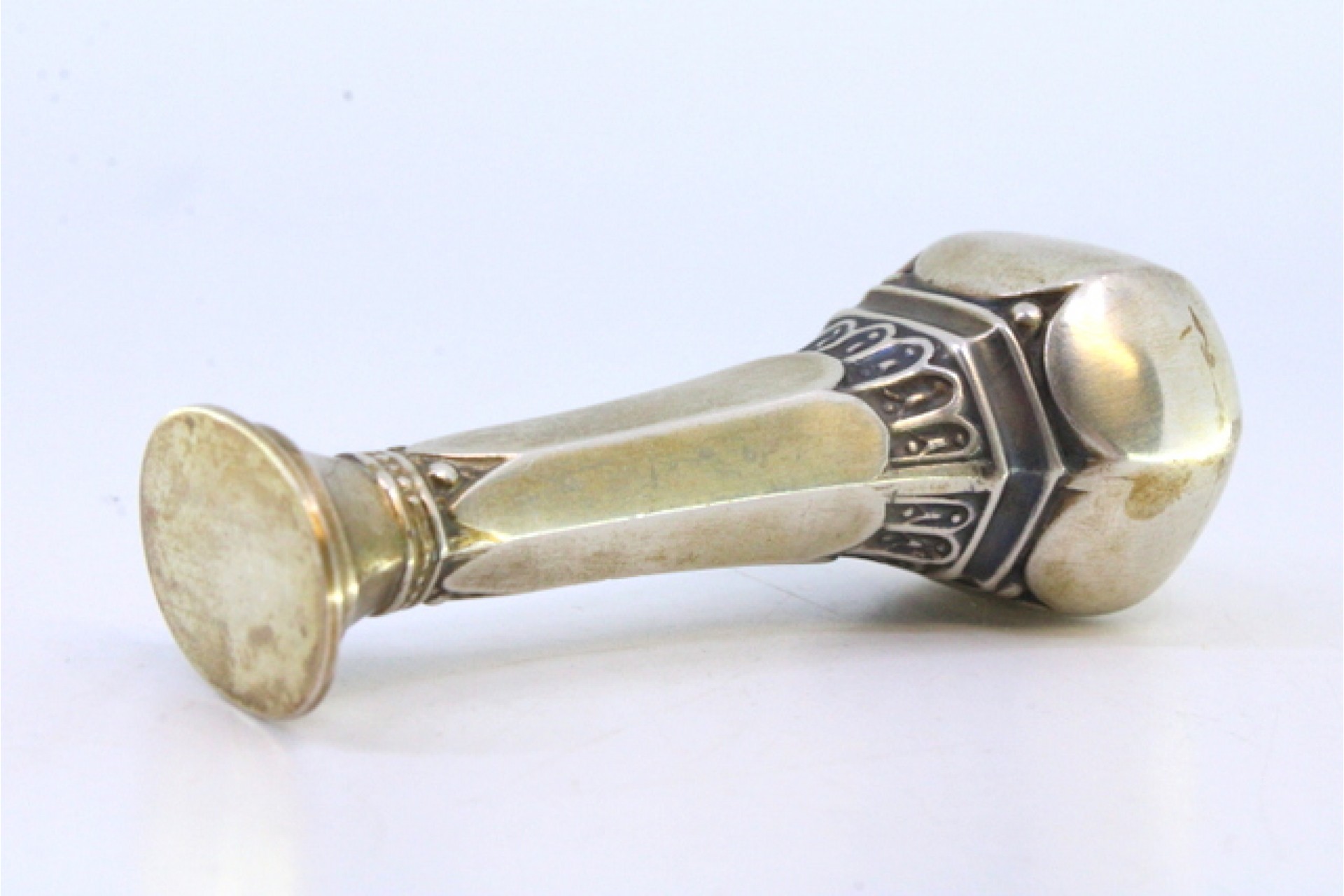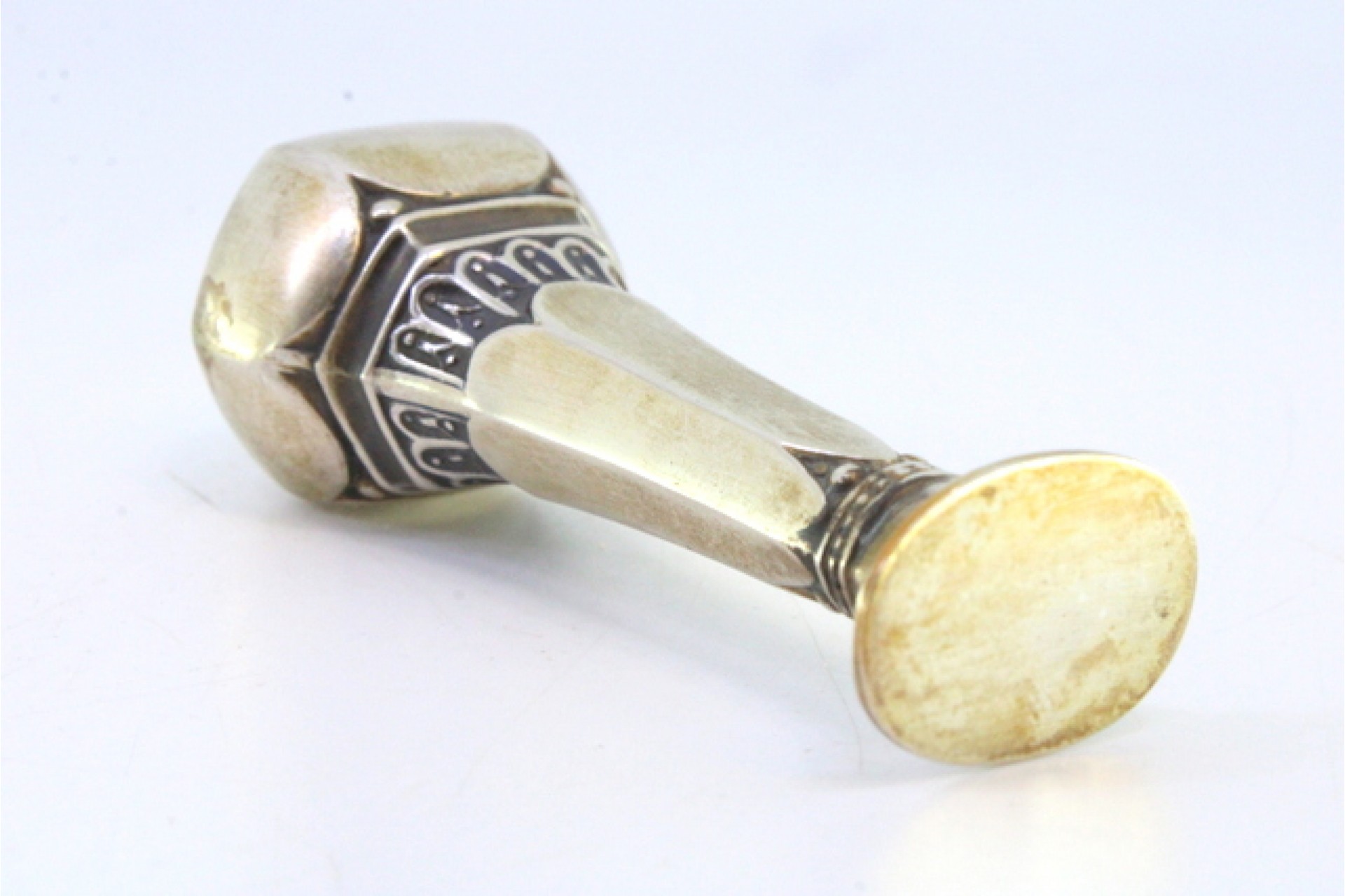 Sinete em prata com relevos e corpo sextavado.